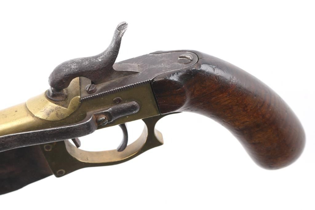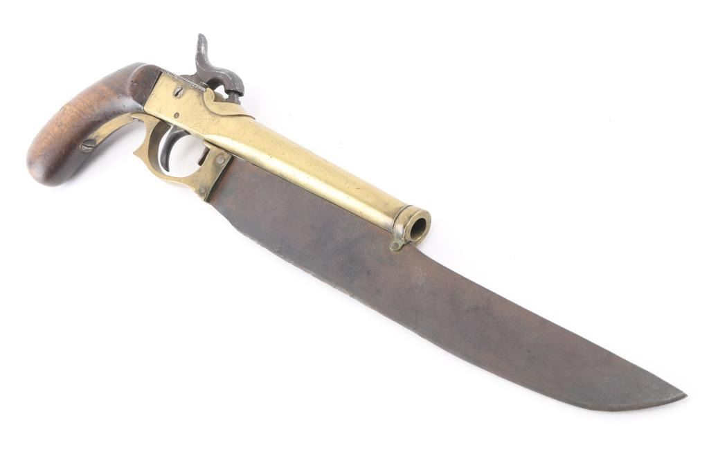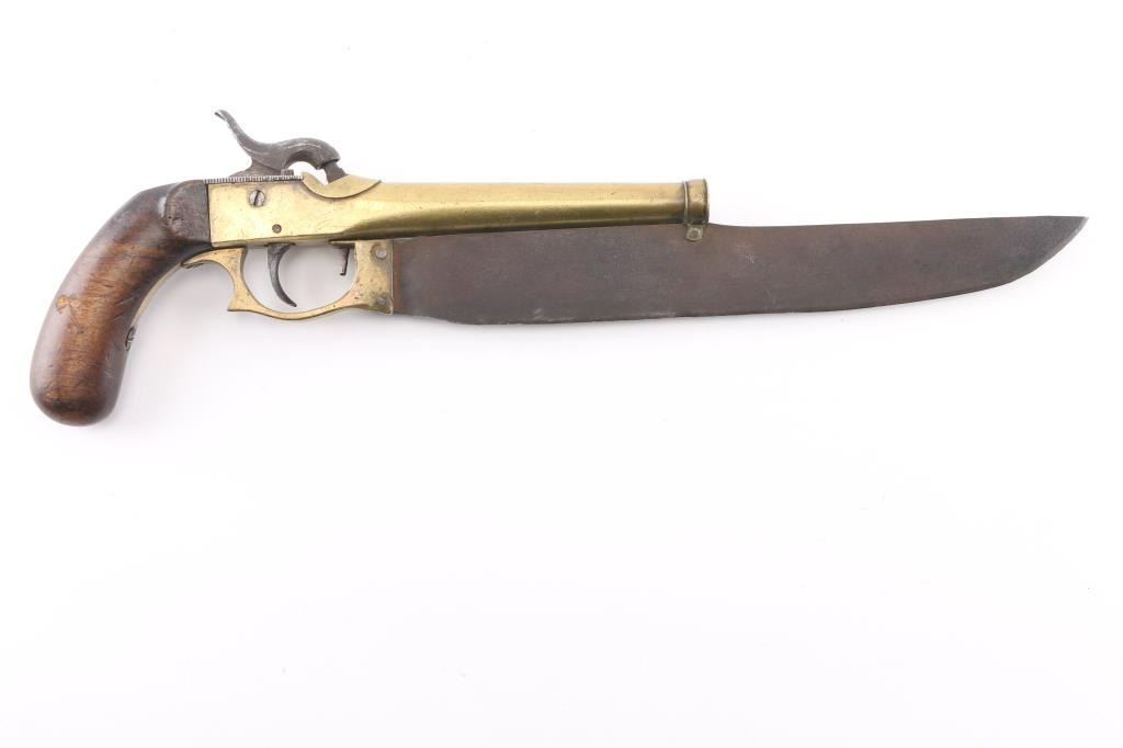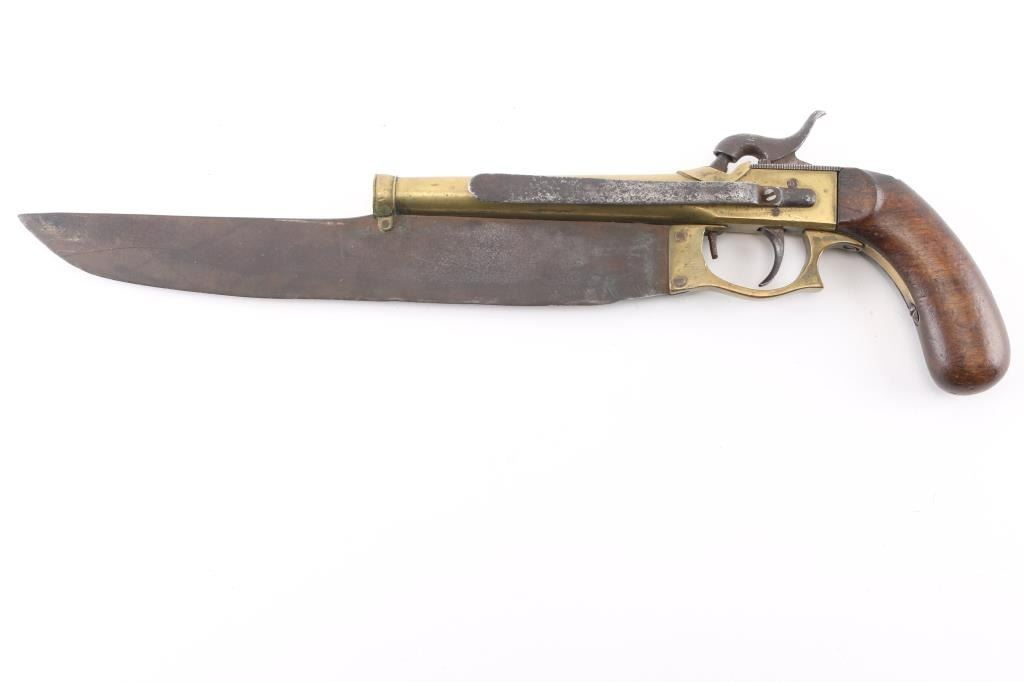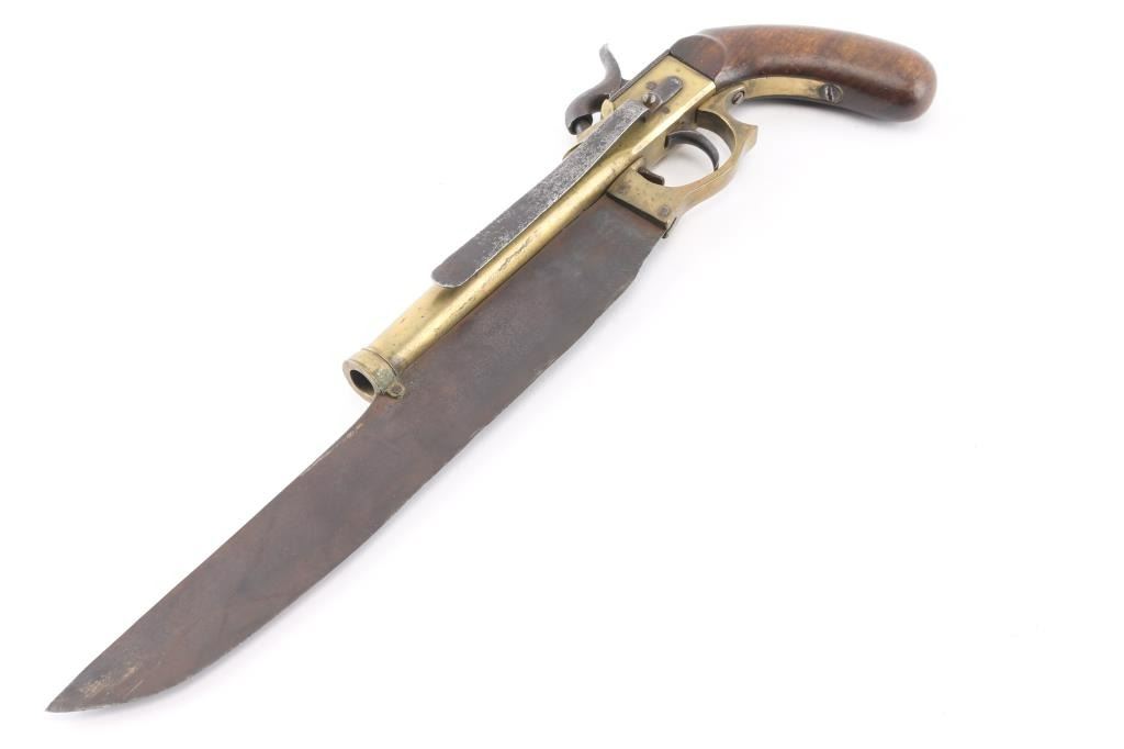 NVSN Antique Japanese boxlock single-shot percussion pistol approx. .43 Cal. Brass barrel and frame. 5.5" 'cannon' barrel, wood bag grips, belt hook mounted on the left frame. 10" clip-point blade attached to the barrel and frame in the style of Elgin. Although the blade and triggerguard show age it appears they were added to the the pistol at some point. Belt hook and hammer are pitted, the hammer does not hold at full cock, fires at half cock. Condition Poor (mechanical problem). *Antique Firearm*
