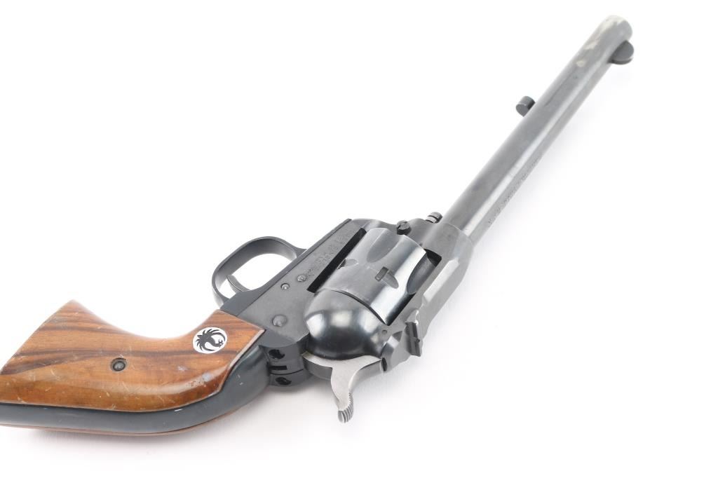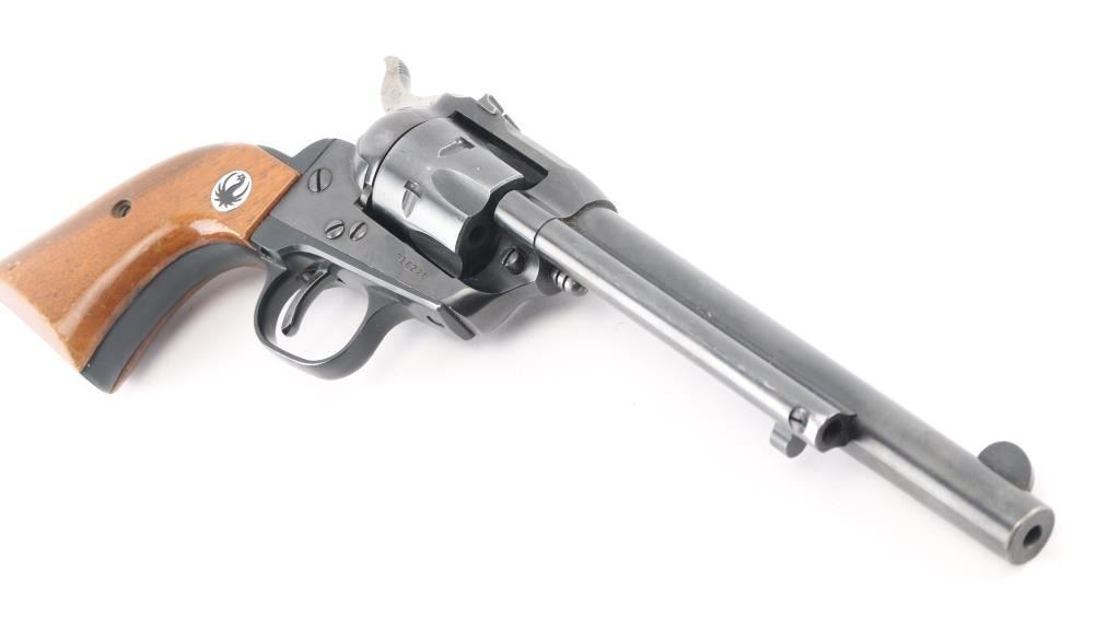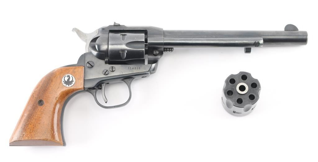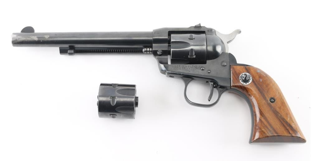 'Convertible' Single action magnum rimfire revolver manufactured circa 1960. Features blued finish, smooth wood grips with silver & black Ruger medallions, 6.5" barrel, blade front & dovetailed notch rear sights, six shot fluted cylinder, smooth trigger, serrated spur on hammer. Bore is very good condition. Retains 85% finish with edge losses, handling marks. Grips are very good with dings & dents. Includes both 22 WMR cylinder (installed) and 22 LR cylinder (in pouch), with a leather belt & holster rig. Condition is NRA Very Good+ *** C&R Firearm ***
