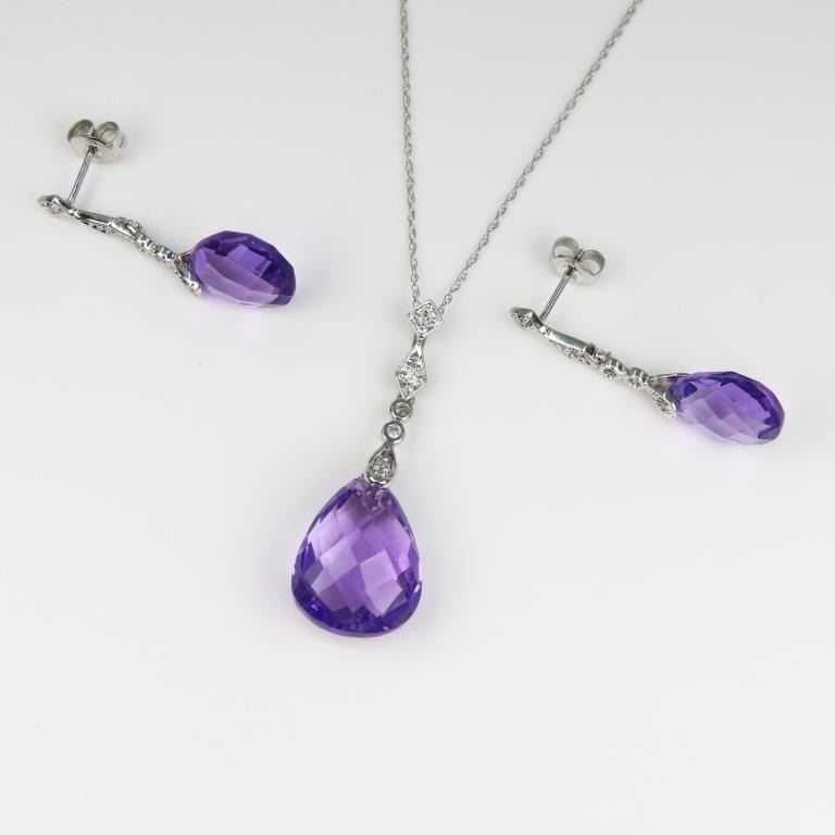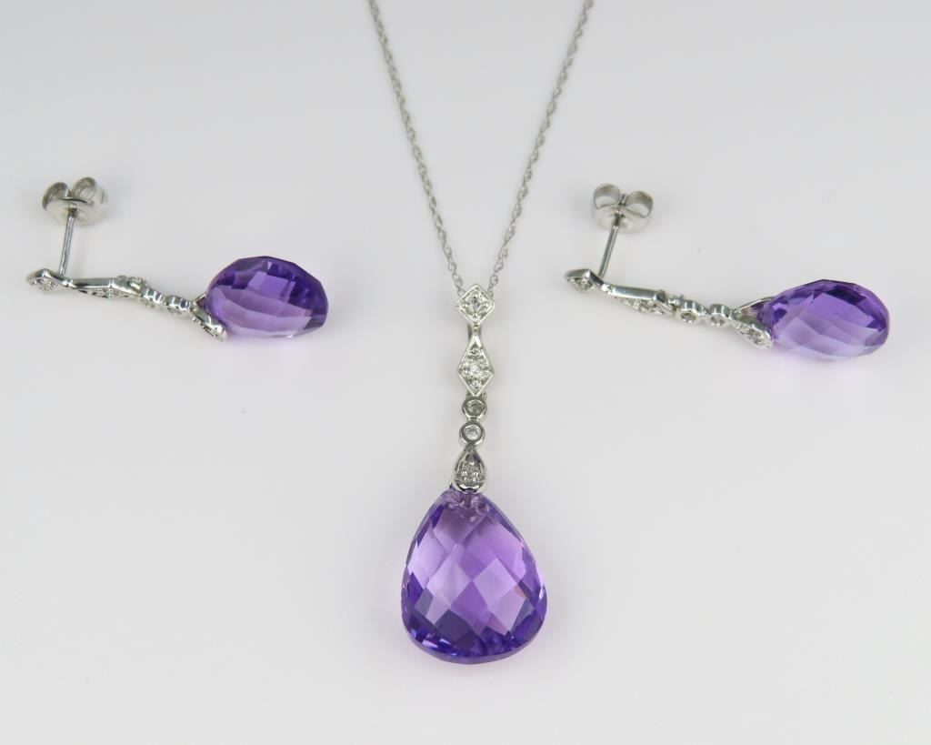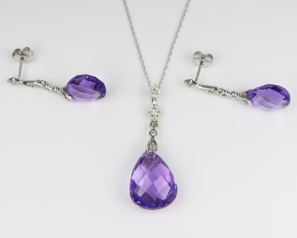 & Earring Ensemble featuring 3 briolette cut tear drop Amethyst weighing approx. 10.00-12.00 carats combined with 15 accent Diamonds set in 10 karat white gold settings.