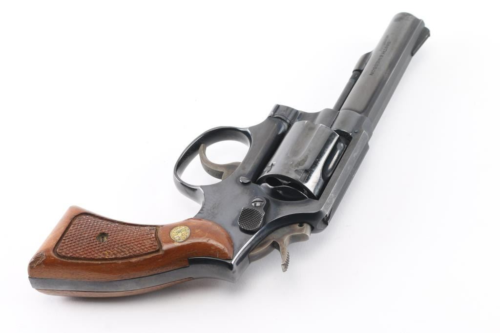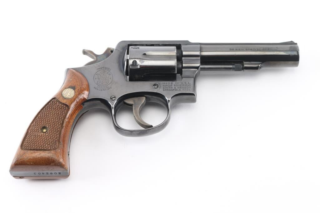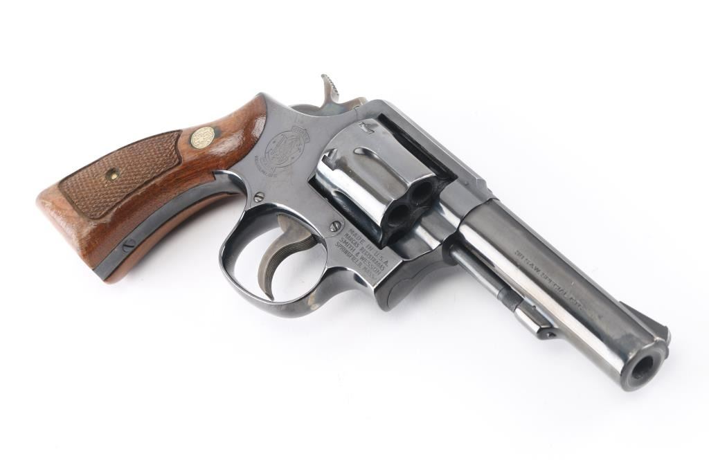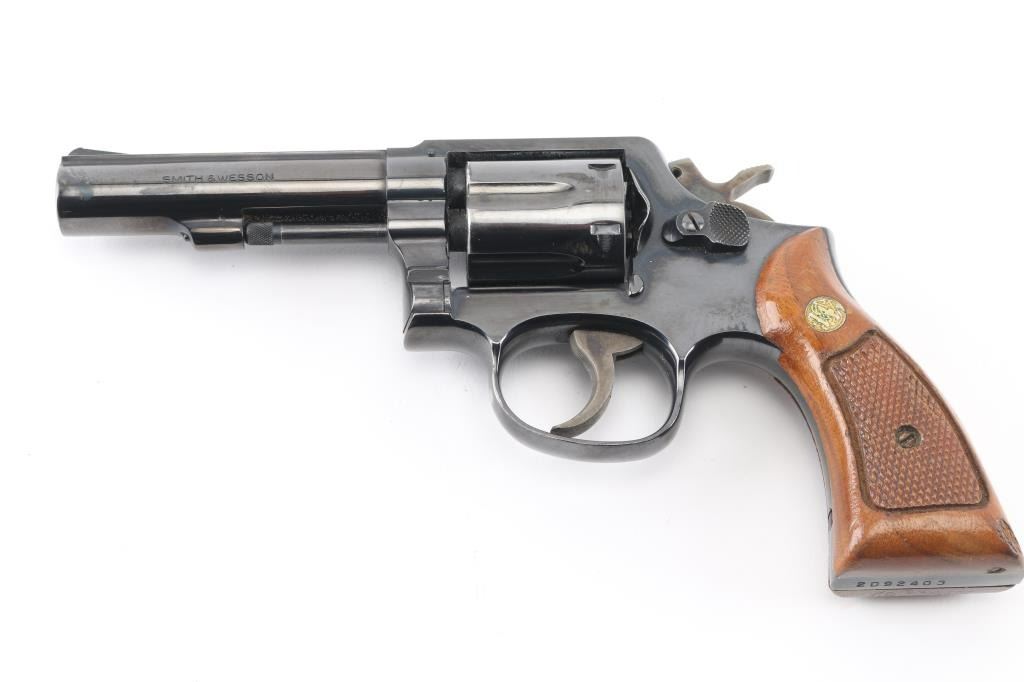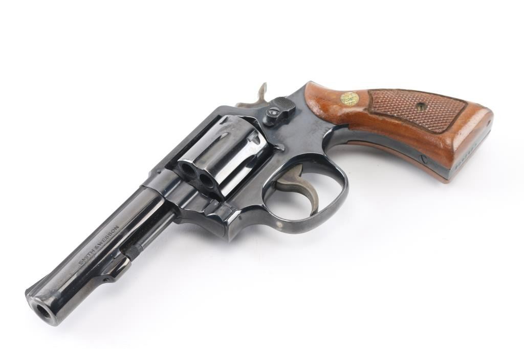 Medium frame double action revolver chambered in .38 Special, circa 1978. Features a blued finish, pinned 4" heavy barrel with matted sighting rib, ramp front sight, square notched rear sight, non-shrouded ejector rod, fluted six-shot cylinder, serrated trigger, knurled hammer spur, square butt service K frame, and two-piece checkered wood Magna grips with S&W medallions. Bore and charge holes are very good condition. Retains 90% finish with holster wear, edge losses, handling marks from duty use. Action is hesitant, with tight lock-up, feels like it is packed with dried grease. Condition is NRA Very Good *** Modern Firearm ***