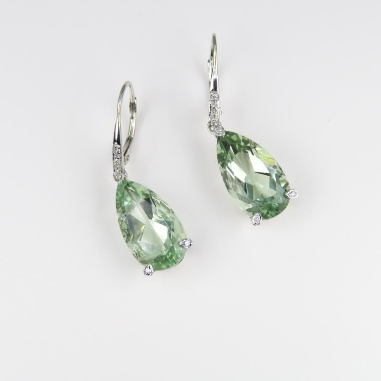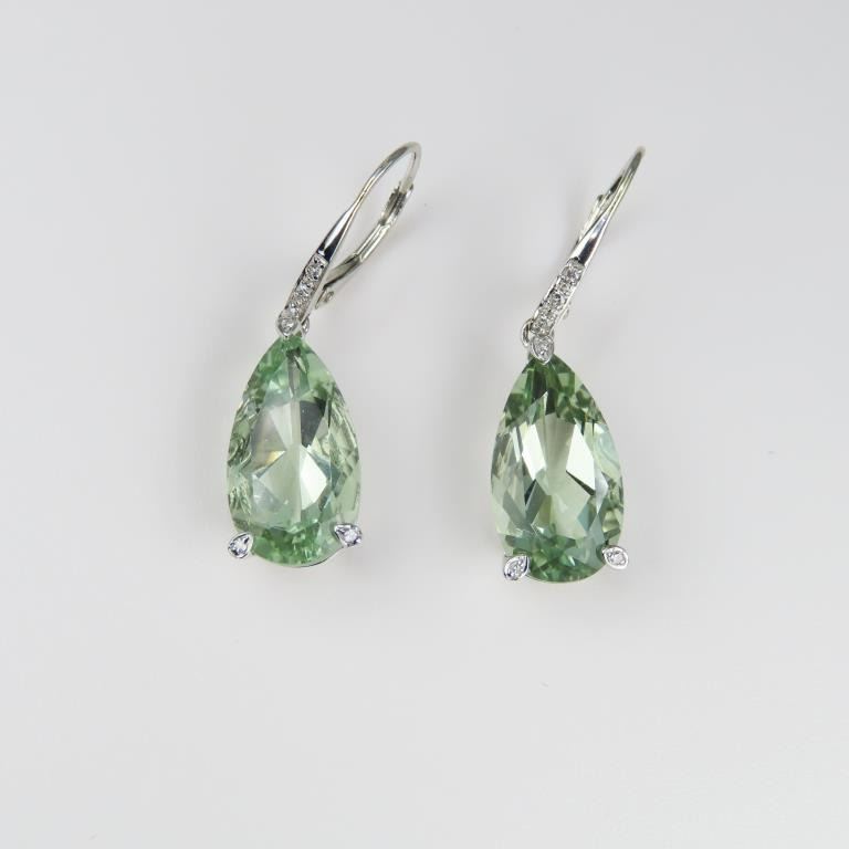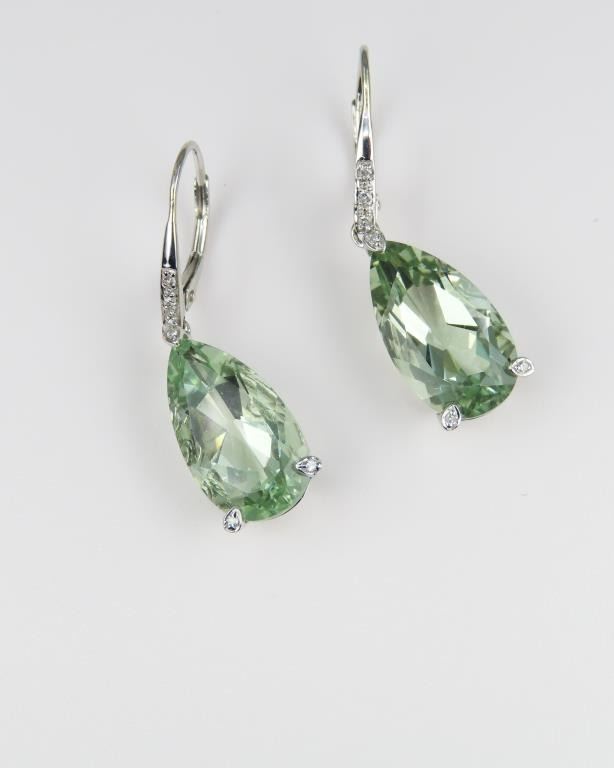 Drop Earrings featuring 2 pear shaped green Amethyst weighing approx. 12.00 carats total set in 10 karat white gold.