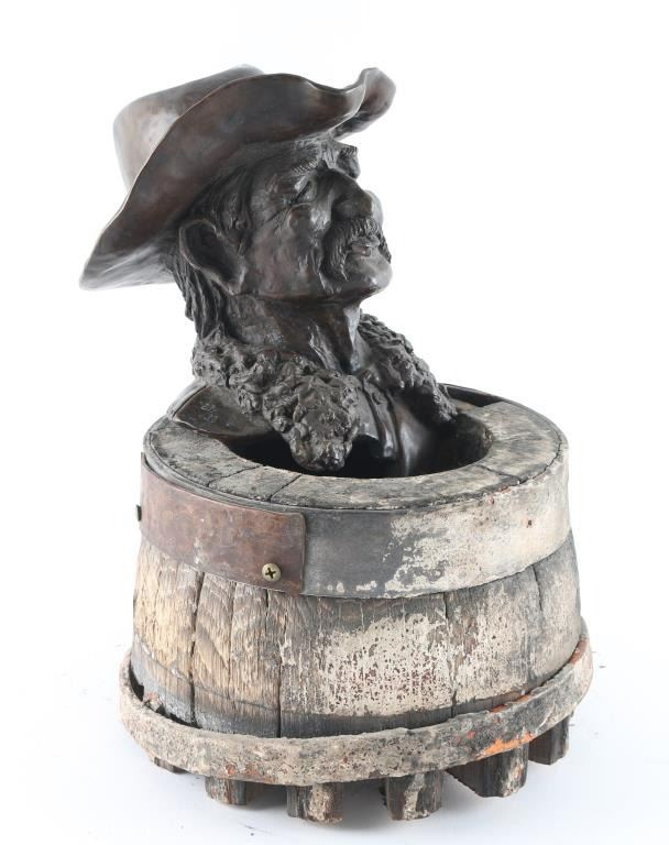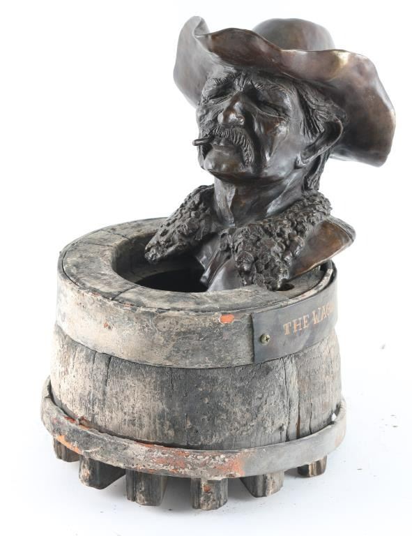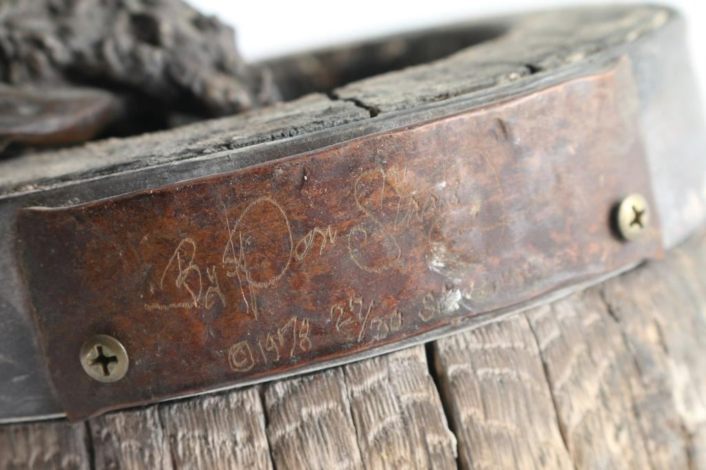 By Don Staats, entitled "The Wagon Boss" numbered 23/30, dated 1978. Depicting cowboy with a cigar, Local Artist from "Skull Valley". Measures 12x7" Mounted on old wagon wheel. Base of wheel is cracked