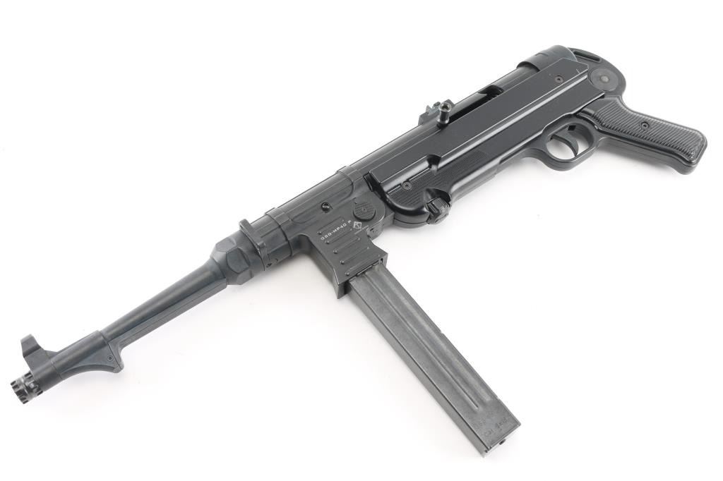 German semiautomatic pistol imported by ATI, Summerville SC. Made to look nearly identical to the WWII MP40, although with no stock. Features black and dark gray finish, some polymer pieces, 10" threaded barrel with muzzle nut, protected post front sight, notch rear sight with one standing and one folding leaf, pushbutton magazine release, rotating safety under forend, sling slots. Condition is like new with minor handling marks. Includes one magazine (capacity is approx 25 rounds), manual, different front sights. Condition is NRA Excellent *** Modern Firearm ***