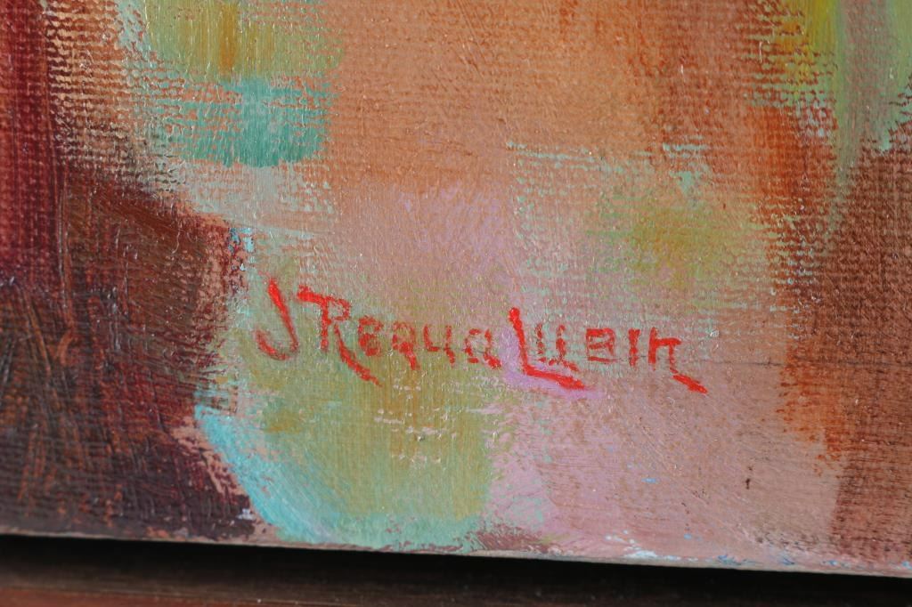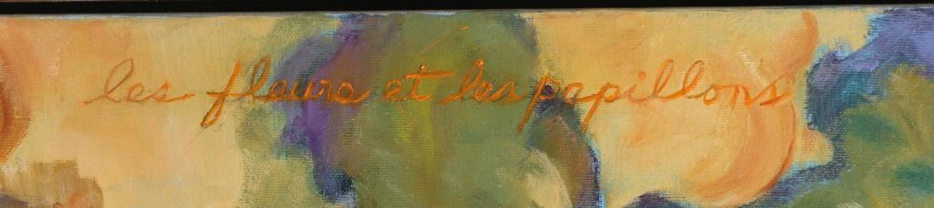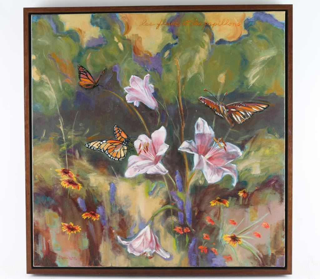 Entitled "Les Fleurs et Les Papillons" done by Arizona artist "Jean Requa Lubin" depicting lily flowers and butterflies. Signed lower left corner. Unframed measuring 24"x24".