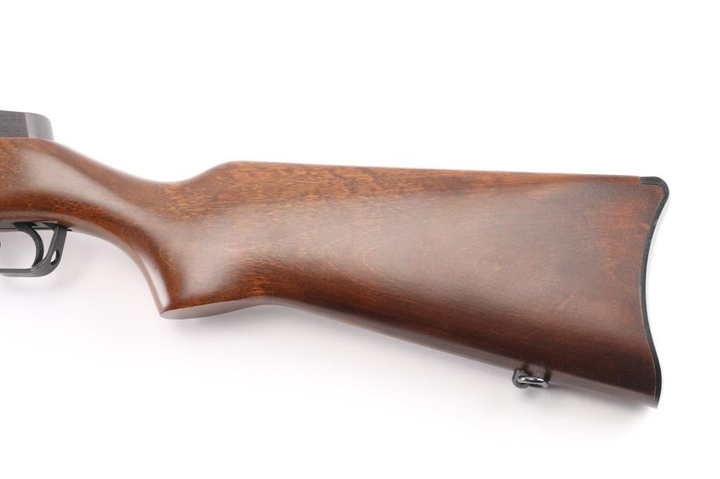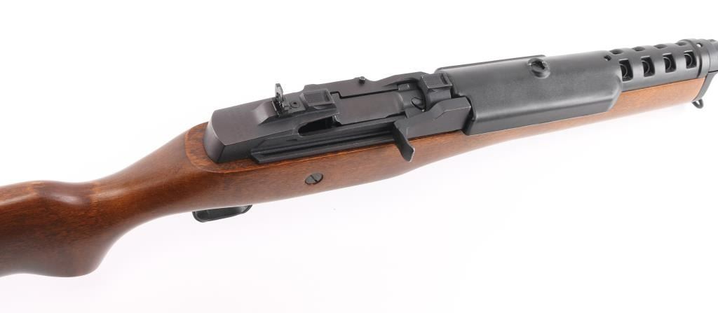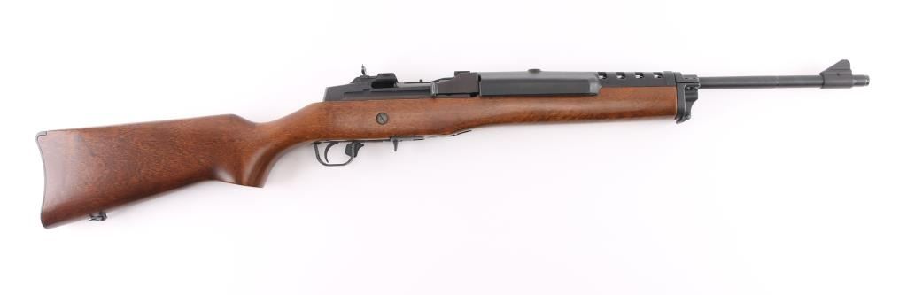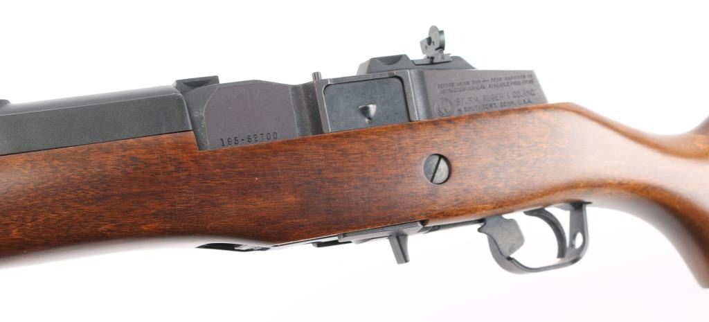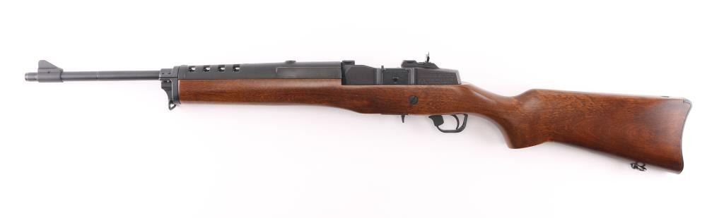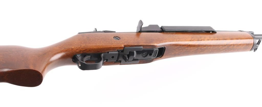 Semiautomatic rifle features blued finish, smooth wood stock, black polymer handguard, 18" barrel, blade front sight, folding adjustable peep rear sight, manual safety, sling swivels, plastic butt plate, dovetail scallop cuts on top of receiver. Bore is very good condition. Retains 95% blued finish with handling marks. Stock is near perfect with few scratches. Includes (1) Ruger 5 round magazine. Condition is NRA Excellent *** Modern Firearm ***