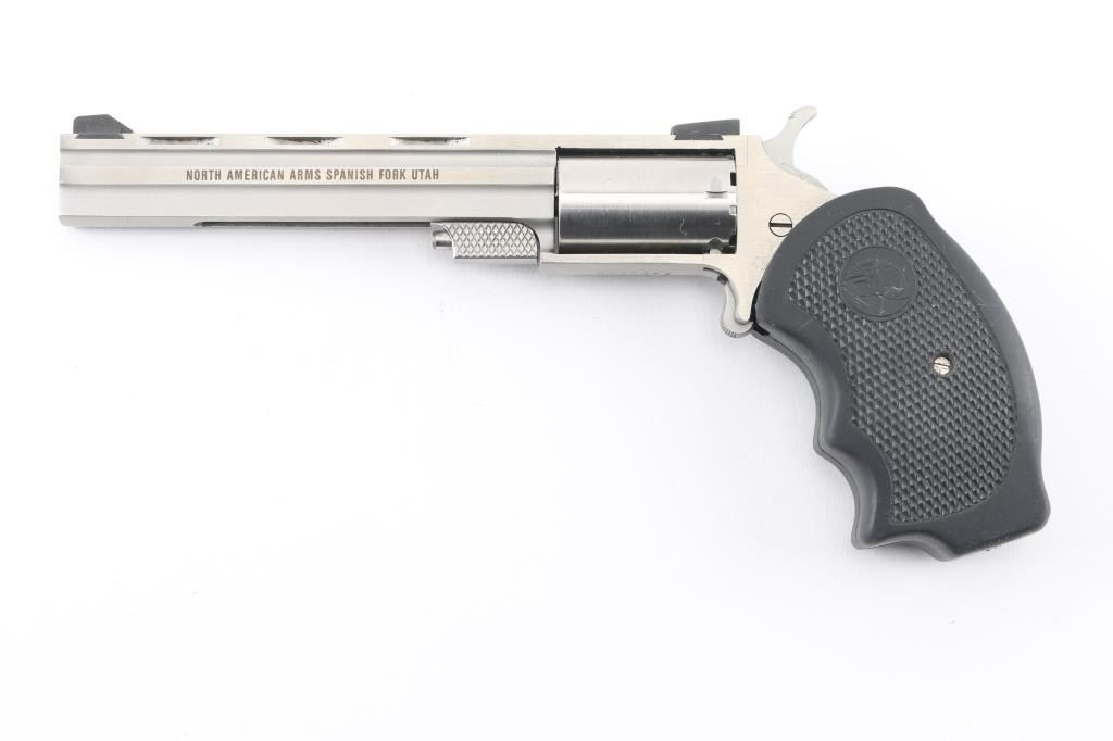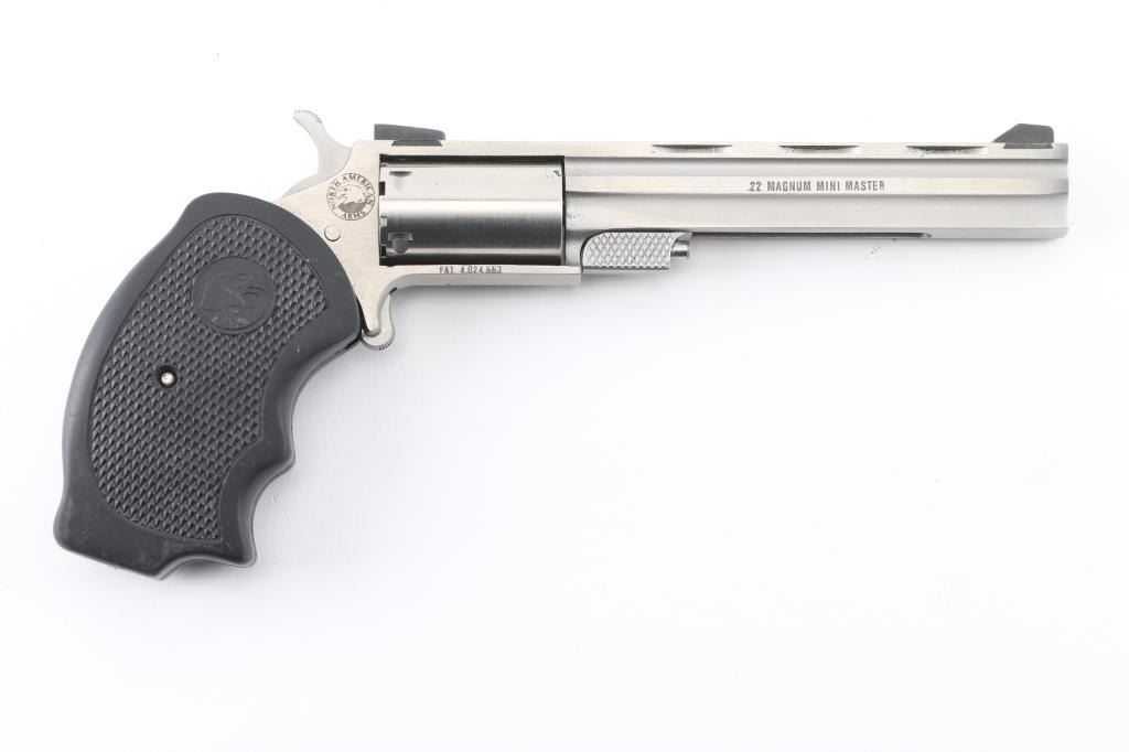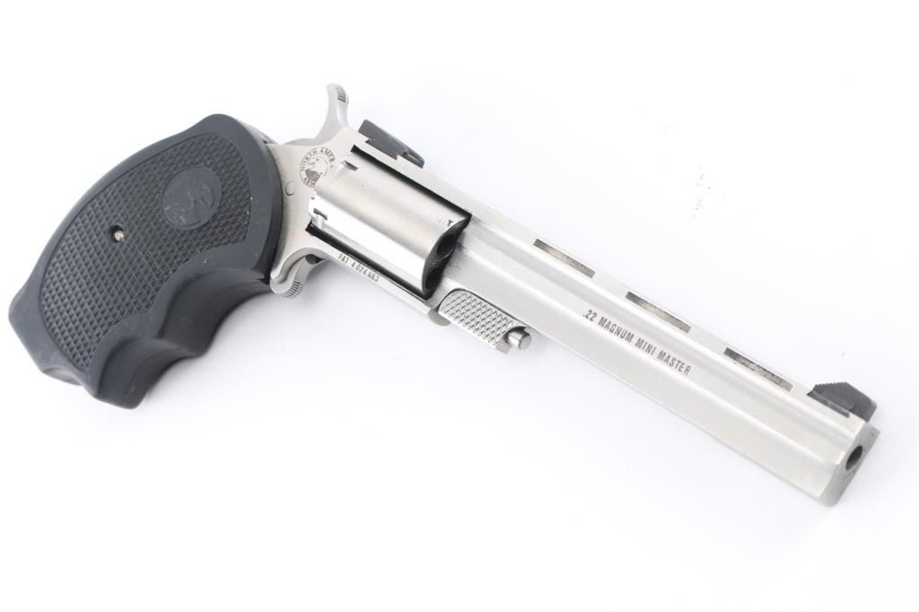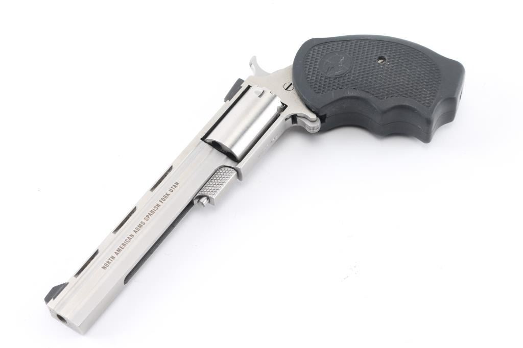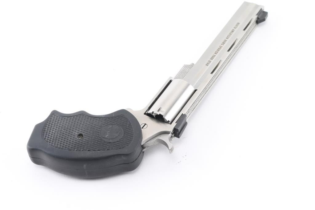 SN: MMT7074 Single action rimfire revolver features stainless steel construction, 4" ribbed barrel with full length underlug, dovetailed mounted blade & notch sights, 5 shot un-fluted cylinder, spur trigger, oversized checkered black polymer grips. Cylinder is removed to load or unload. Bore is very good condition. Overall condition is excellent with minor handling marks. Action is smooth with good lock up. Condition is NRA Excellent *** Modern Firearm ***