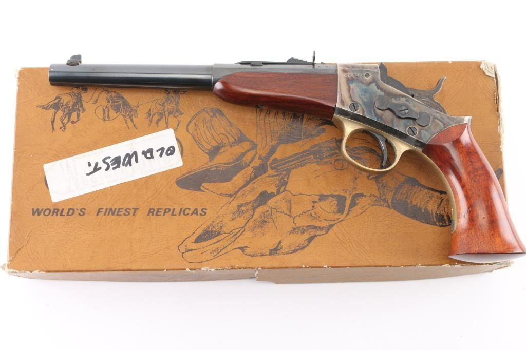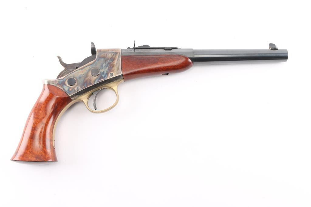 Sn: 11174 Italian made reproduction of the Remington Model 1871 Rolling Block Pistol, proof dated 1996. Single shot target pistol. Blued 9.5" half-octagonal half-round barrel, blade front & sporting rear sights. Case colored receiver with walnut grip and forearm. Brass trigger guard. Bore is very good condition. Overall excellent condition with handling marks, bright fiery case color, mellowing of brass color. Includes fair condition factory box (not numbered to this gun). Condition is NRA Excellent *** Modern Firearm ***