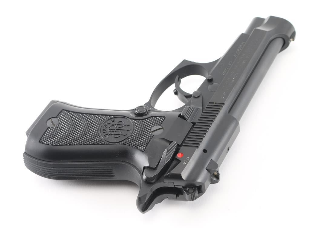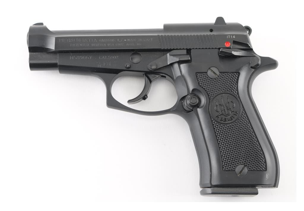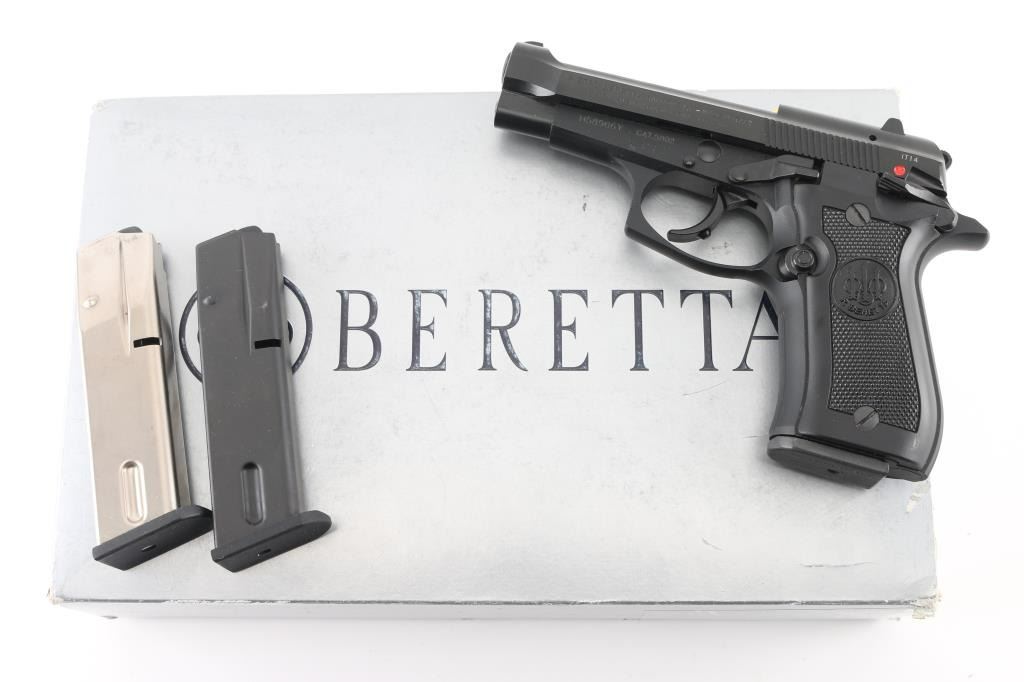 Italian semiautomatic pistol imported by Beretta USA Corp, Accokeek MD. Features matte blued finish, black plastic checkered grips, 3.8" barrel, fixed sights, frame mounted safety/decocker, magazine disconnect safety, operates double and single action. Bore is very good condition, hard chrome lined. Retains 98% finish on metal parts with few handling marks. Grips are in excellent condition. Includes factory hard plastic case with cardboard sleeve, manual, two spare magazines (total of 2 blued & one nickel finished mags). Condition is NRA Excellent - like new *** Modern Firearm ***