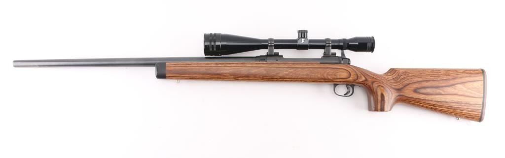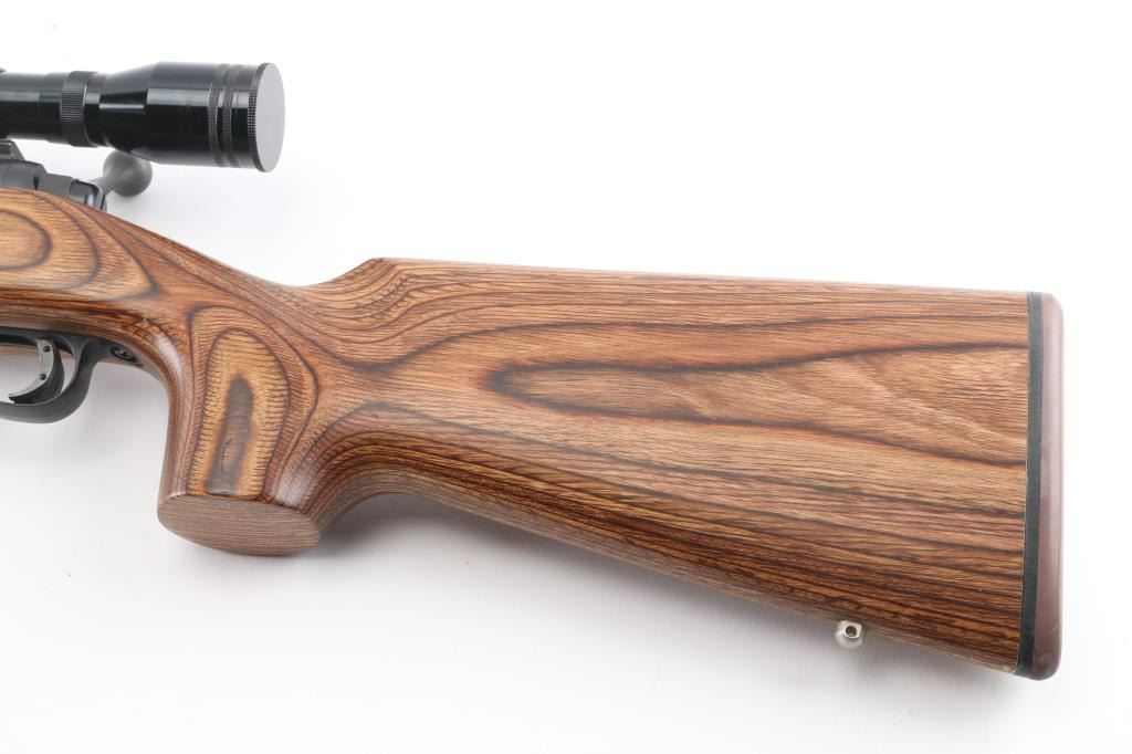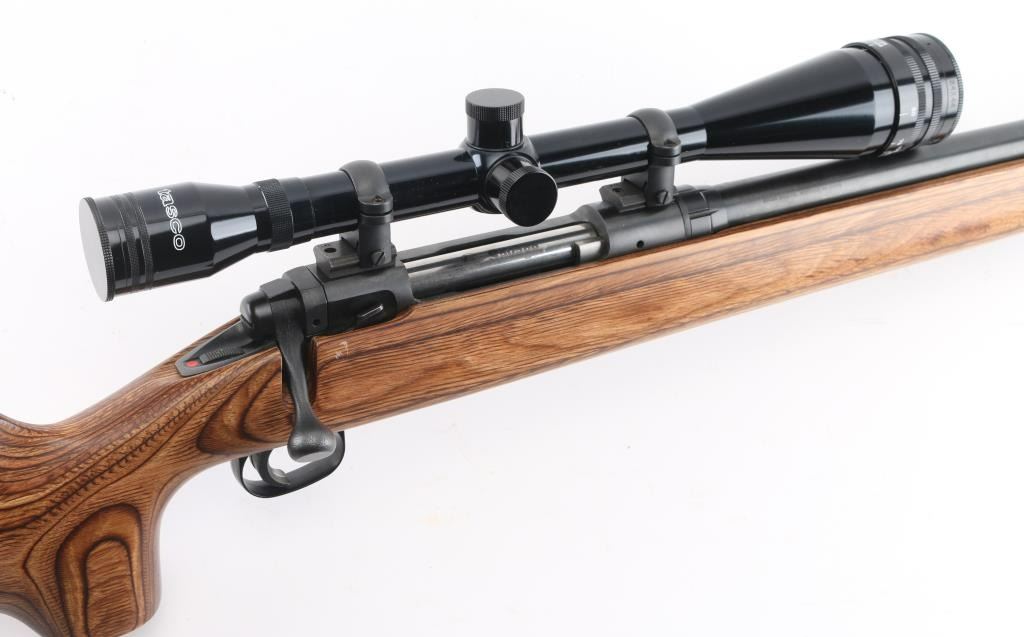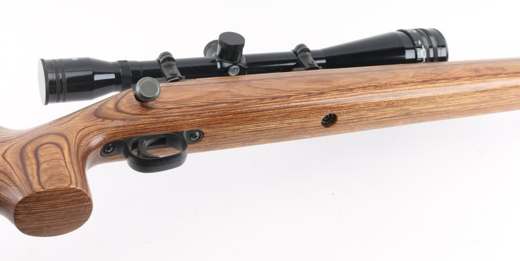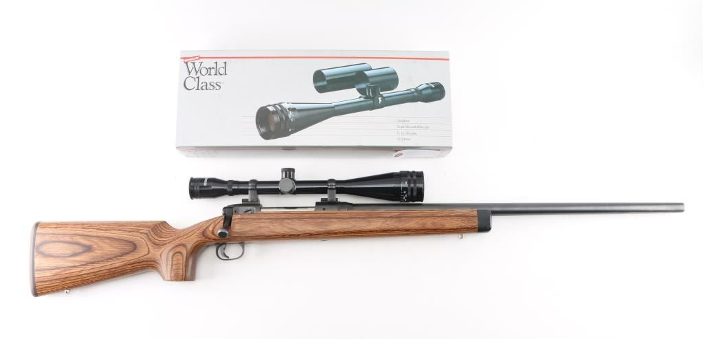 Bolt action rifle features blued finish, brown wood laminate stock with contrasting dark color forend tip, 26" medium-heavy contour barrel, blind magazine, manual safety, sling studs, thin rubber butt pad, blued Weaver two piece bases with rings. Mounts a Tasco World Class 24x44mm 'Target Silhouette Riflescope' with fine cross hairs & center dot reticle, adjustable objective. Bore is very good condition. Retains 95% finish with minor scuffs, other handling marks. Stock is excellent. Scope is very good condition with bright clear view. Includes original box for the scope, with two extended sunshades. Condition is NRA Excellent *** Modern Firearm ***