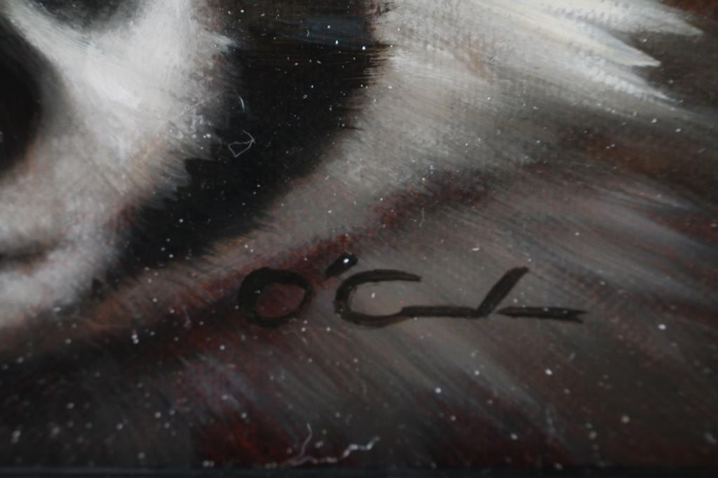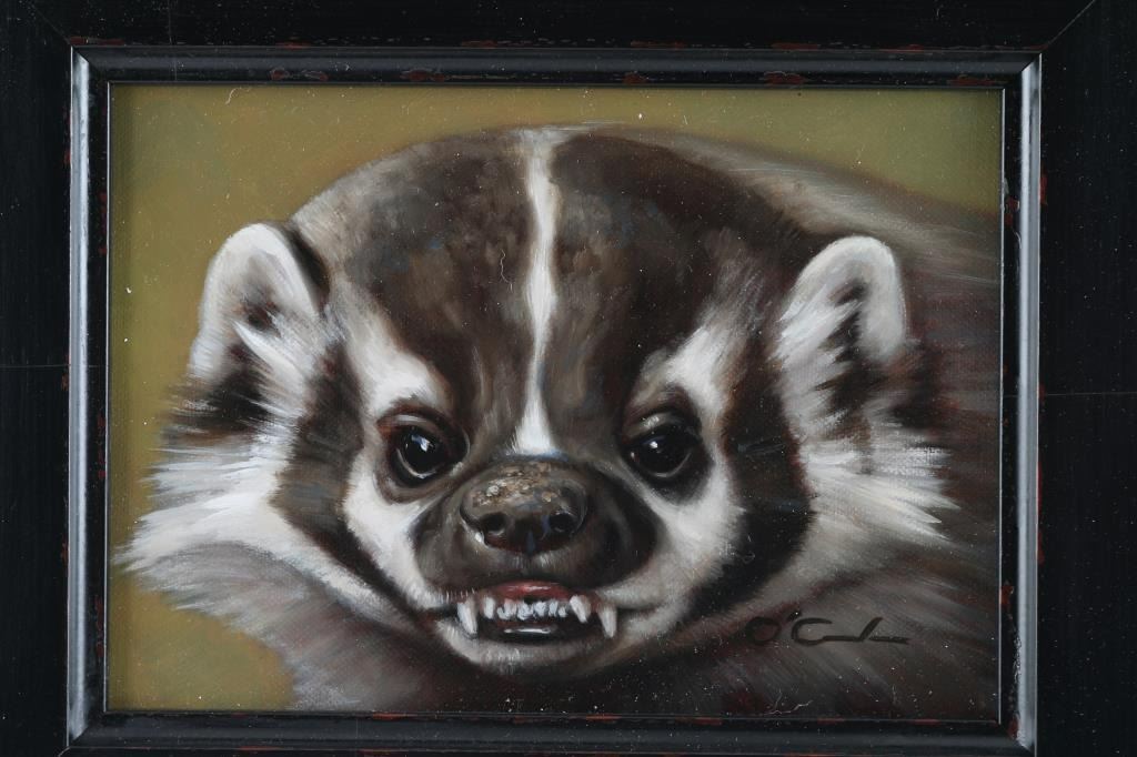 By Jennifer O'Cualain entitled American Hunter depicts the cutest badger face, hand signed, measures 7"x5".In black wood frame. Jennifer O’Cualain is a prolific painter of all things natural. Her popular wildlife paintings touch on the idea of illustrating the simple and honest physical characteristics of many species ranging from field mice to bison.“I strive to make my paintings more like portraits than typical animal art. The feel of fur under your hand is a relatively universal goal, but I want my viewer to get a sense of the individual animal.”