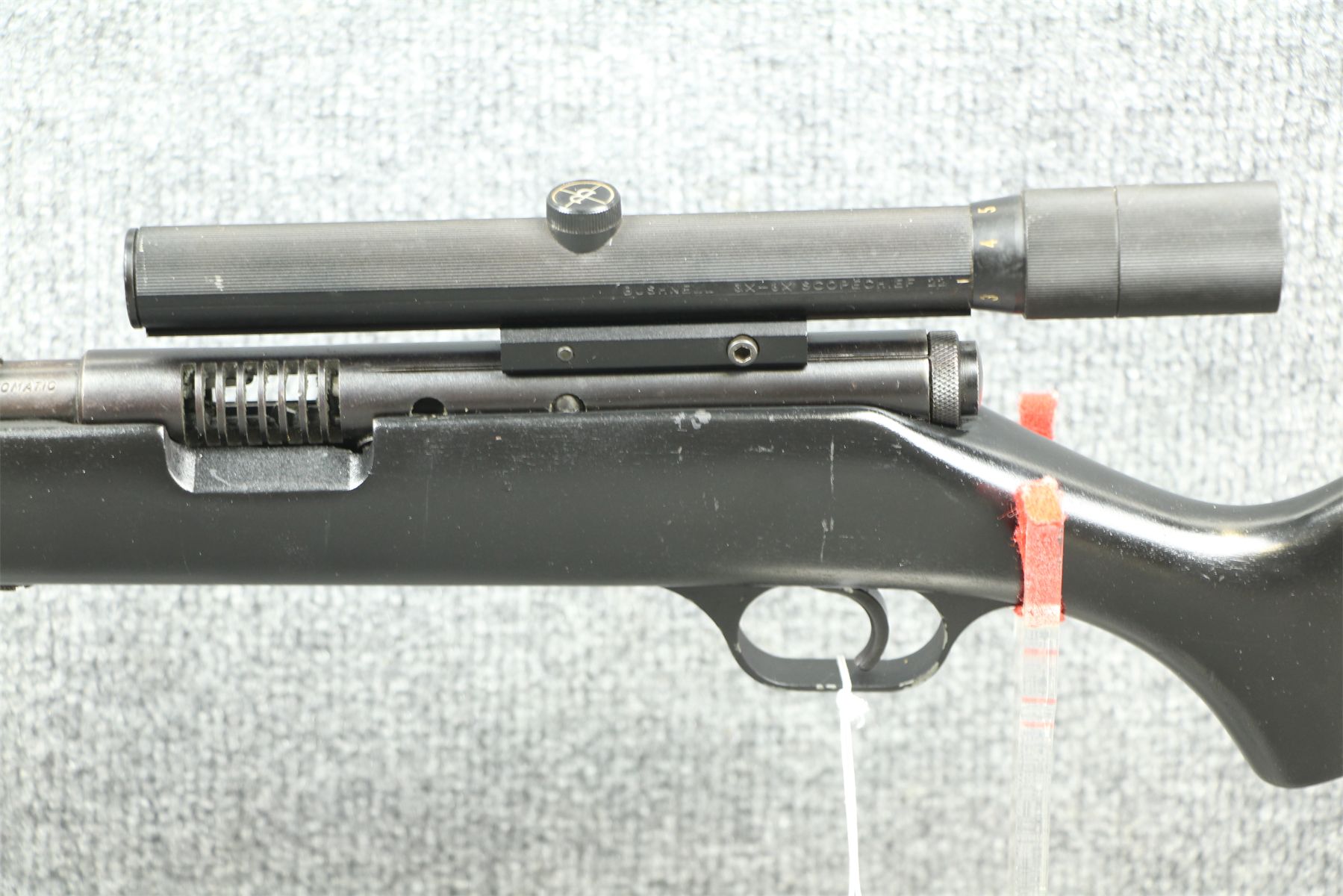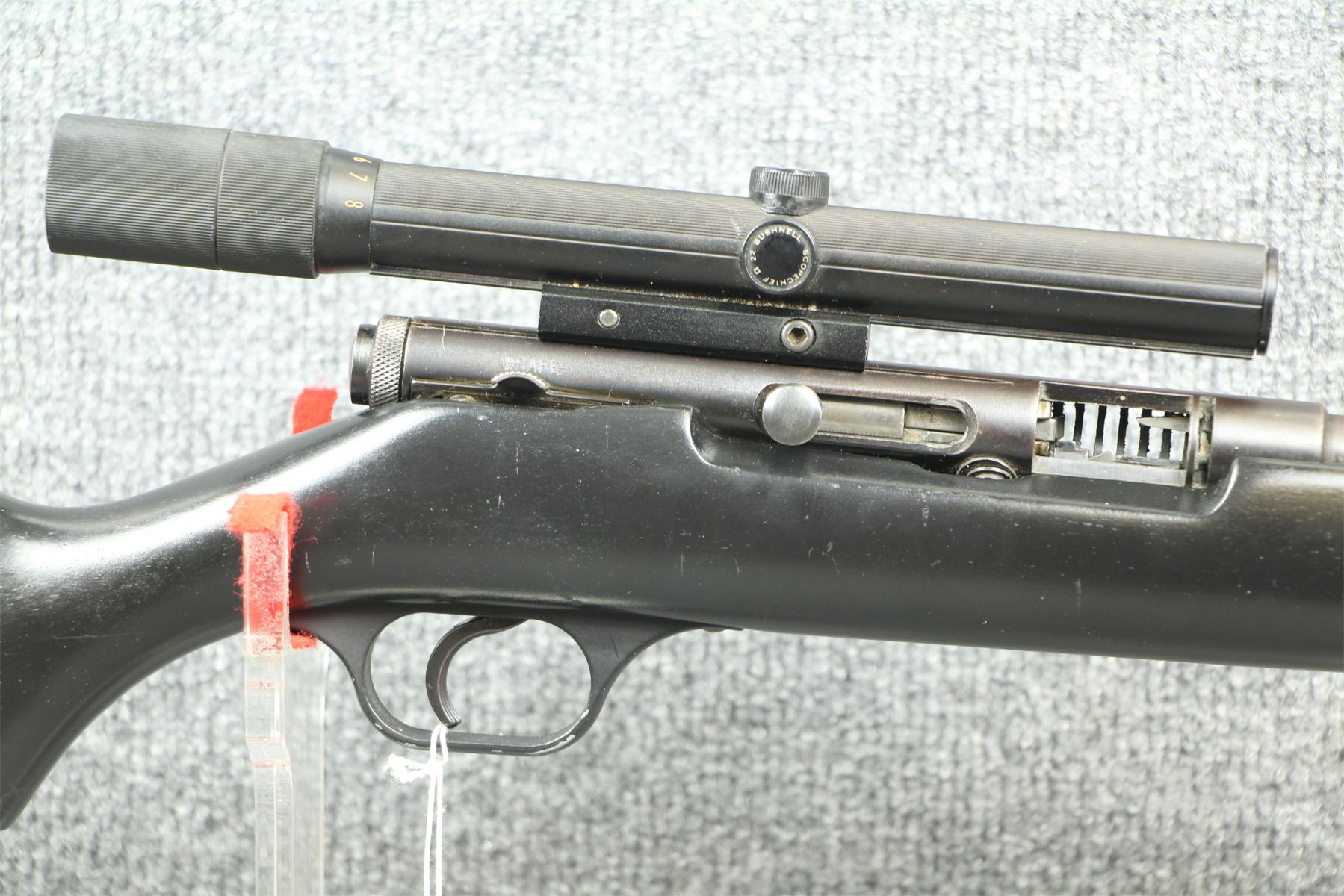 Nice tube fed plinker. Bushnell 3-8x scope. Some shallow rust blotches on the barrel and tube. Tube has no dents. Refinished stock.