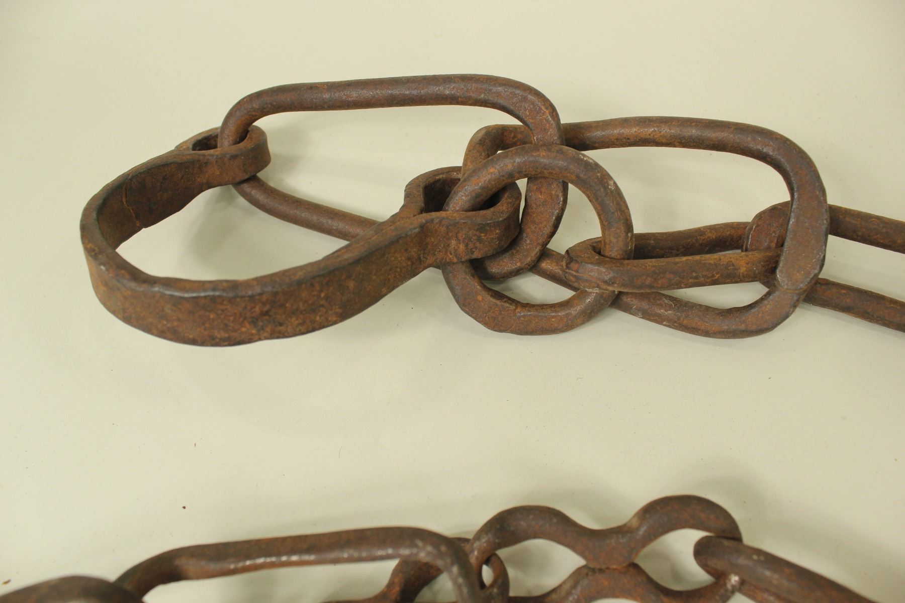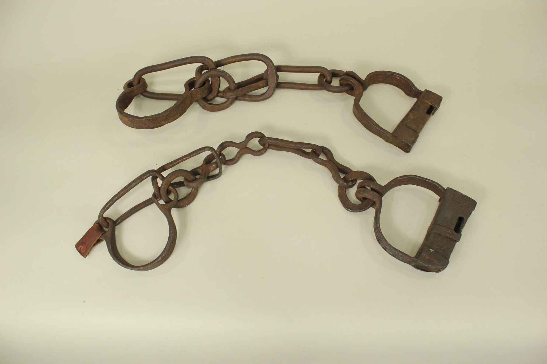 Two pairs of hand made wrought iron leg shackles with heavy chain.