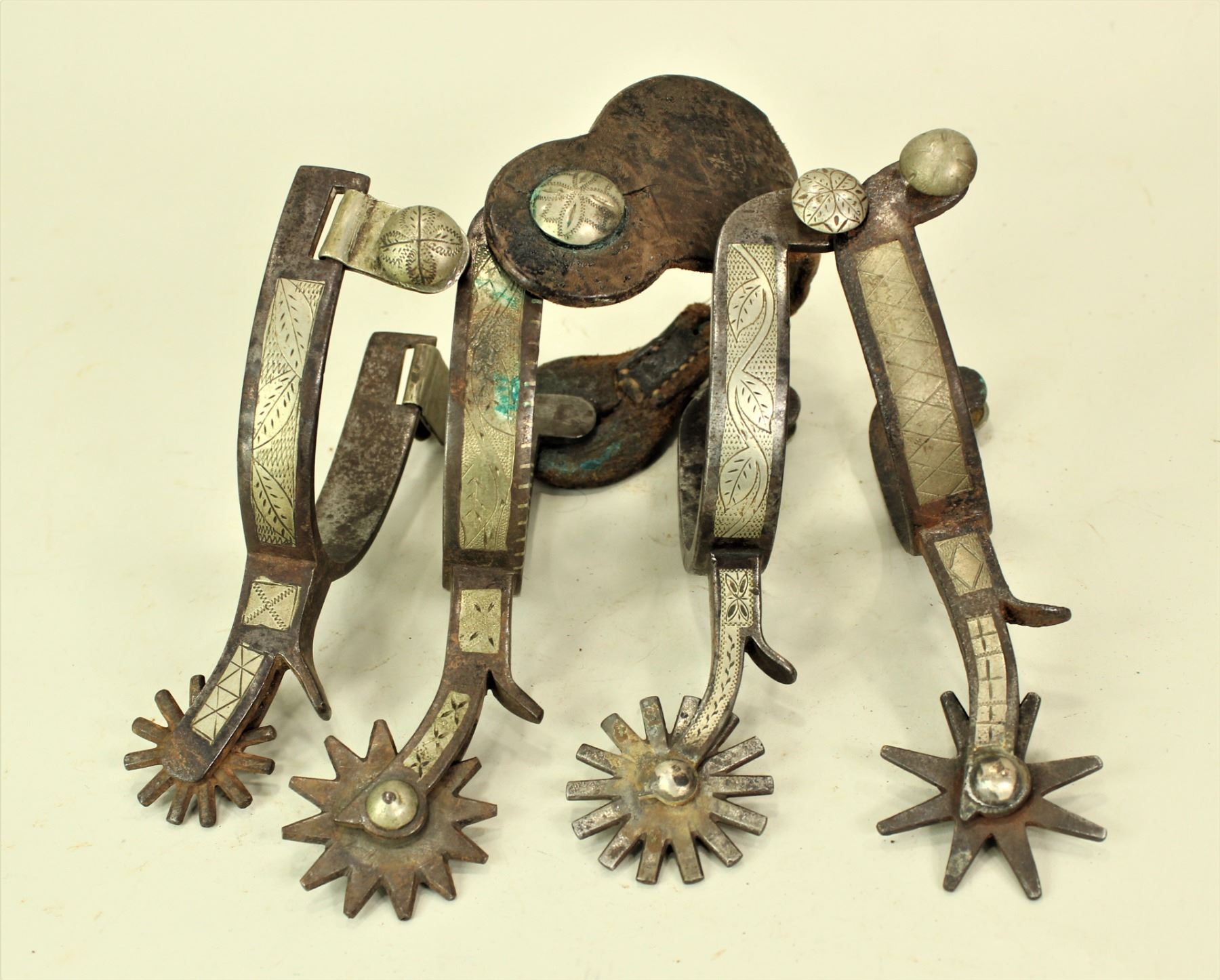 A group of 4 single Canon City Prison spurs, each displaying classic patterns of Canon City engraving.