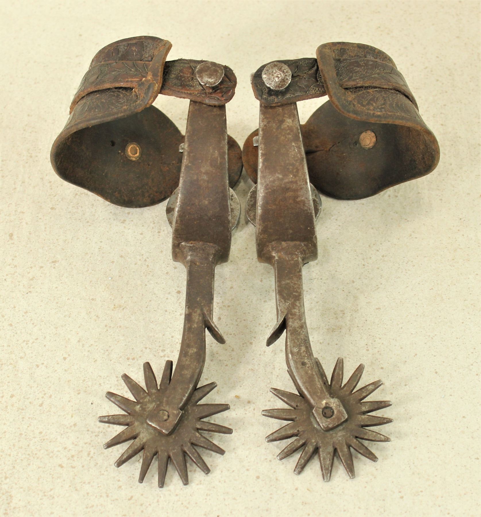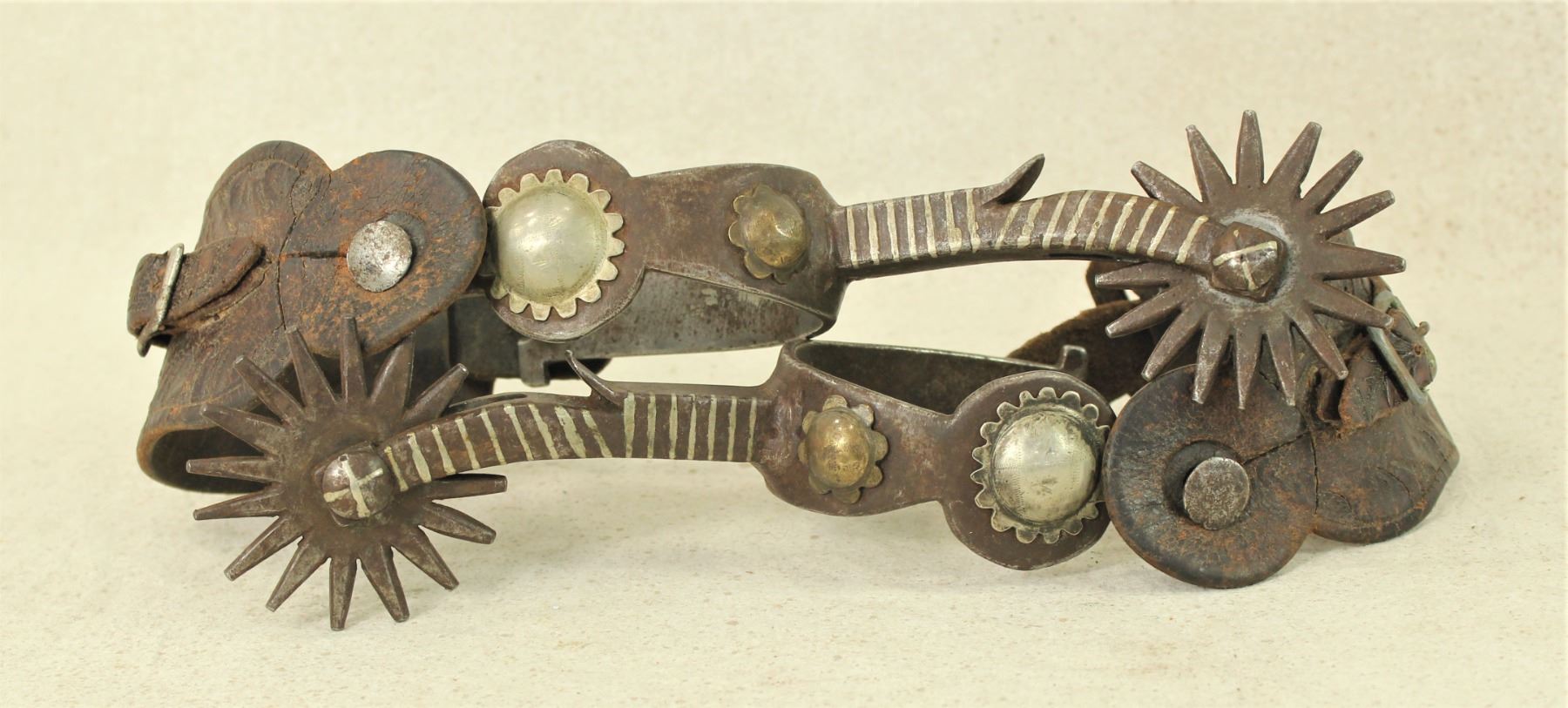 A massive pair of single mounted spurs with scalloped heelbands, elongated silver stiped shanks and huge rowels. Completed by original straps.