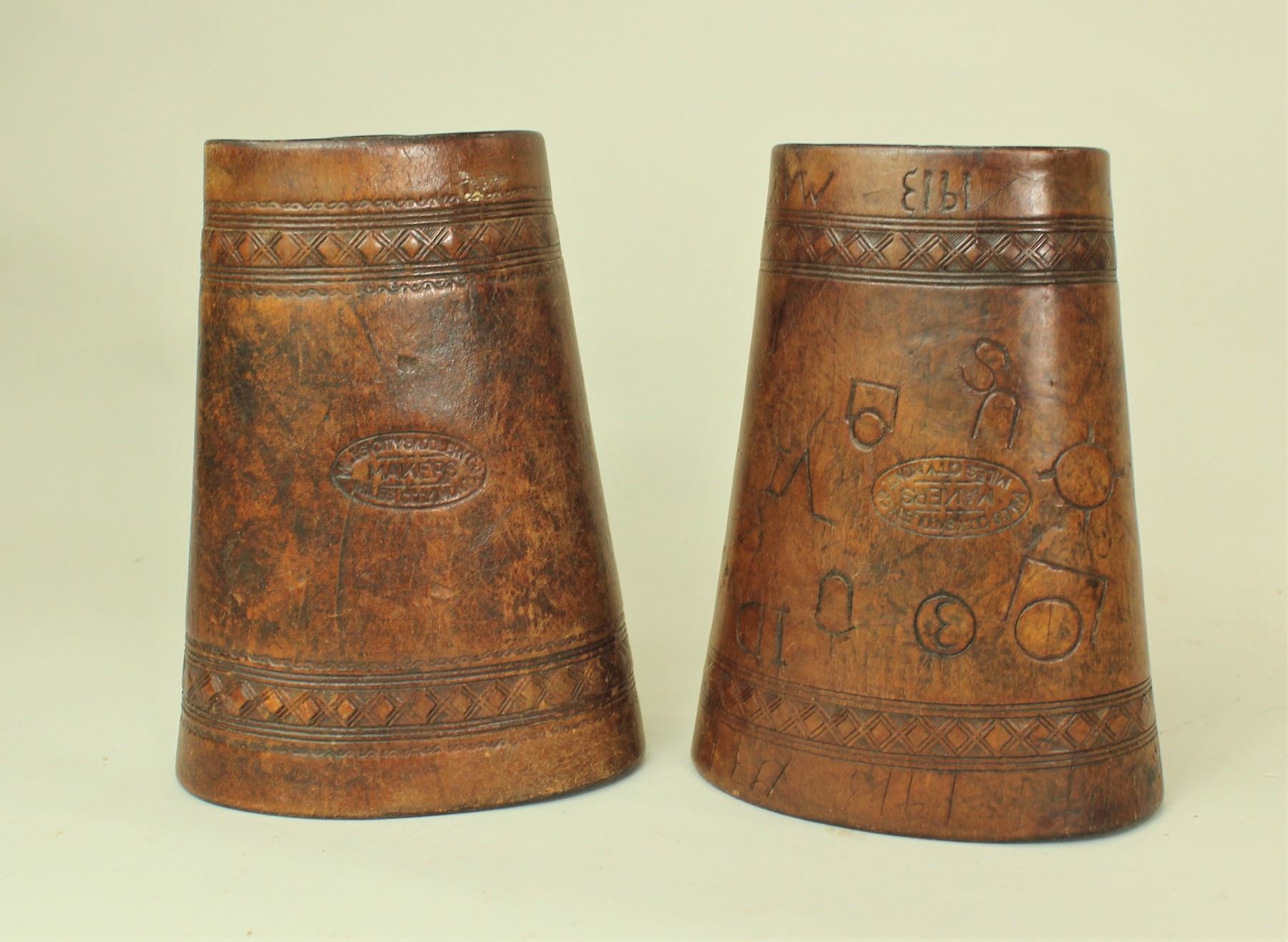 A pair of cowboy cuffs with great condition, rich color, maker's marks, and character, with carved ranch brands and 1913 date.