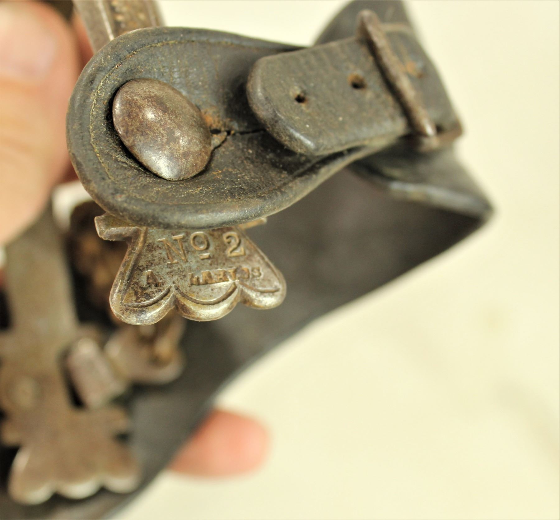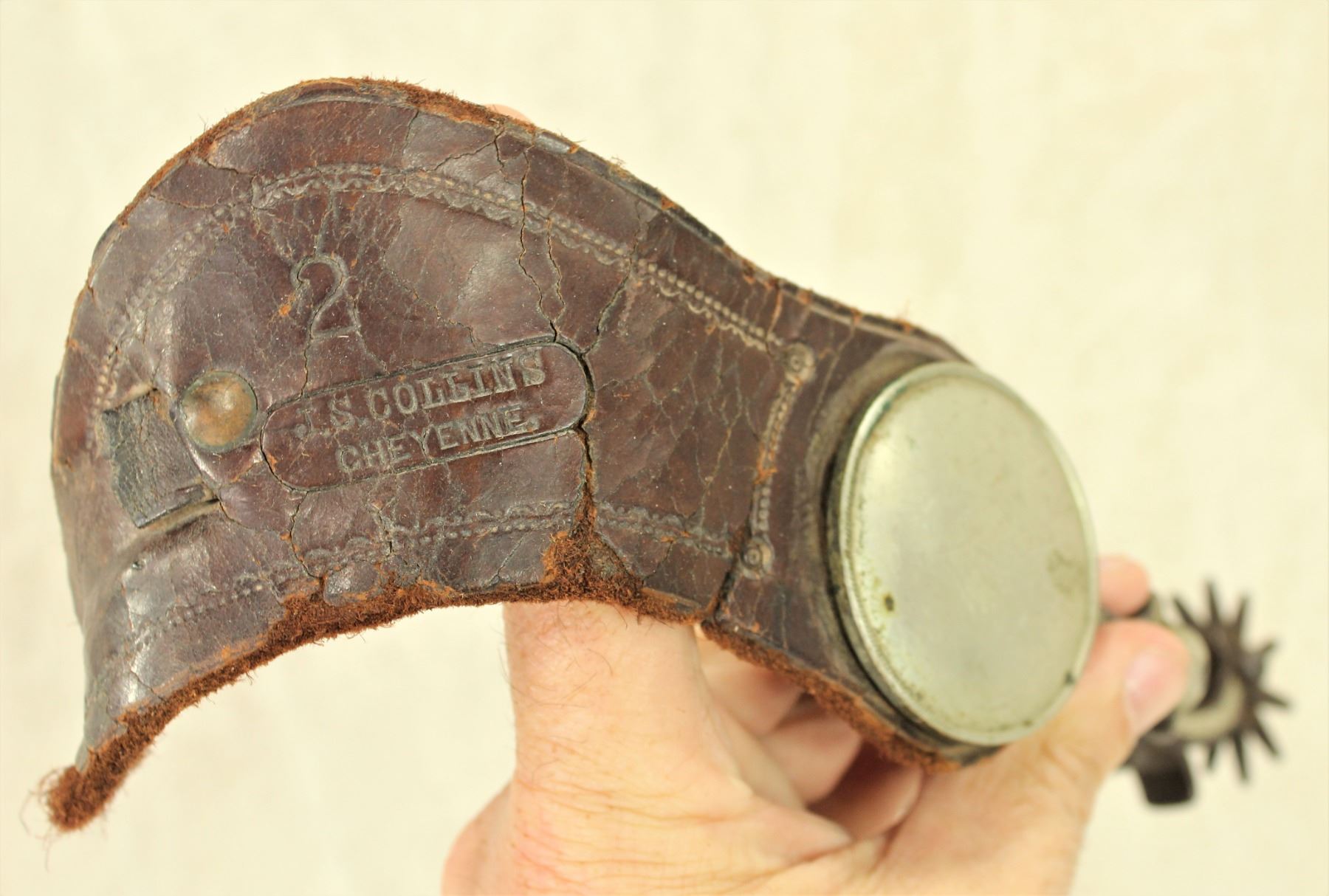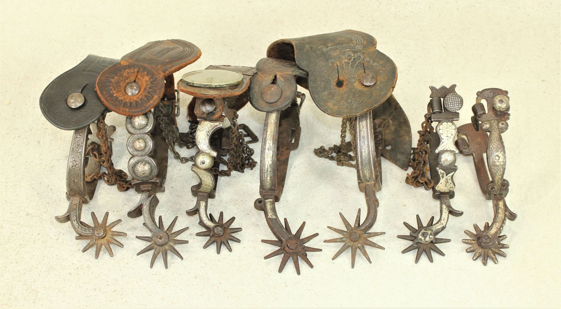 A fantastic grouping of seven early silver inlaid California style spurs that include a Larios marked spur as well as 3 rare Wyoming marked straps.