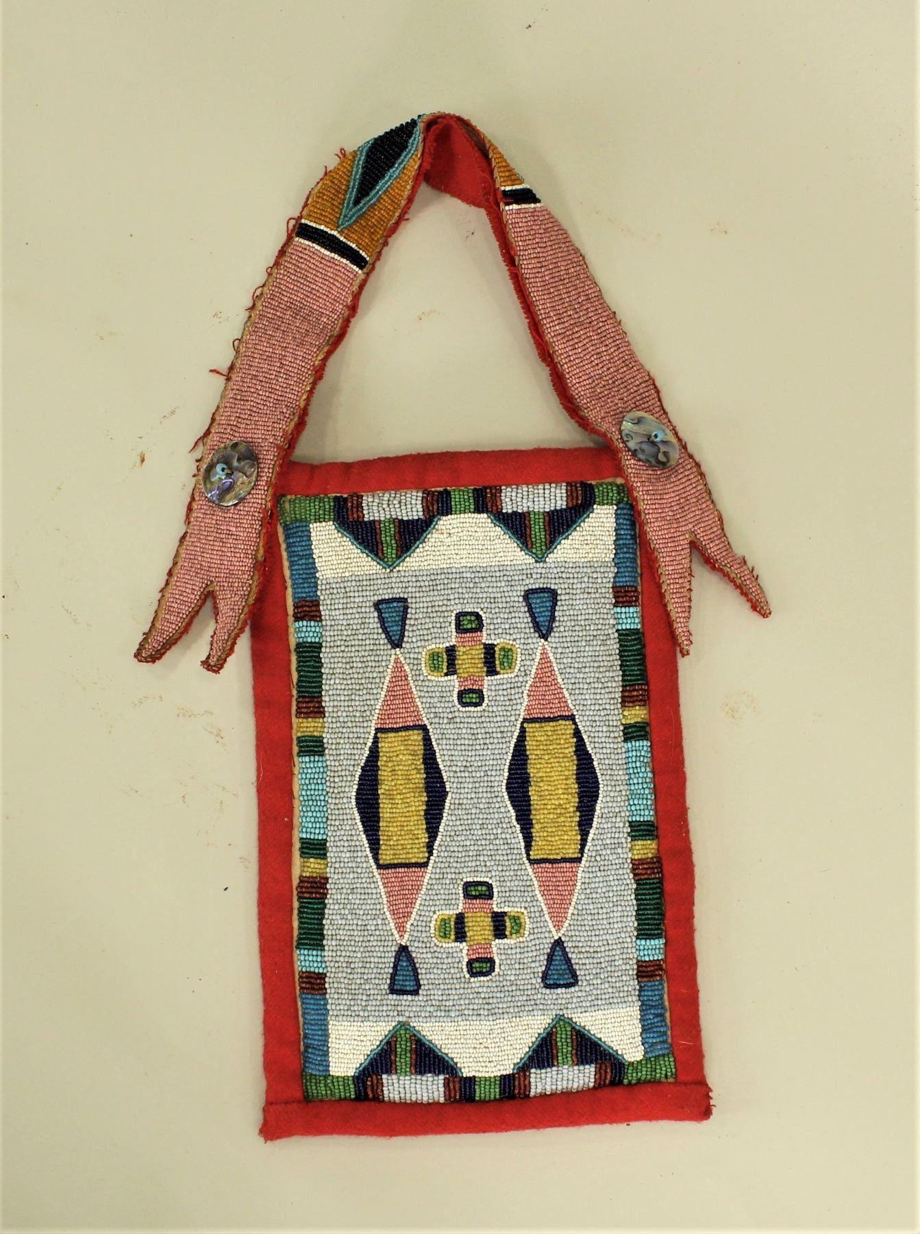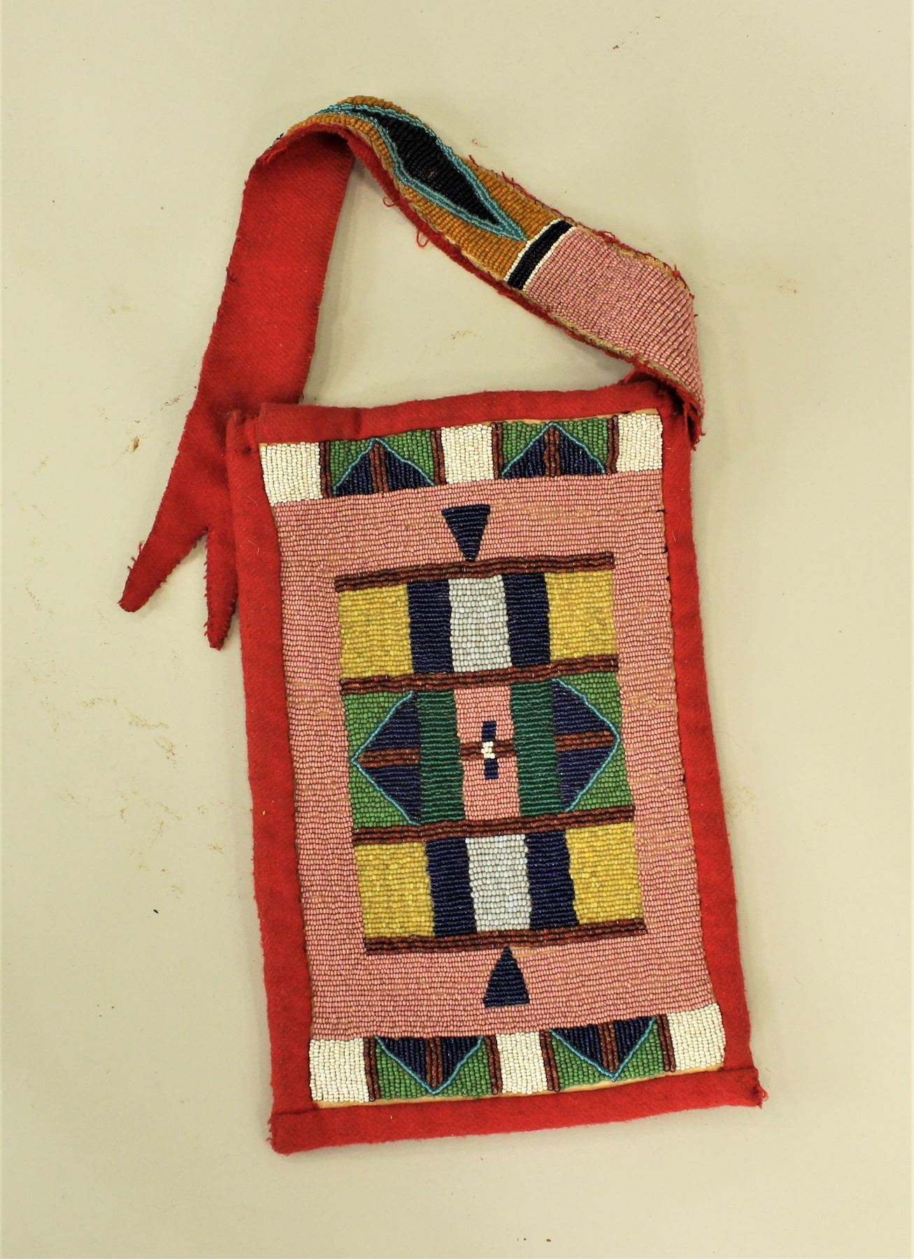A very decorative fully beaded, double-sided bag on trade cloth, featuring Crow pink, greasy yellow and apple green beads, accented by a beaded hand strap. Measuring 6 1/2"x 10".