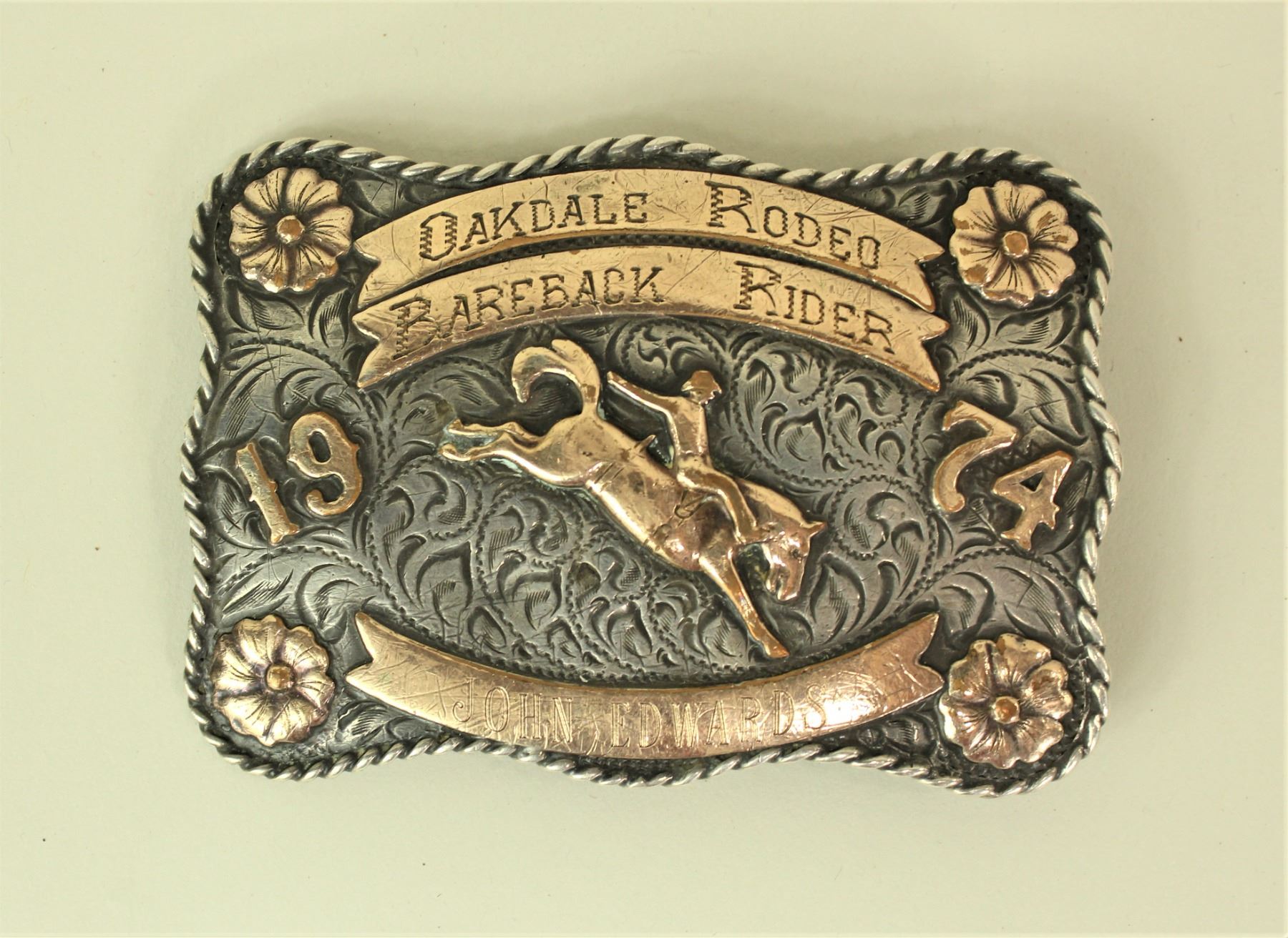 John Edwards personal trophy buckle, born in 1941, from Red Lodge, Montana. Member of both the RCA and the PRCA, held the record for winning the first 3 rounds at the 1969 National Finals Rodeo, until 2011 when Casey Fields tied him. Edwards having a career in the rodeo world, was also a rodeo judge, including the 1977 N.F.R.