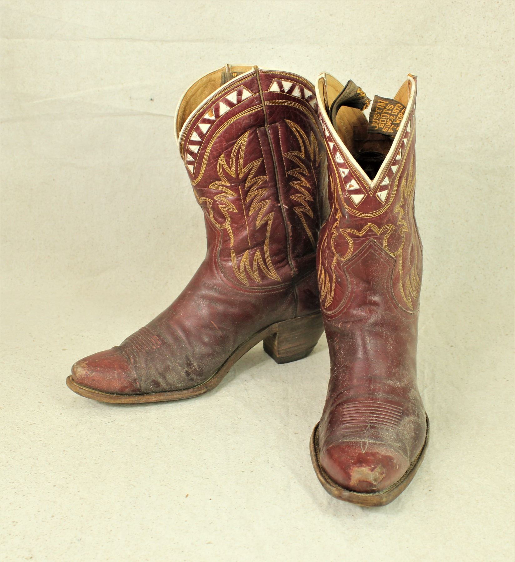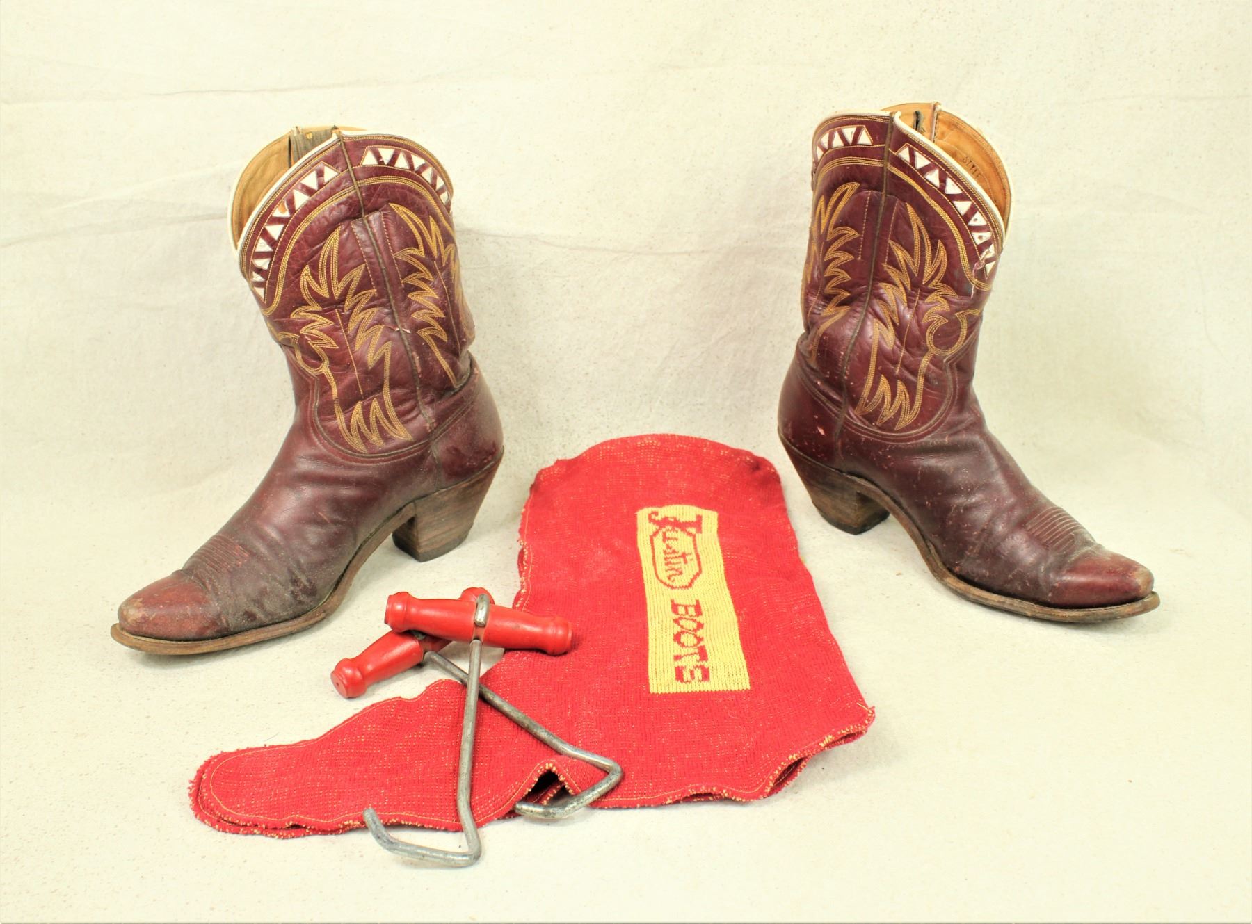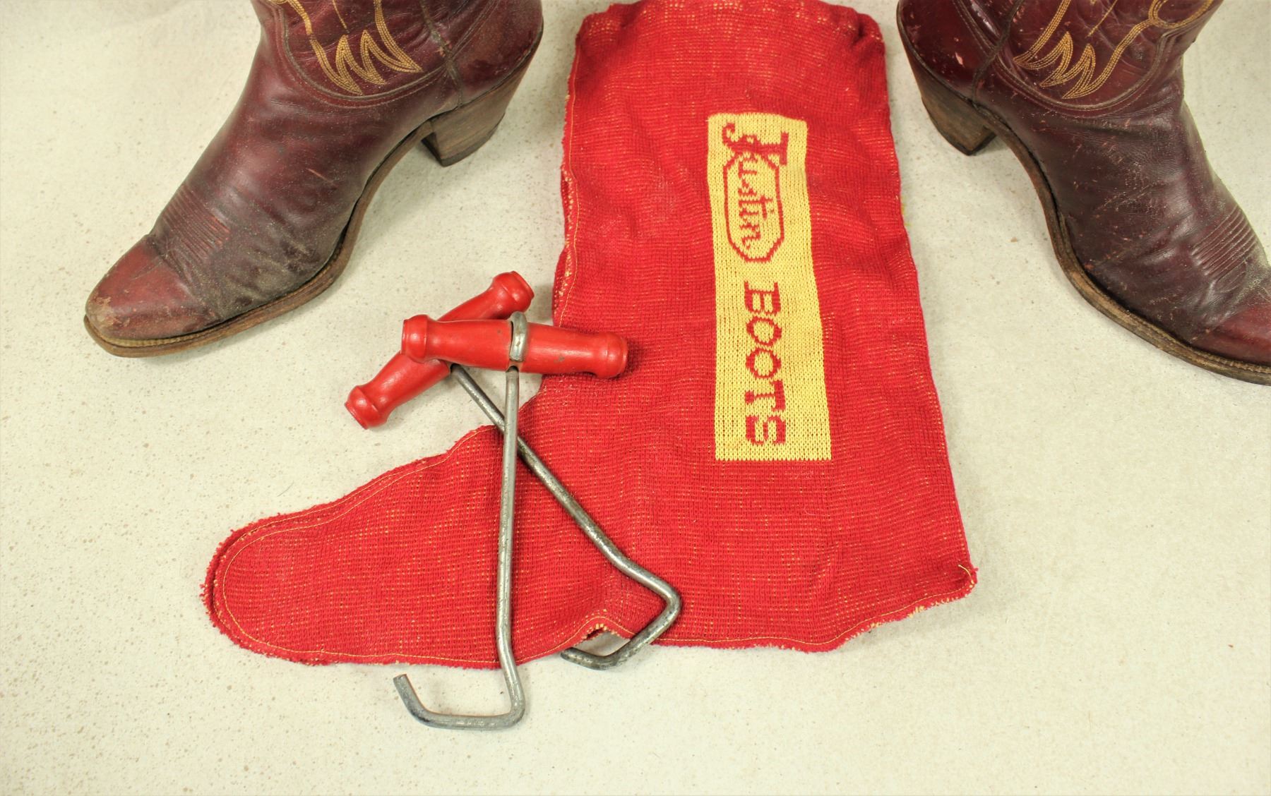 A classic pair of 1930's short top cowboy boots with decorative stitching and tall sloped riding heels, accompanied by two original Justin boot hooks and a pair of boot bags.