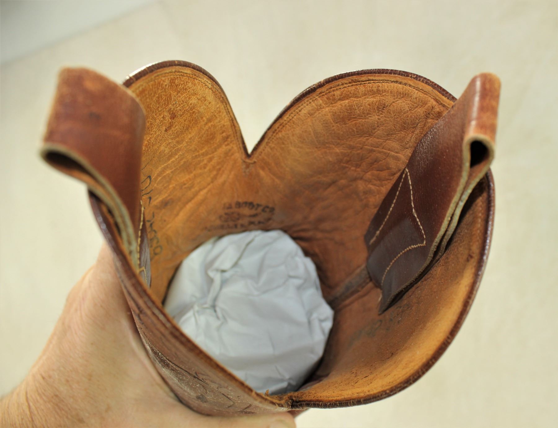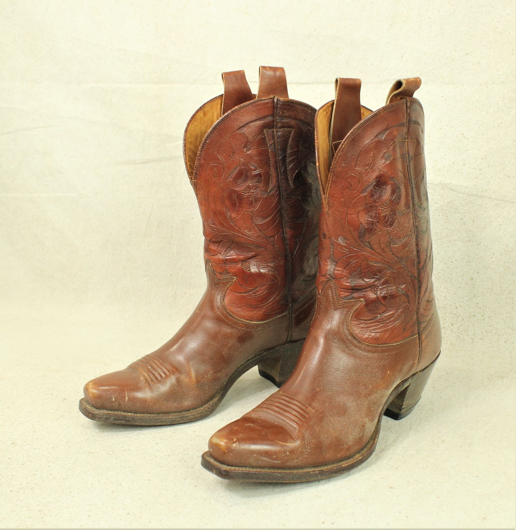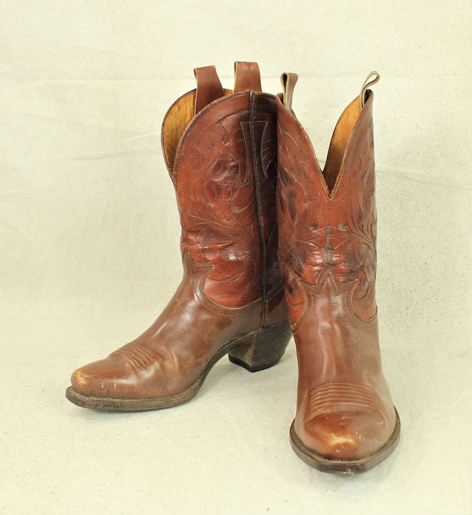 An attractive pair of boots with hand carved tops, leather pulls and Nocona cartouche on inside of upper.