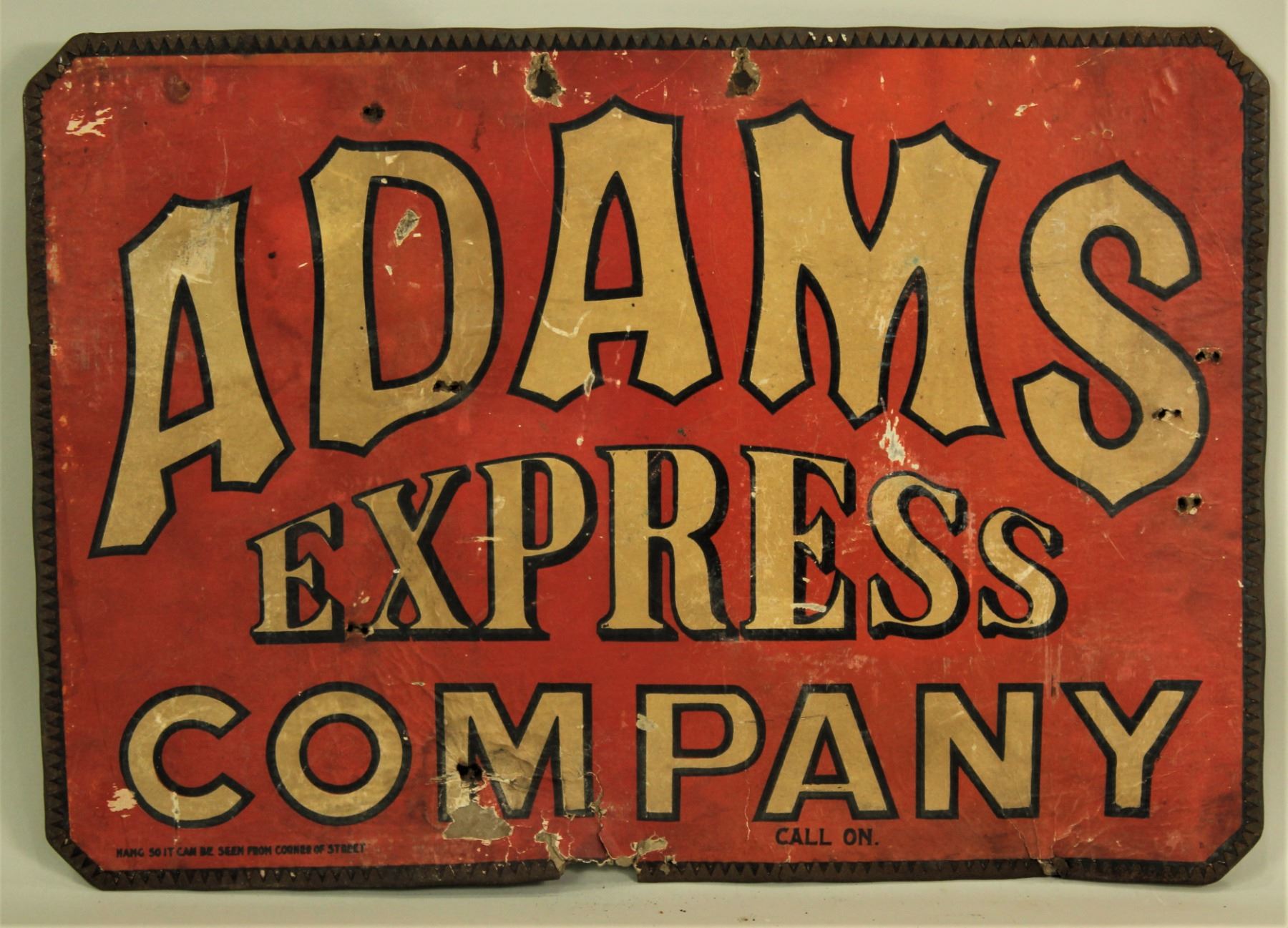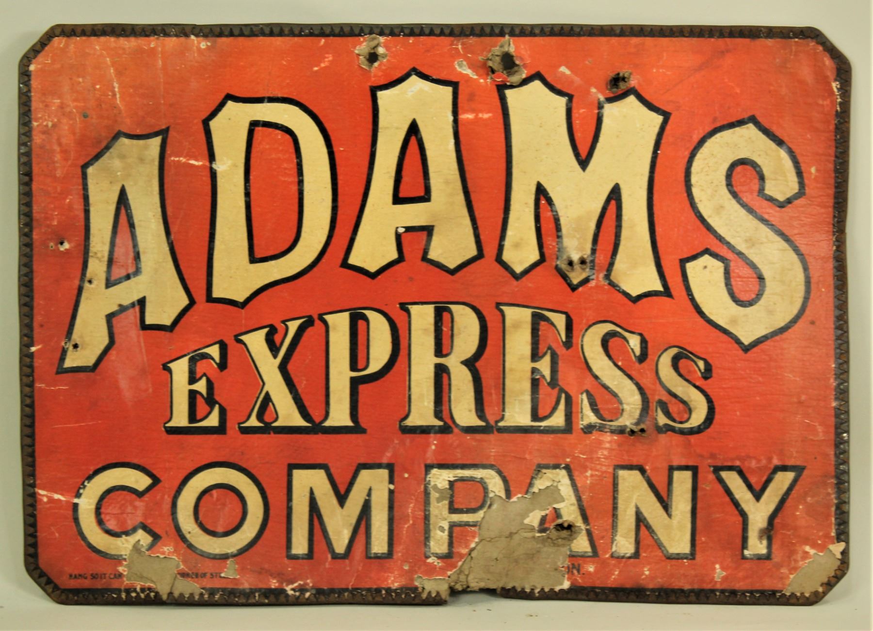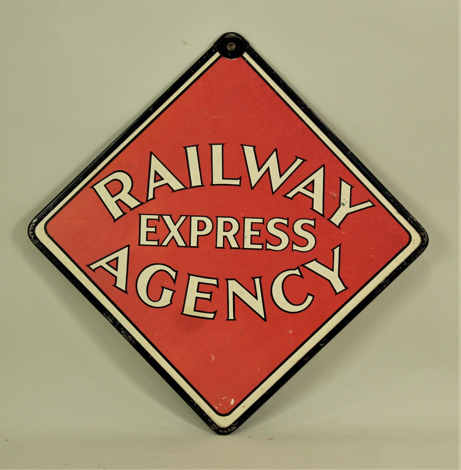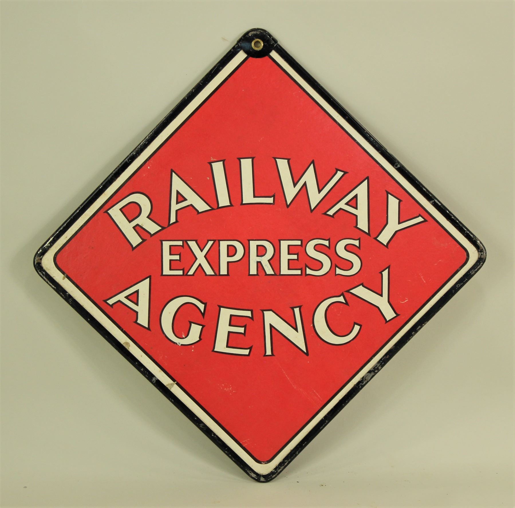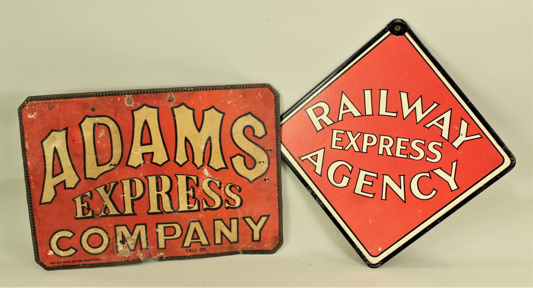 Two very collectable double sided antique express signs. 1) Adams Express Company measuring 13 1/2"x 19 1/2". 2) Railway Express Agency measuring 14"x 14".