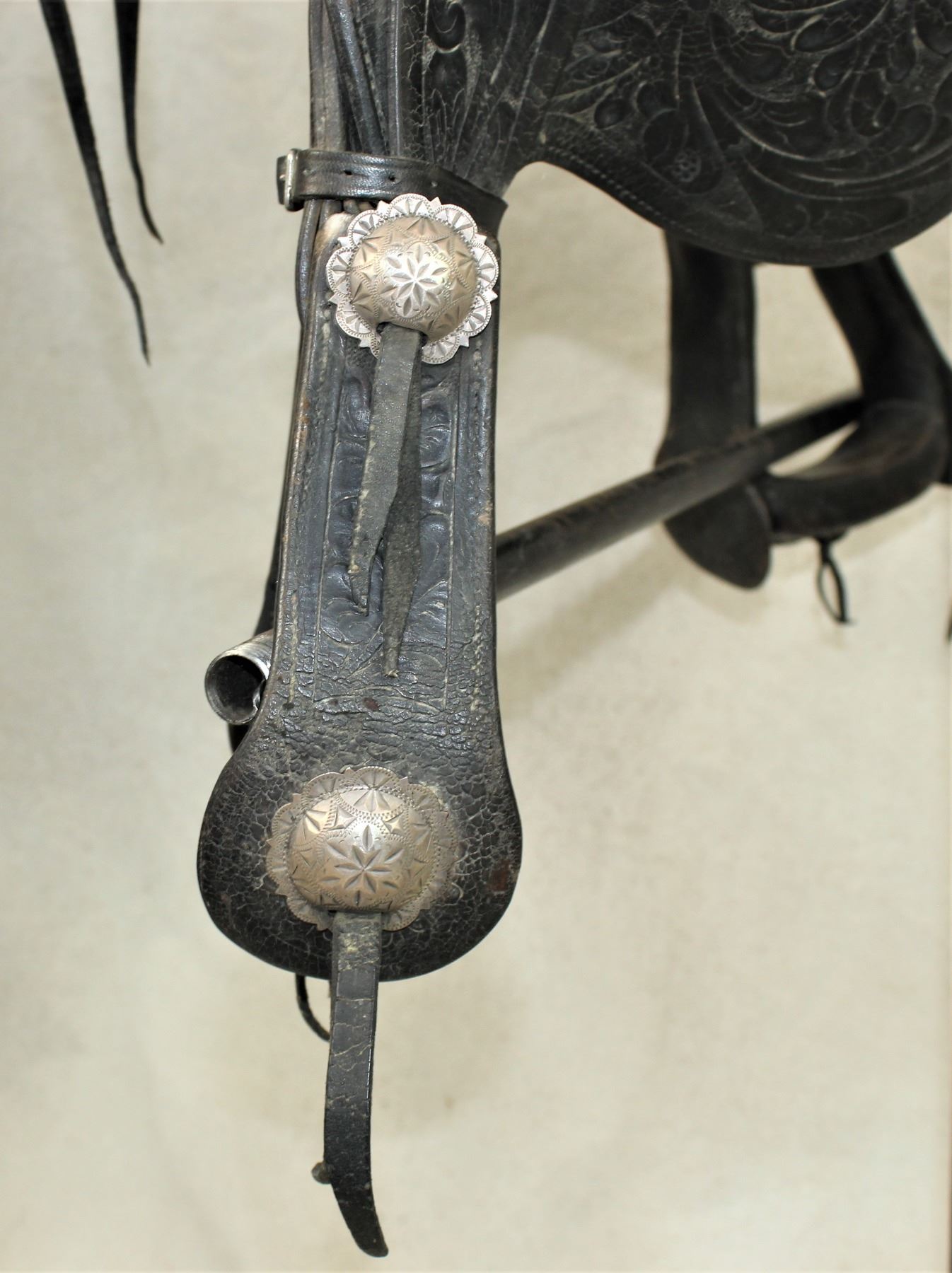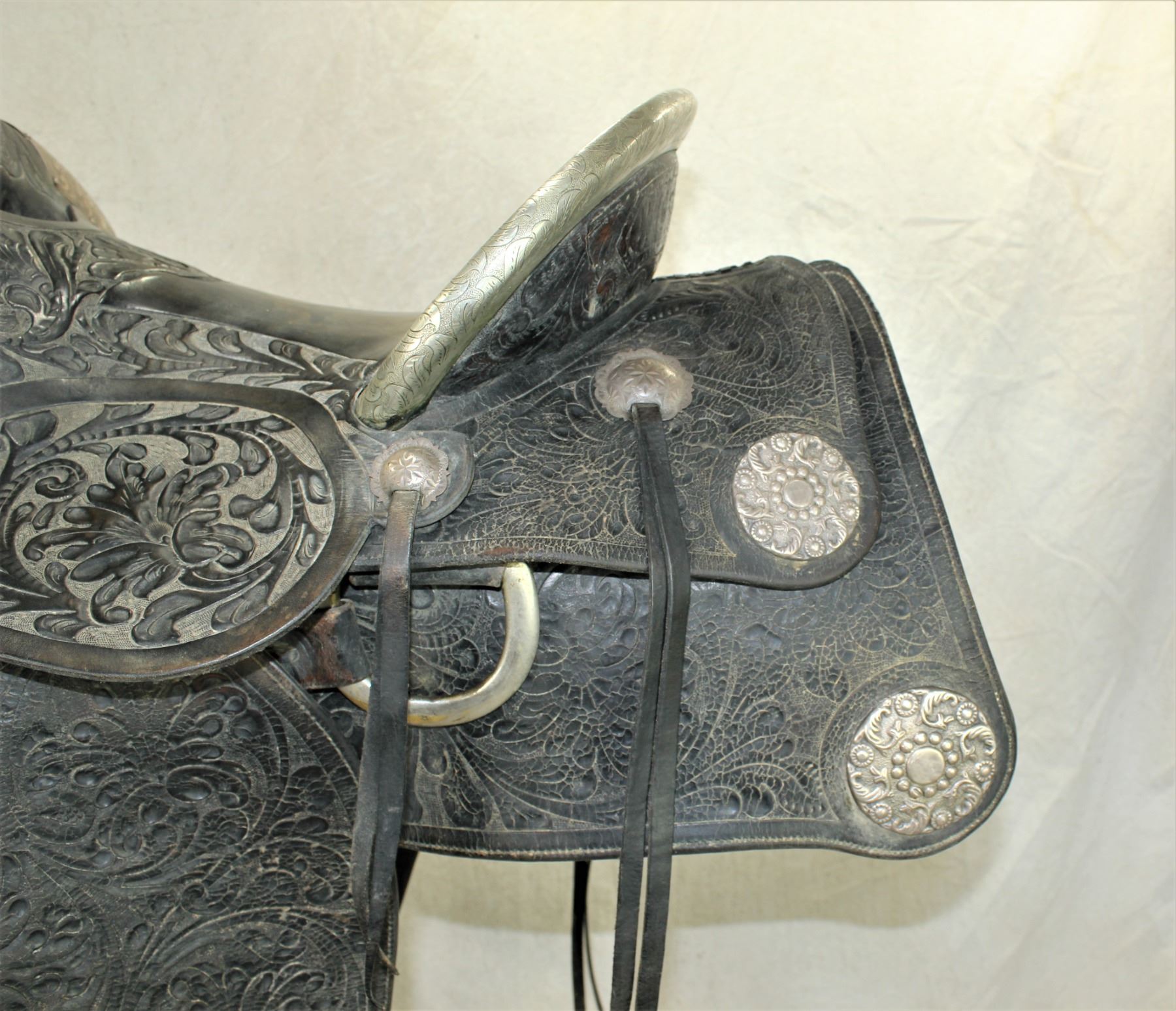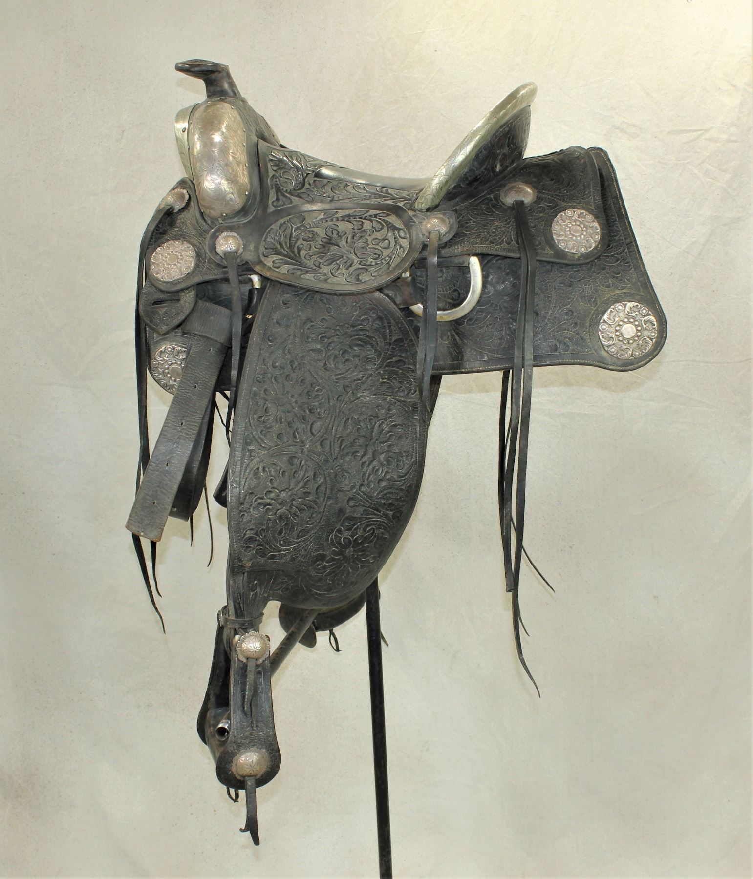 Bob Wills personal Schoellkopf Co., Dallas< Texas, silver mounted show saddle. Extensively floral carved, with massive silver corner medallions, decorative engraved silver conchos, scalloped square skirt, silver bound swells and cantle, silver mounted stirrups, and personalized rear cantle. A large saddle with a 16" seat. This was the most expensive model in the 1930's catalog. In overall good condition, with Bob Wills name on the cantle having been tooled over in attempt to detune the personalized lettering.