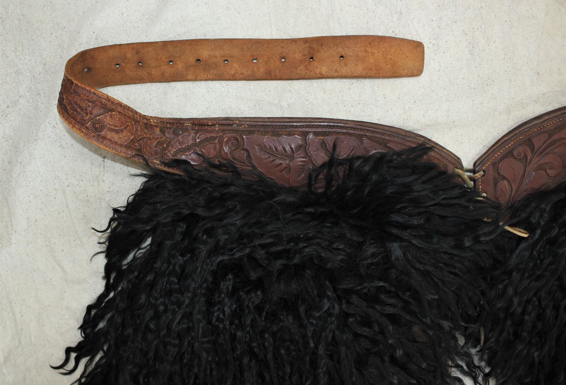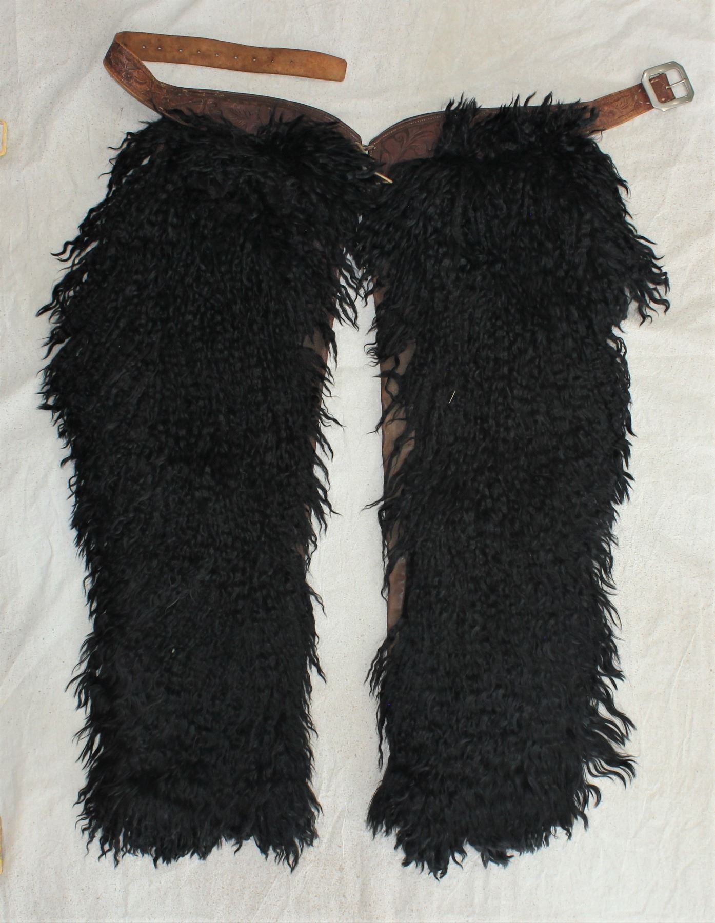 A fabulous large pair of angora step-in style chaps, with lustrous thick black angora hair, and a beautifully flower tooled belt.