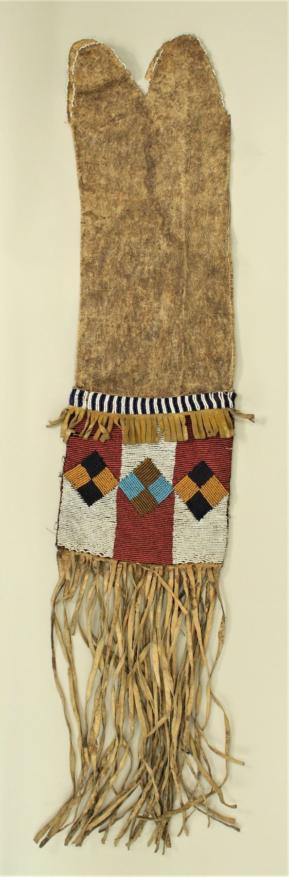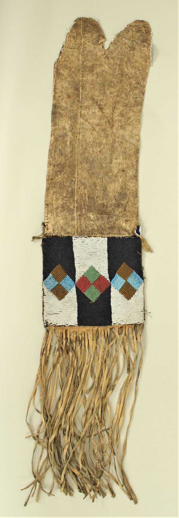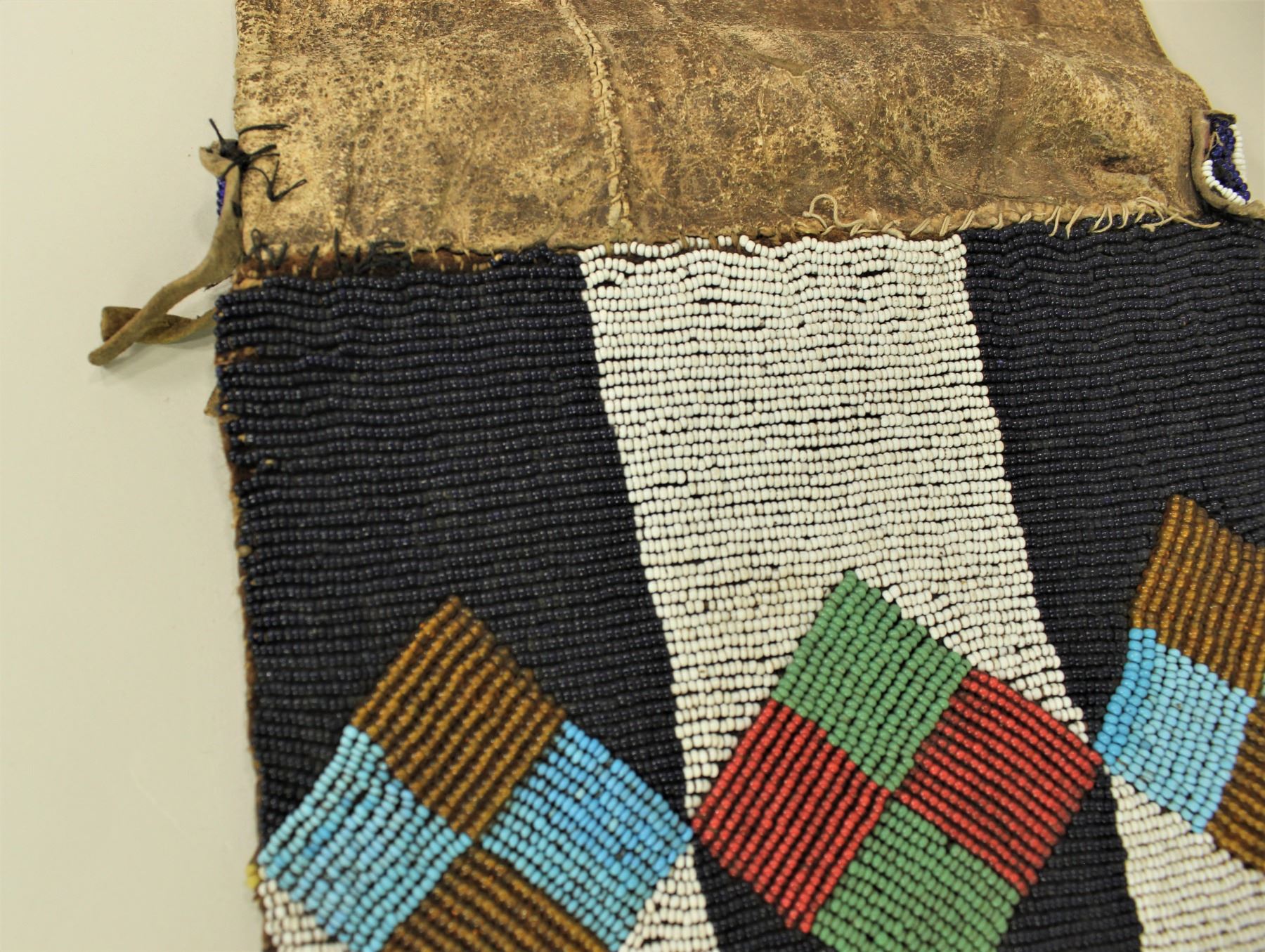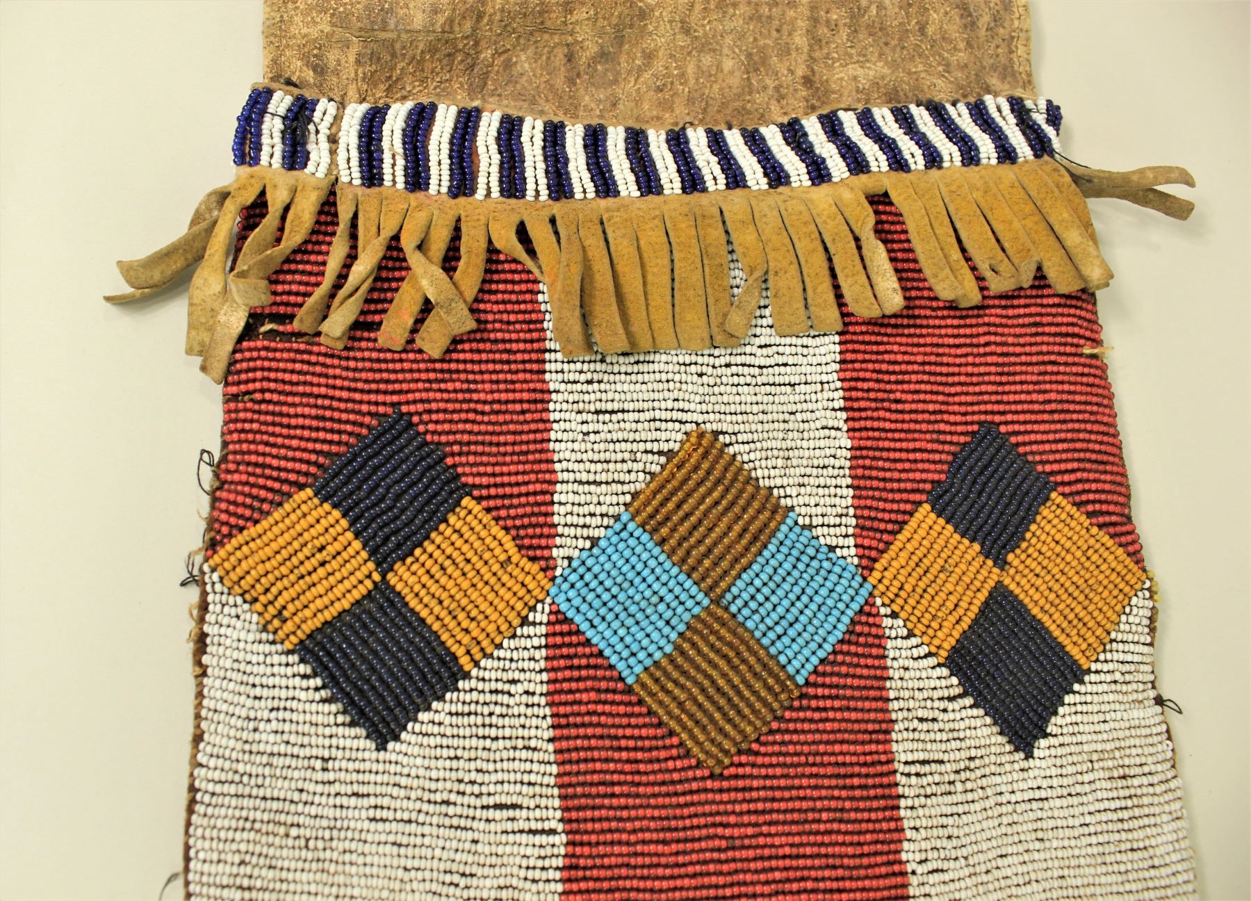 An early pipe bag with tab bag style top, beadwork in a fantastic usual pattern with early white heart beads, and long fringe.