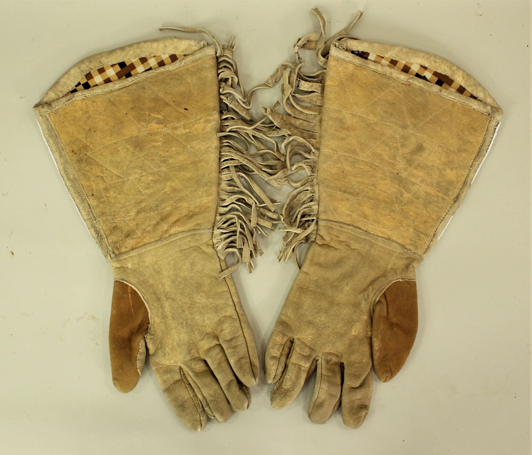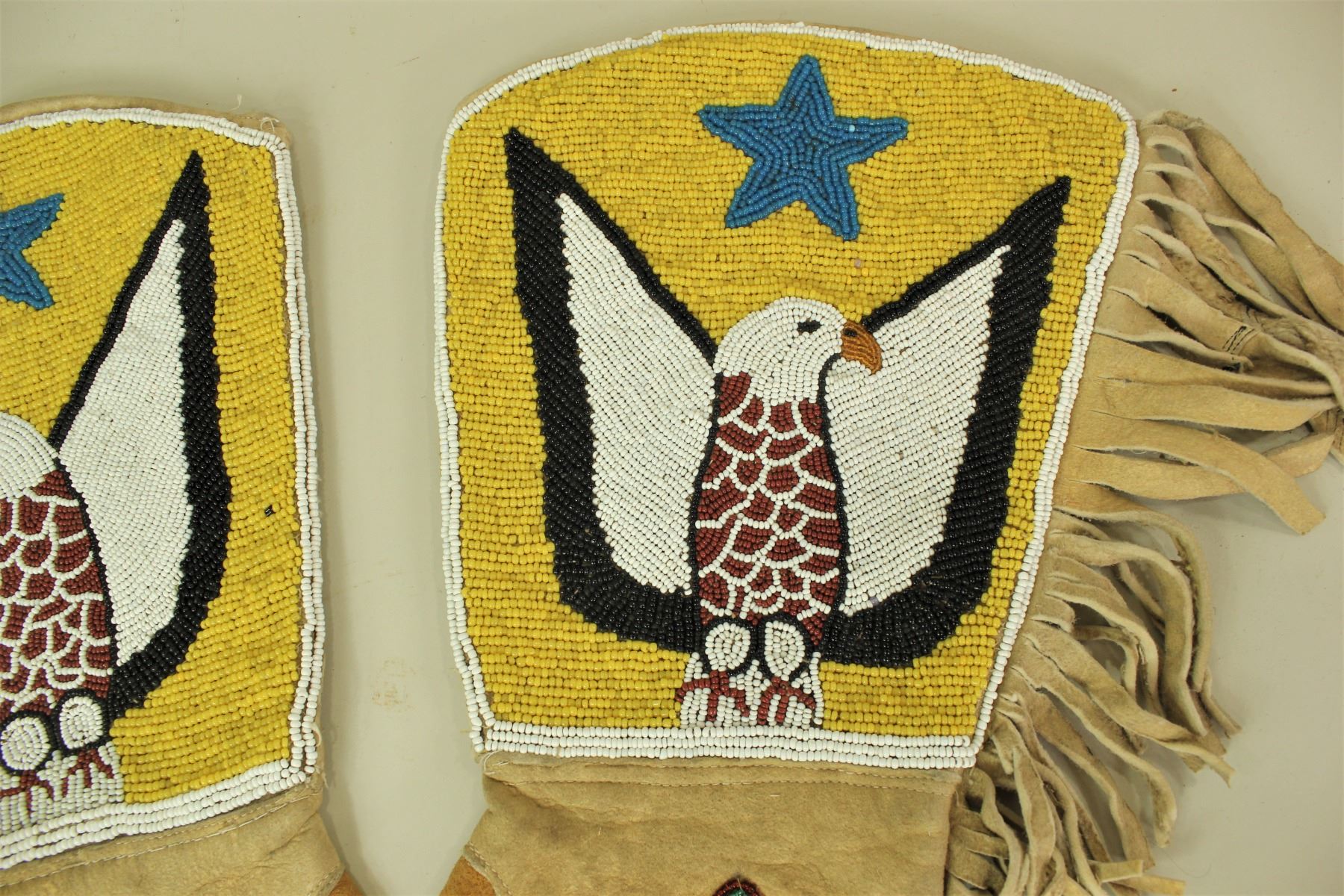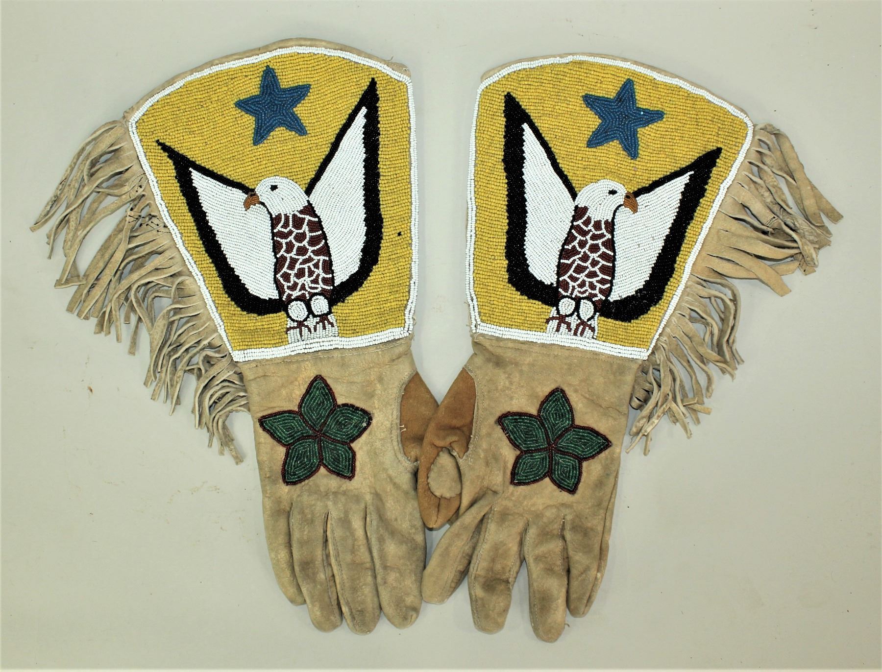 Unusual pair of leather gauntlets with large fully beaded fringed cuffs, with detailed beadwork in a bald eagle motif.