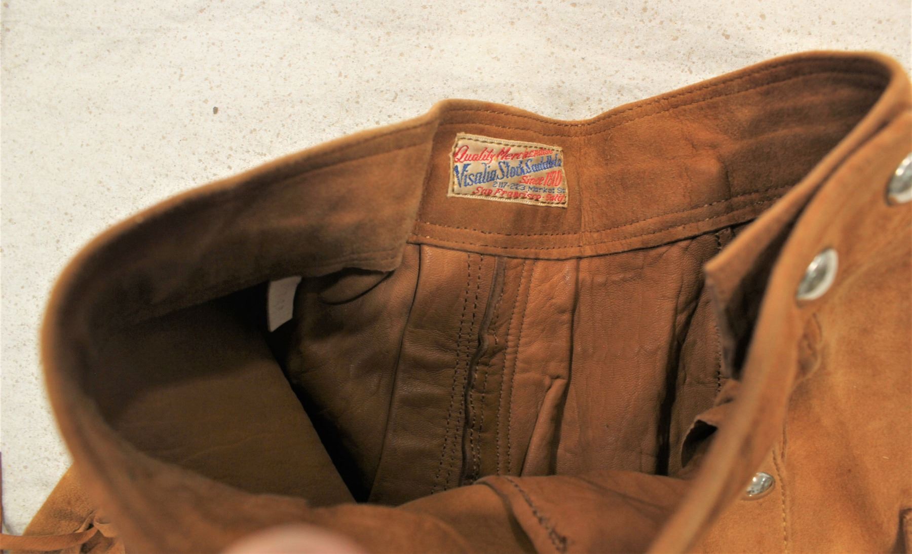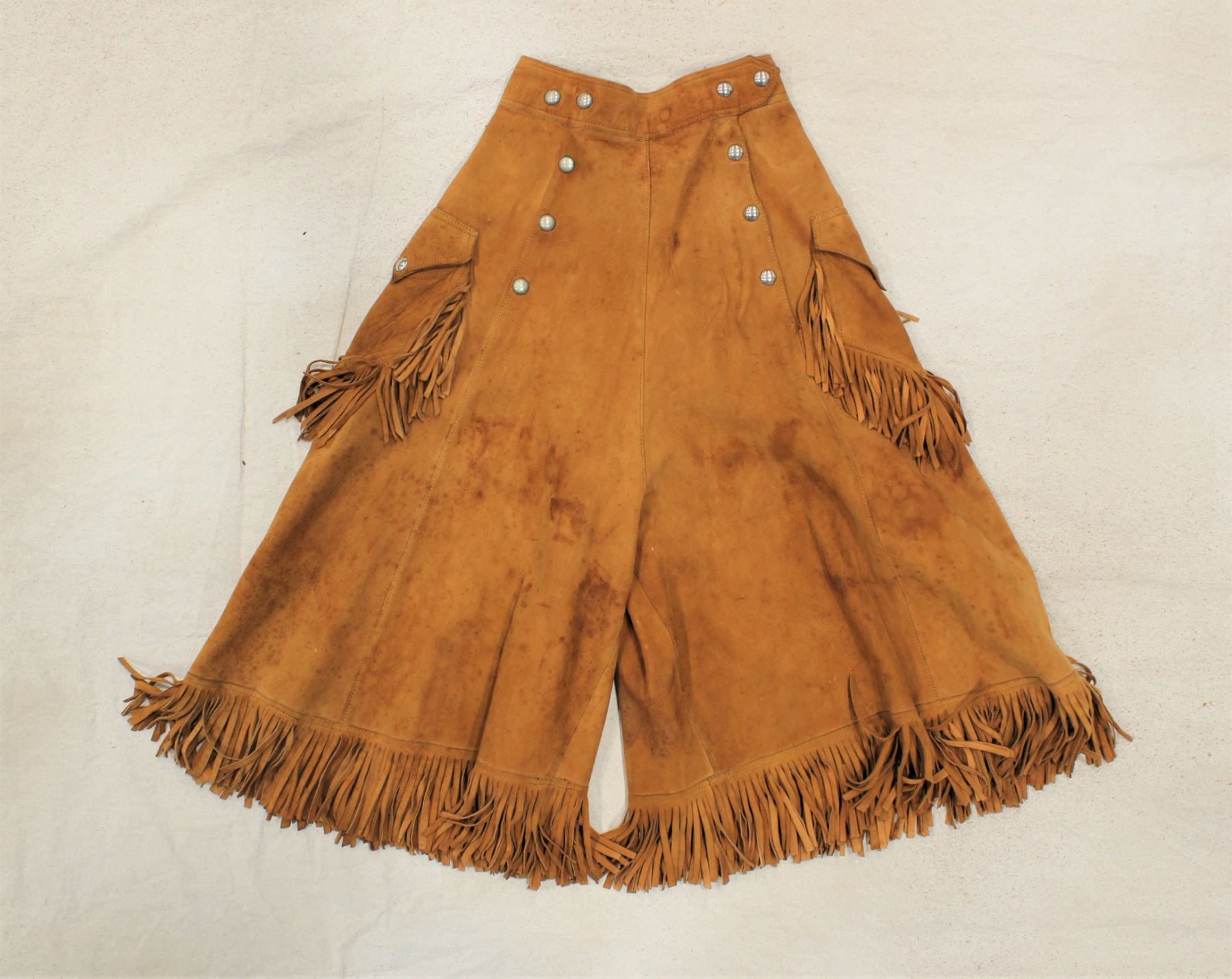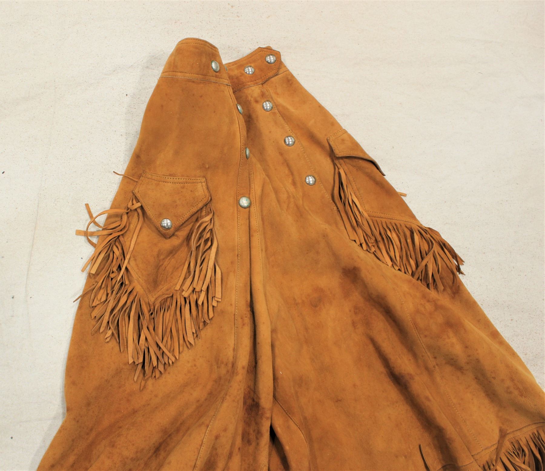 In nearly unused condition, a nicely fringed riding skirt with pockets, and Visalia Stock Saddle Company label in the waistband. Circa 1920-1930.