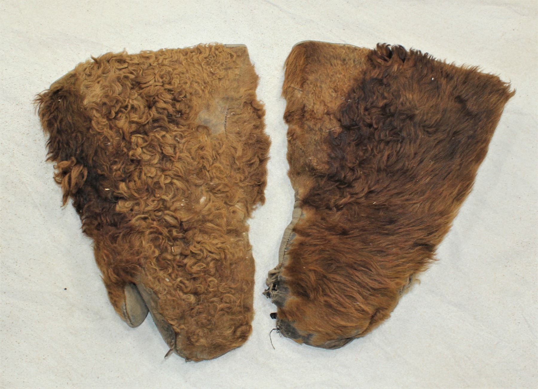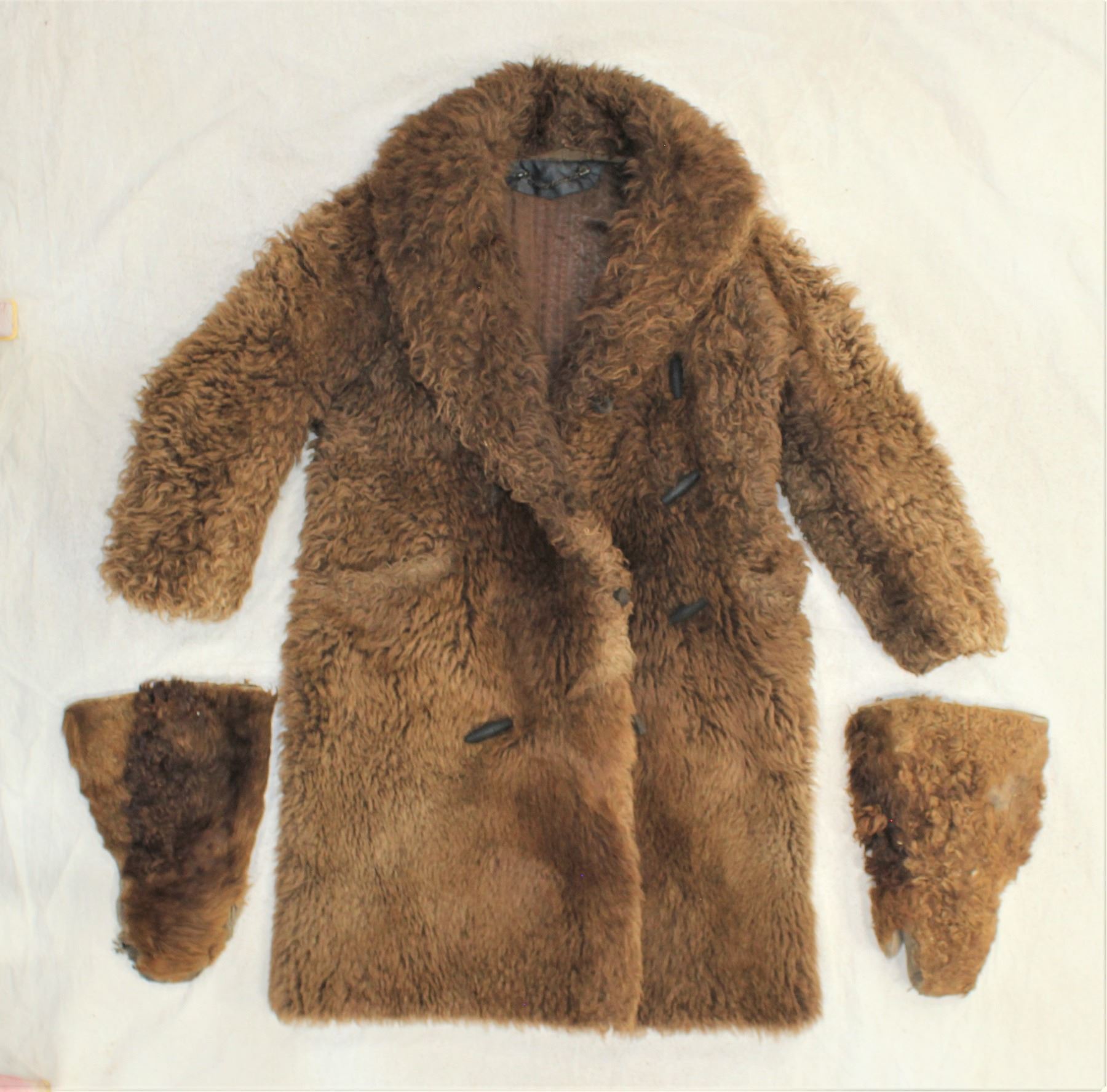 Wonderful heavy buffalo hide western frontier coat, with great quilted lining, buttons, and accompanied by its original matching buffalo hide mittens. With appealing color and condition.