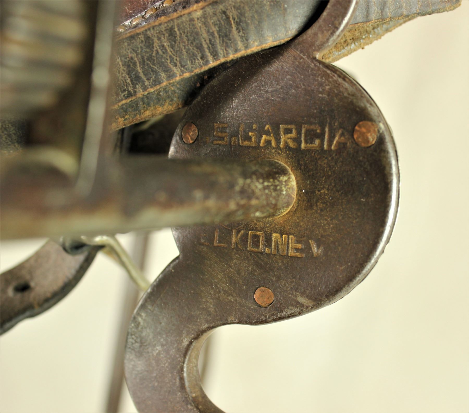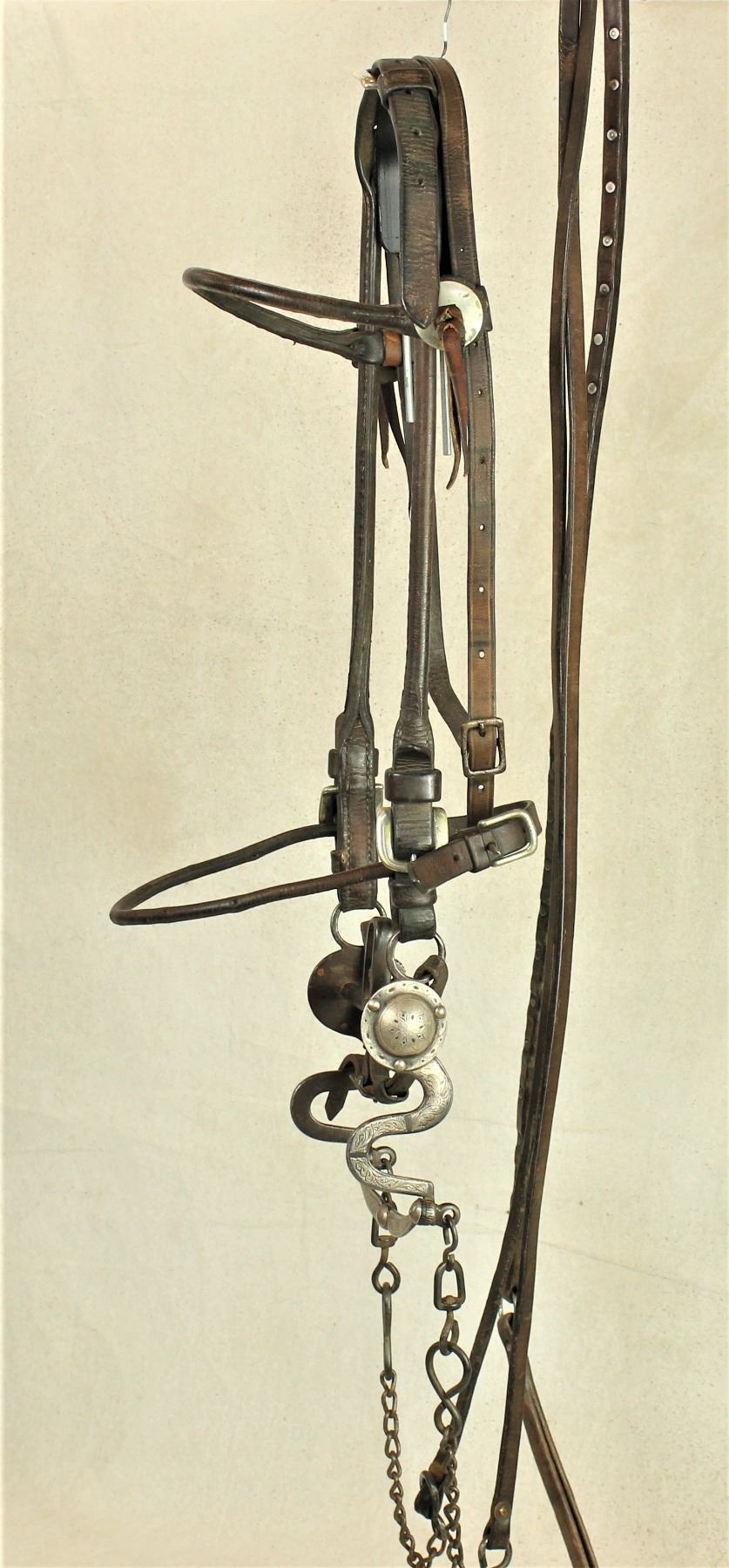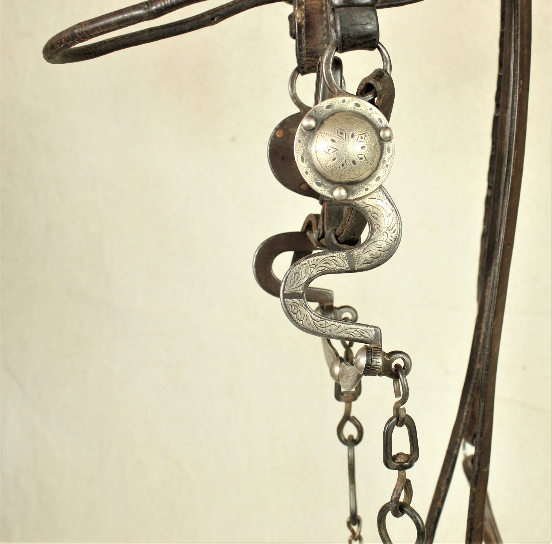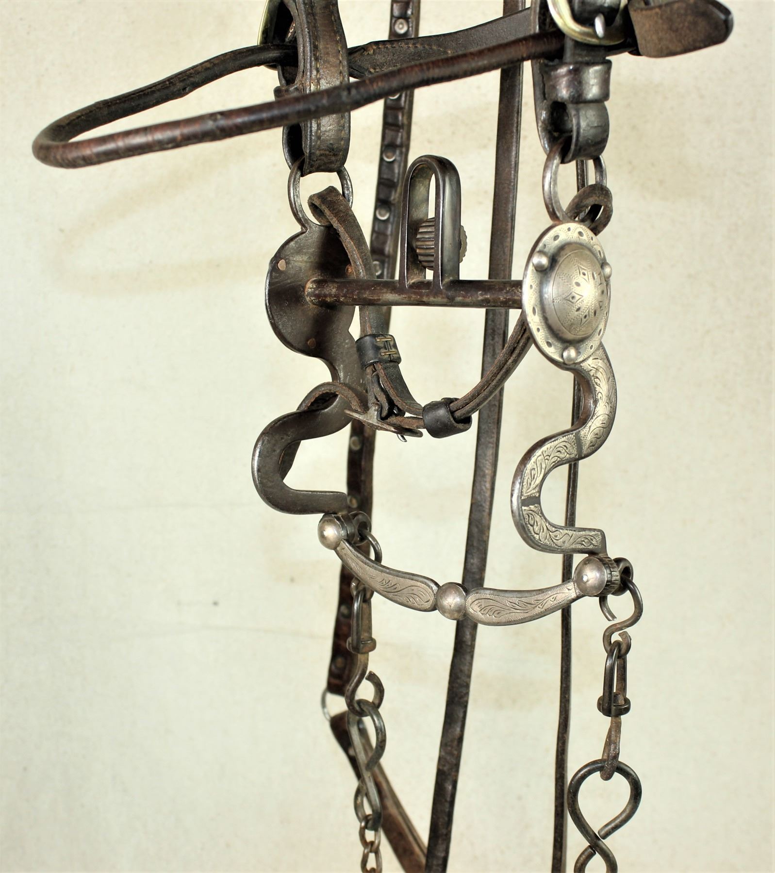A fabulous Cheyenne style rolled leather bridle with romel reins, and accented by an uncommon G.S. Garcia radical "S" shank halfbreed bit, showing great silver inlay, conchos and condition.