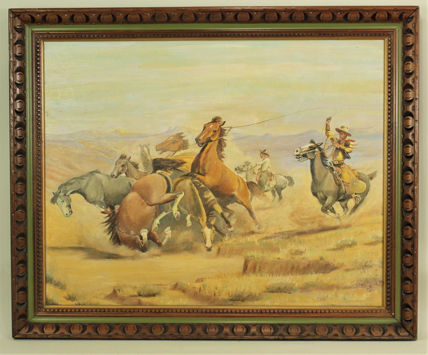 A large western oil on board with lots of action. Professionally framed with image measuring 22"x 28".