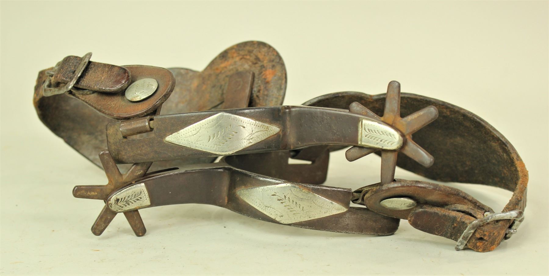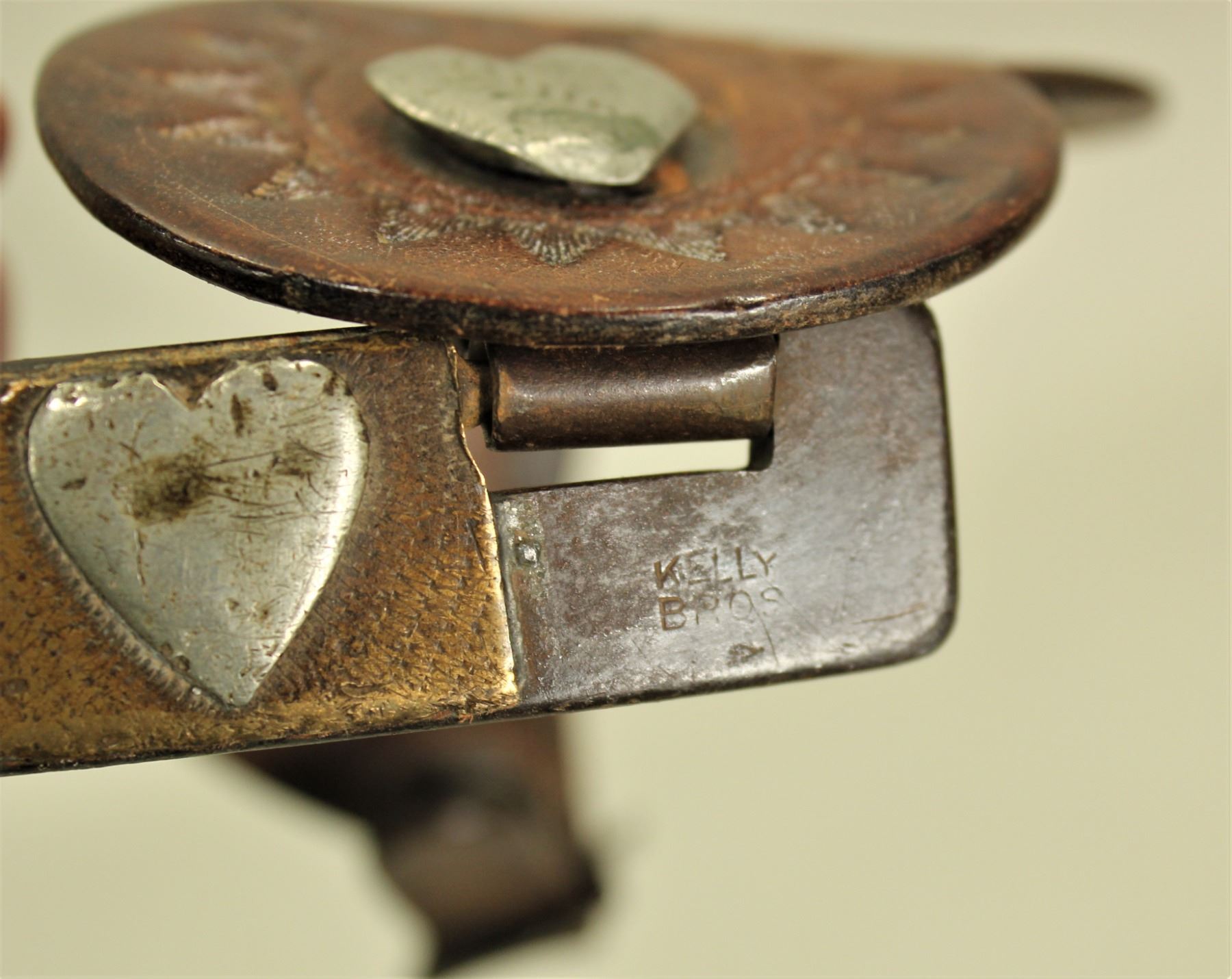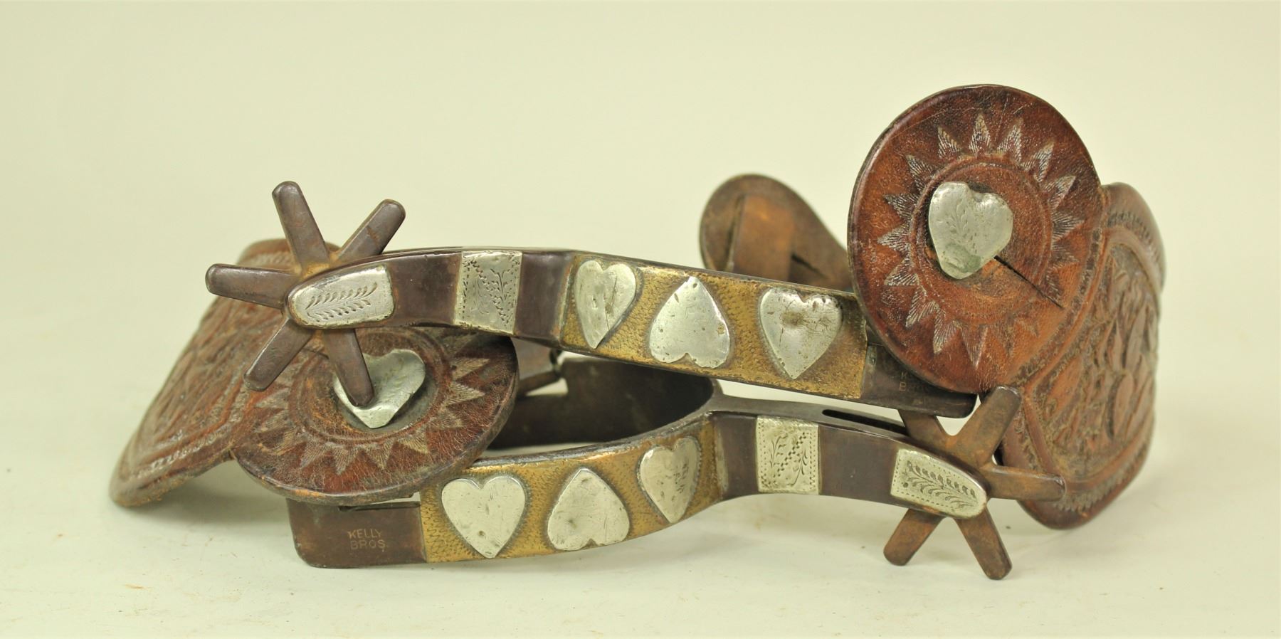A very collectable pair of double mounted four heart spurs with great color, eye appeal and bold maker's marks. Complete with their original basket stamped straps.