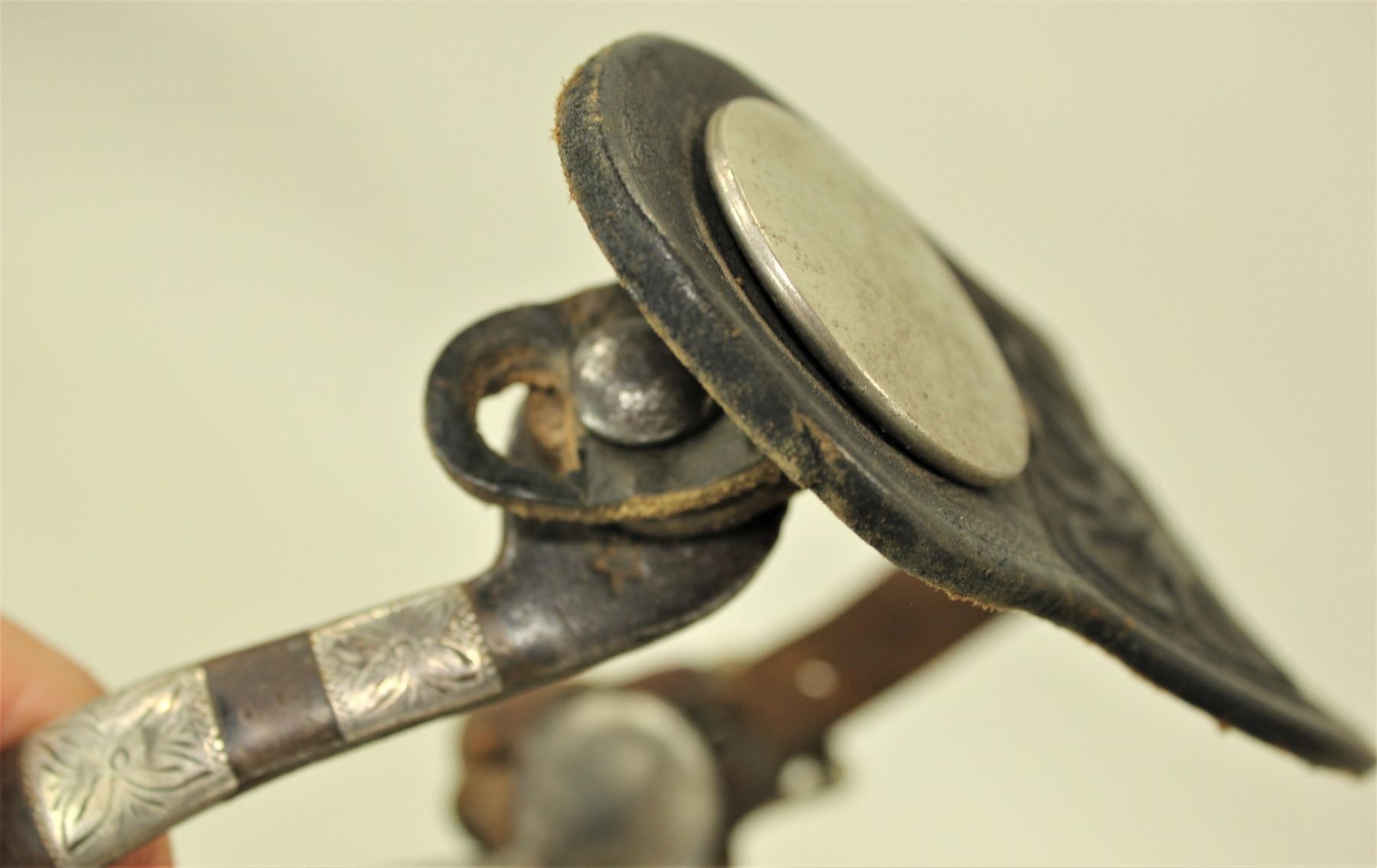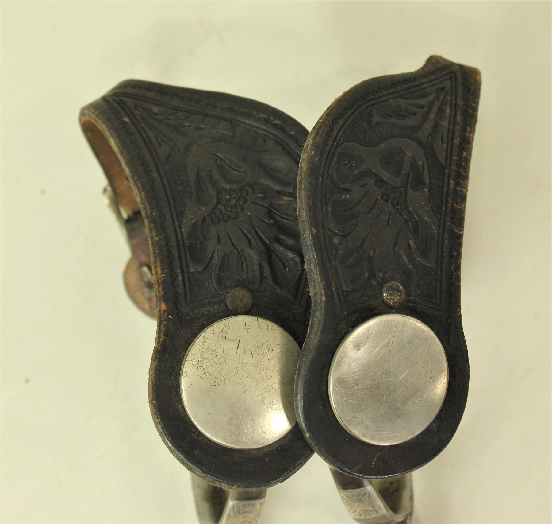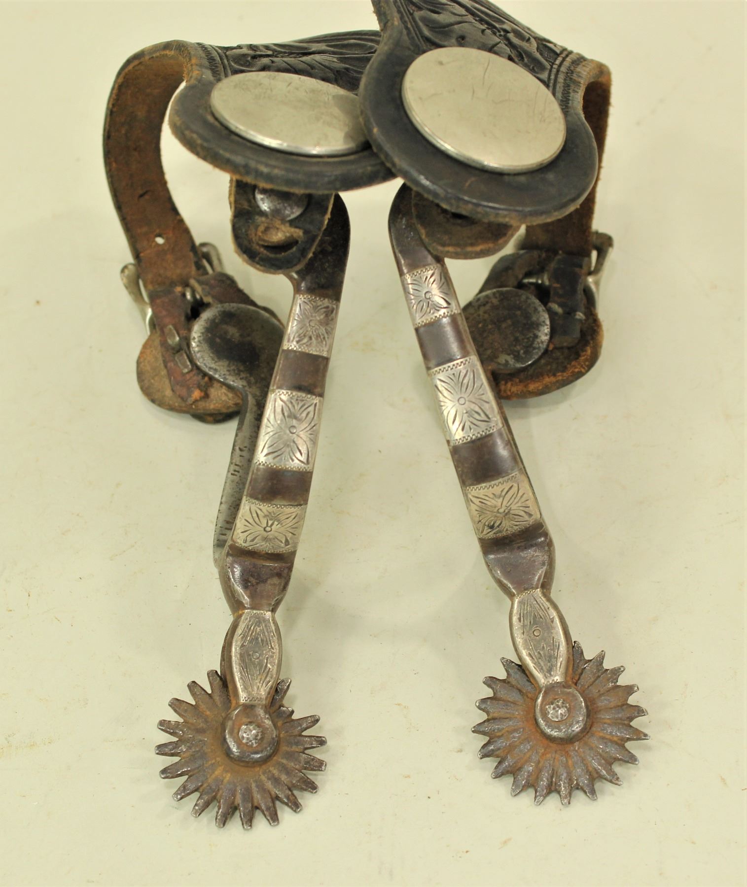A stylish pair of double mounted spurs with straight shanks, sawtooth rowels and early AB marks, complimented by nice original straps.