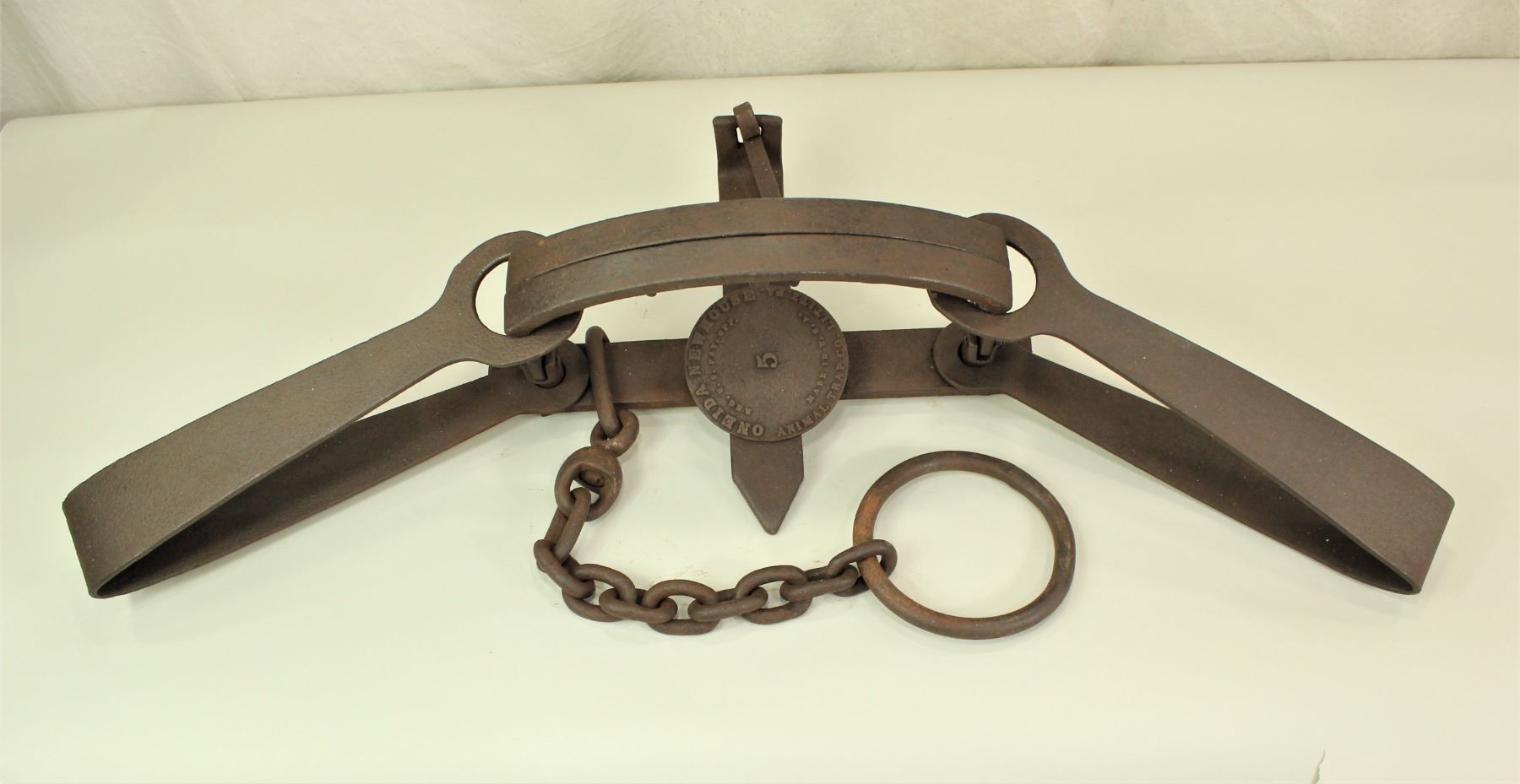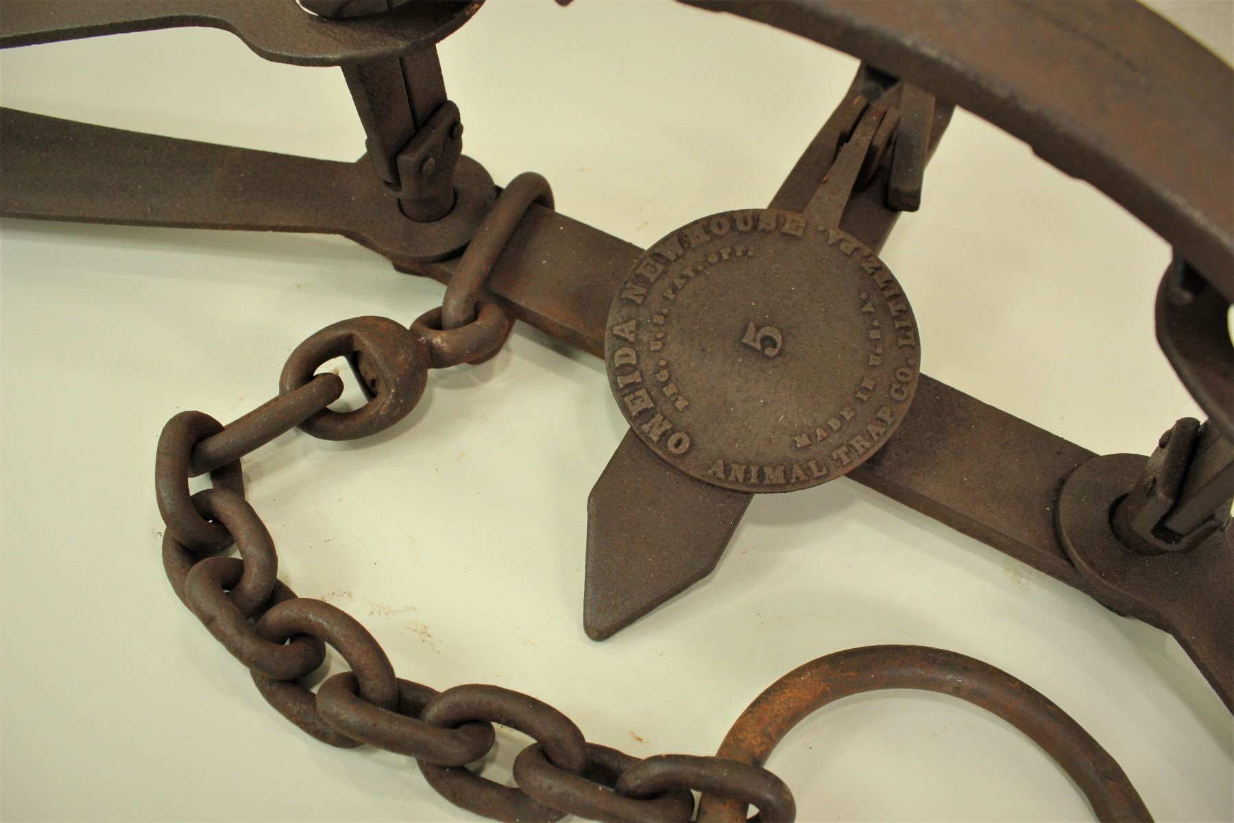 A highly sought after large #5 bear trap with "Oneida Newhouse" marked pan, and completed by its original drag chain.
