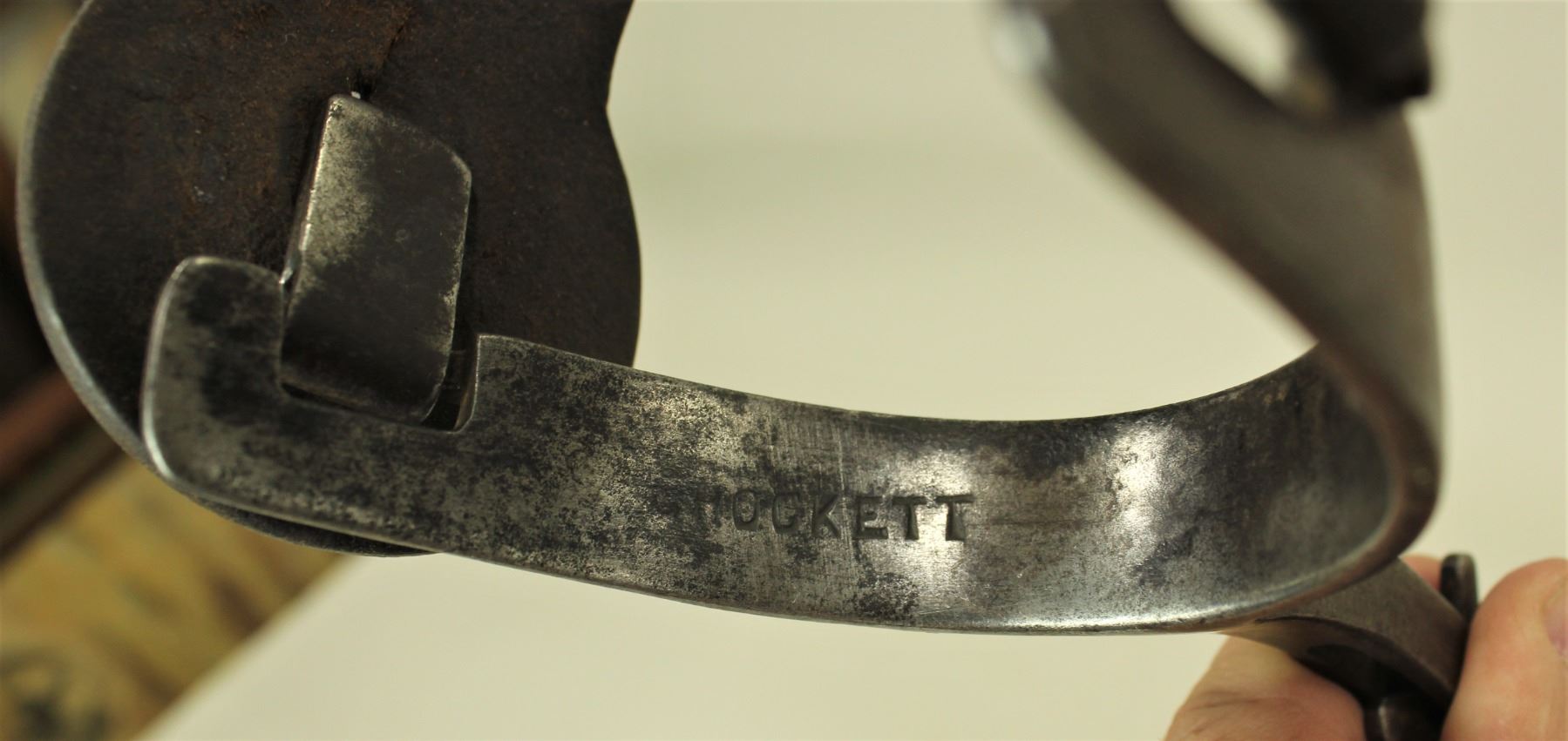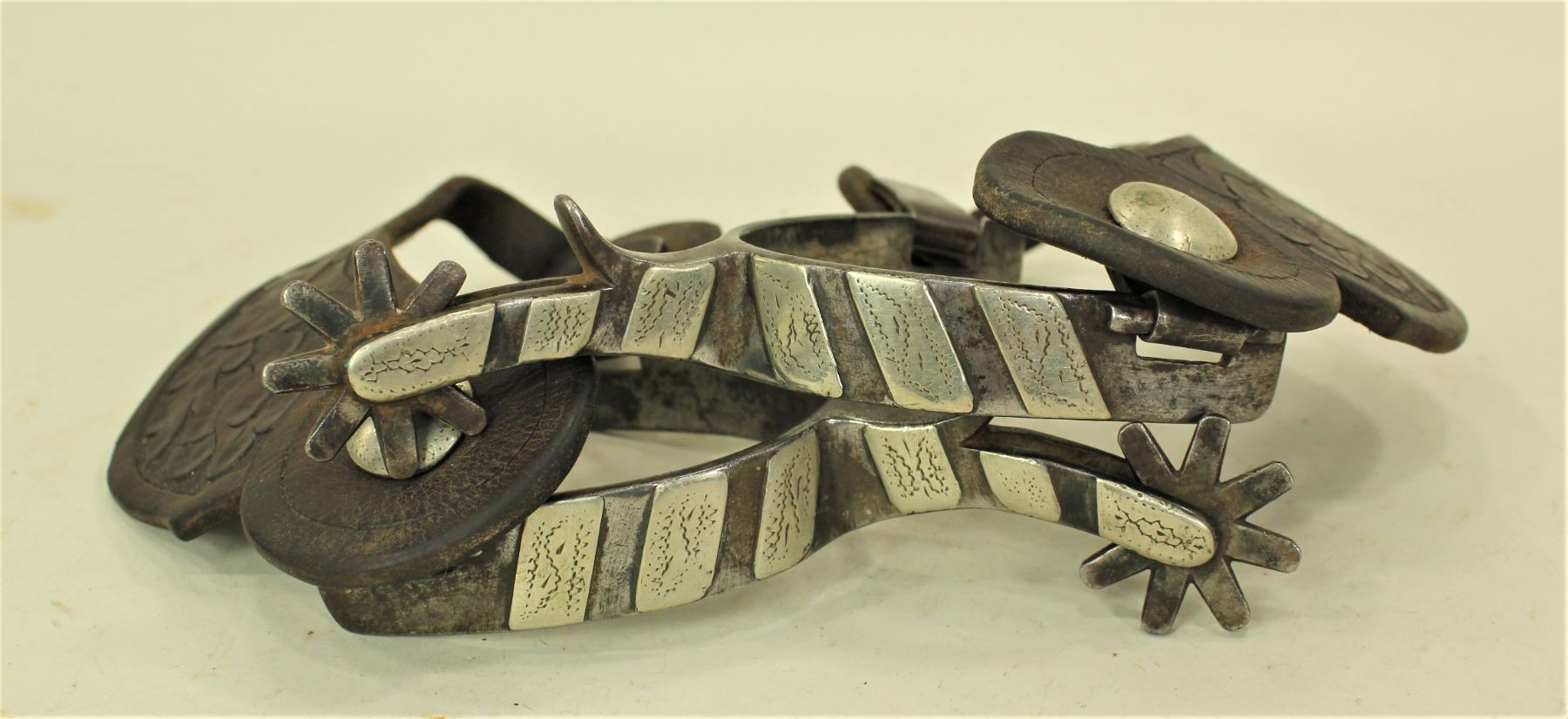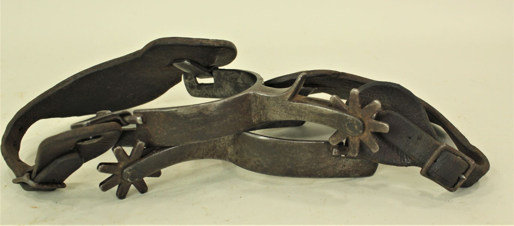 A rare pair of medium size inside marked Johnny Mullin pattern spurs, single mounted with great markings and original straps.