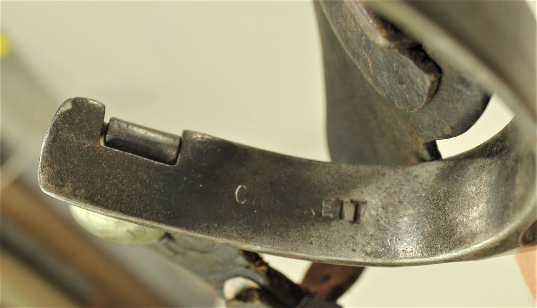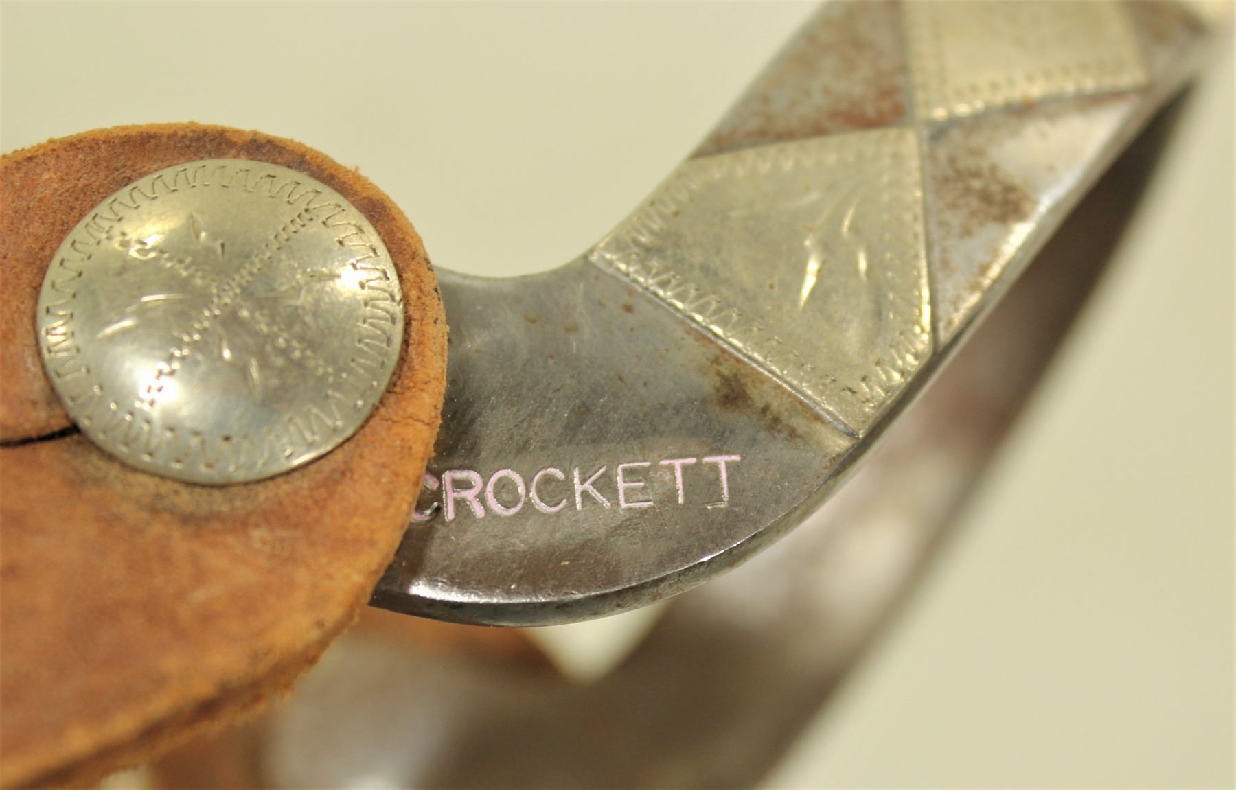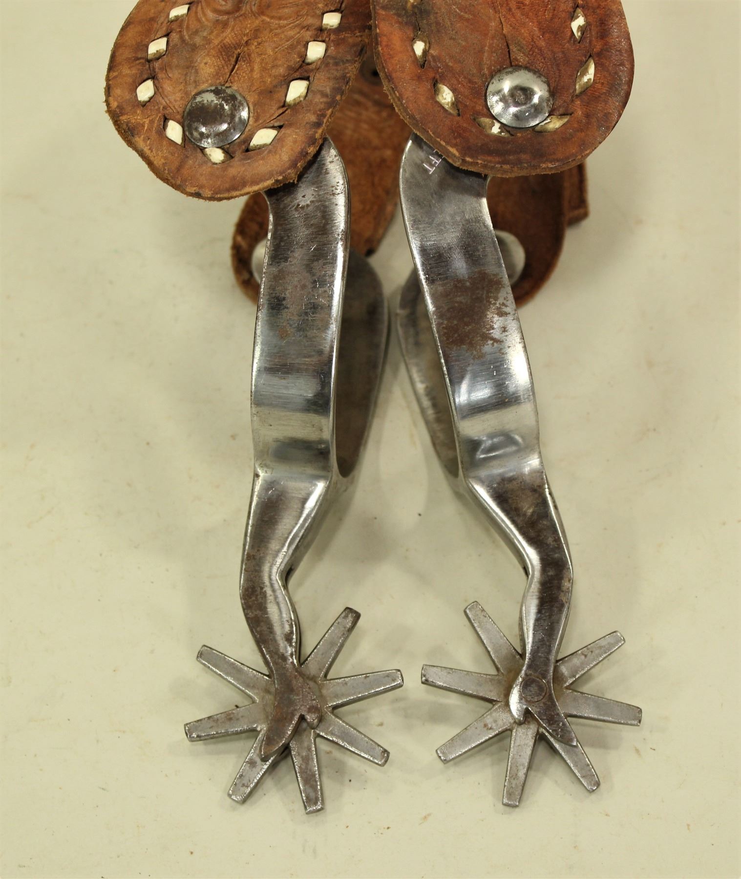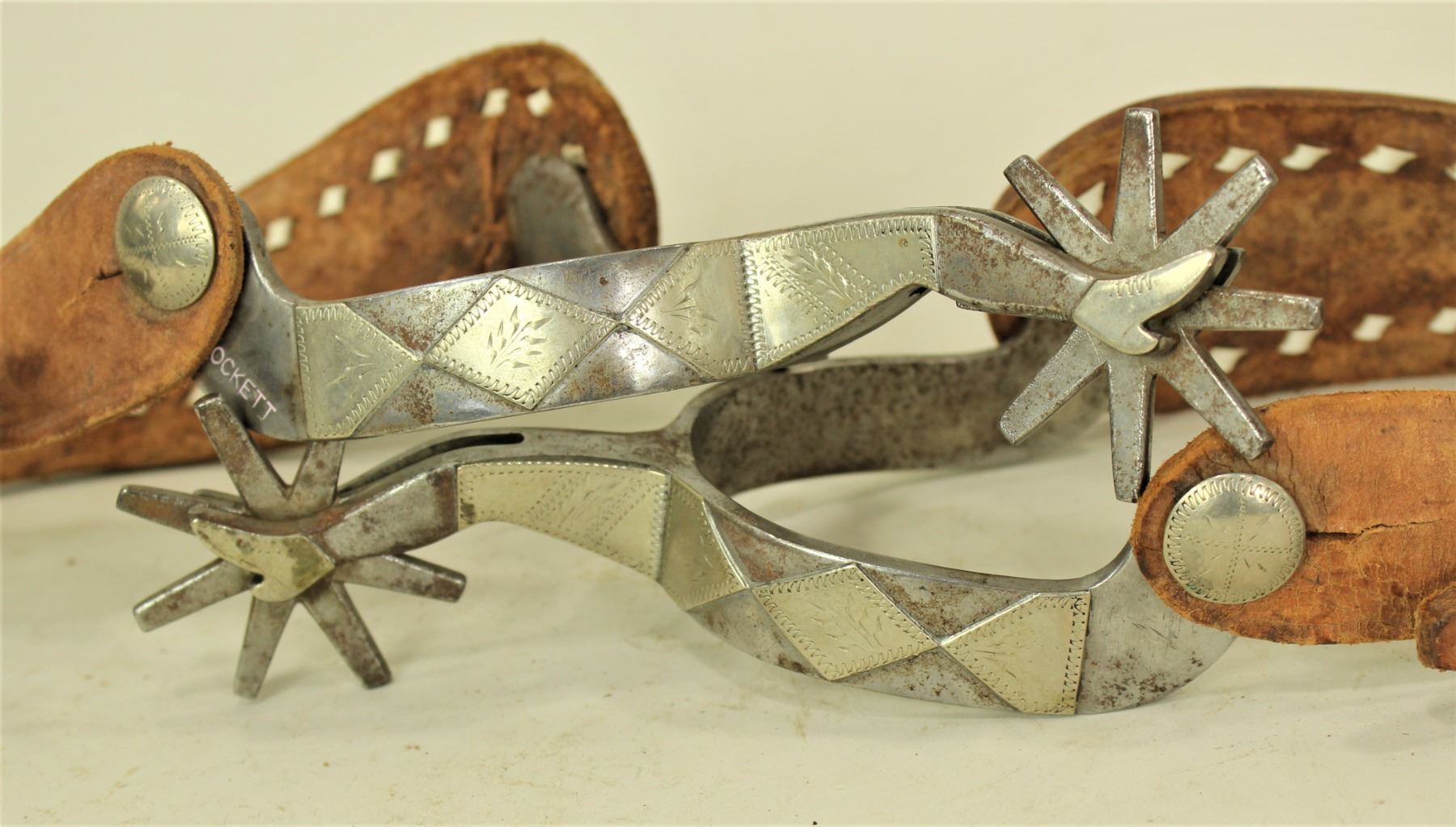 A single mounted pair of pattern #105 lady leg spurs with unique silver diamond pattern and large rowels, and original straps.