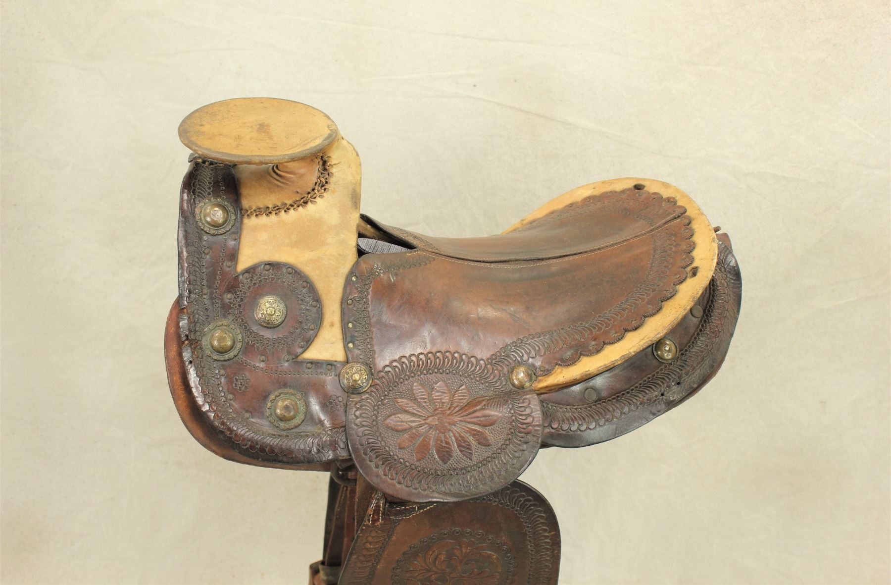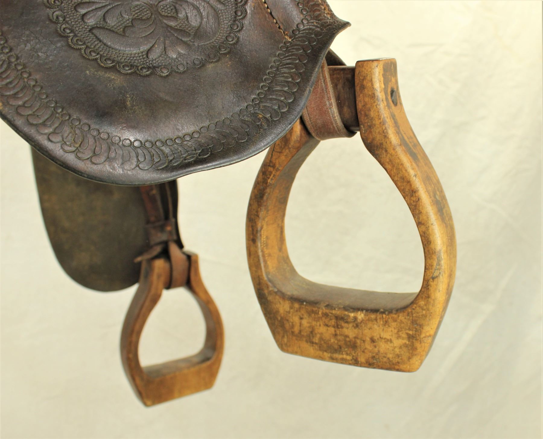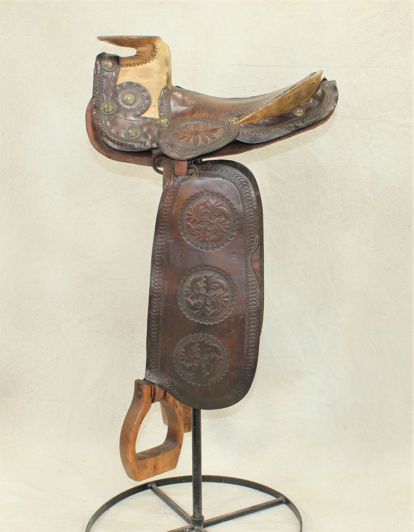 An extremely rare 1870's, maybe earlier, Hope style saddle, with a wonderful exposed rawhide design, large Texas flat-top style horn, incredible embossed leather pattern, accented by decorative brass studs and amazing wooden oxbow stirrups. In excellent condition with a couple minor repairs.