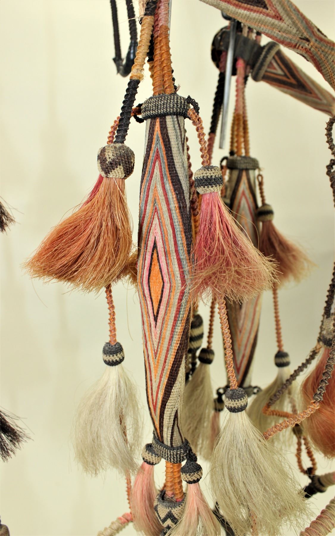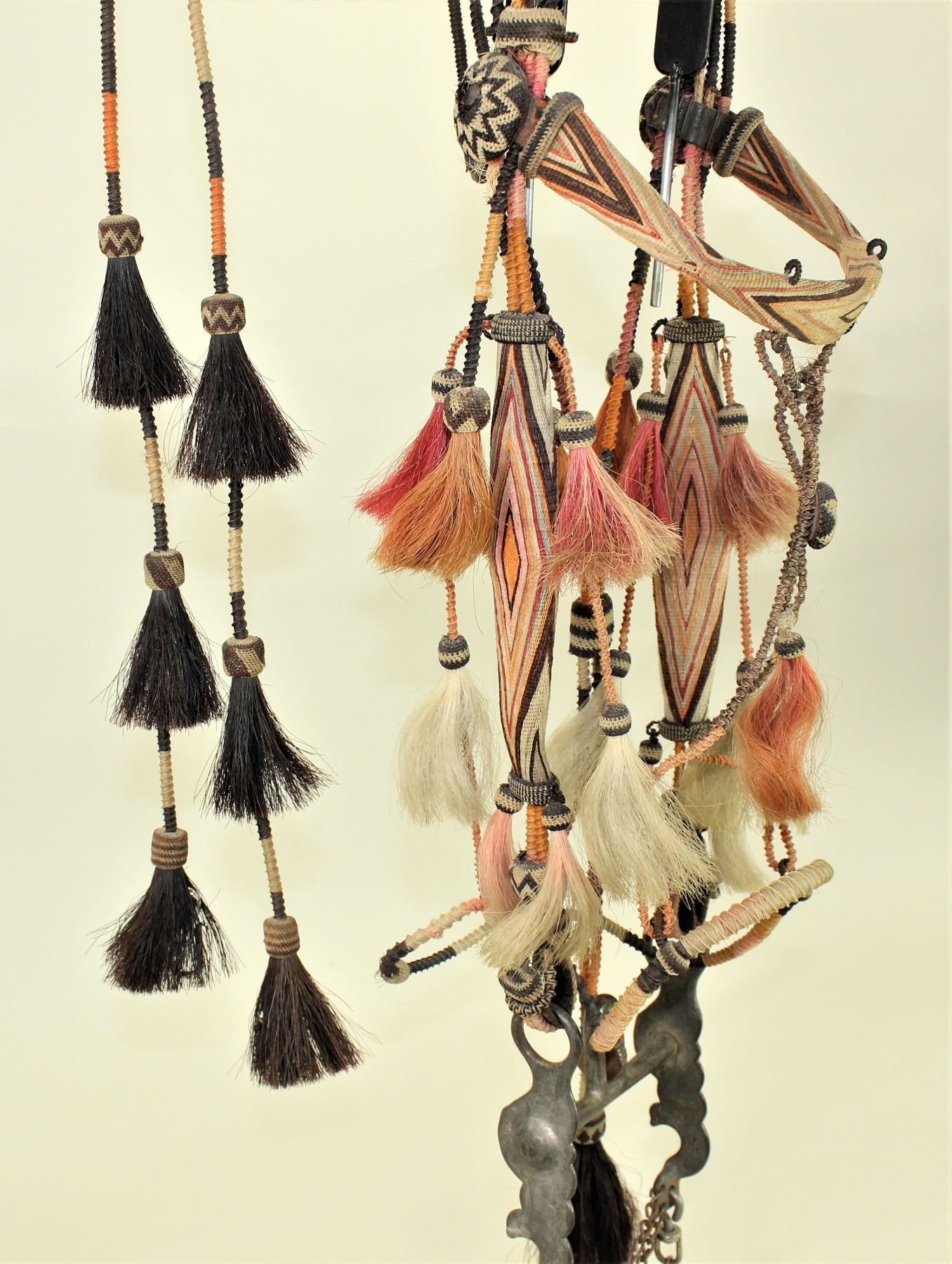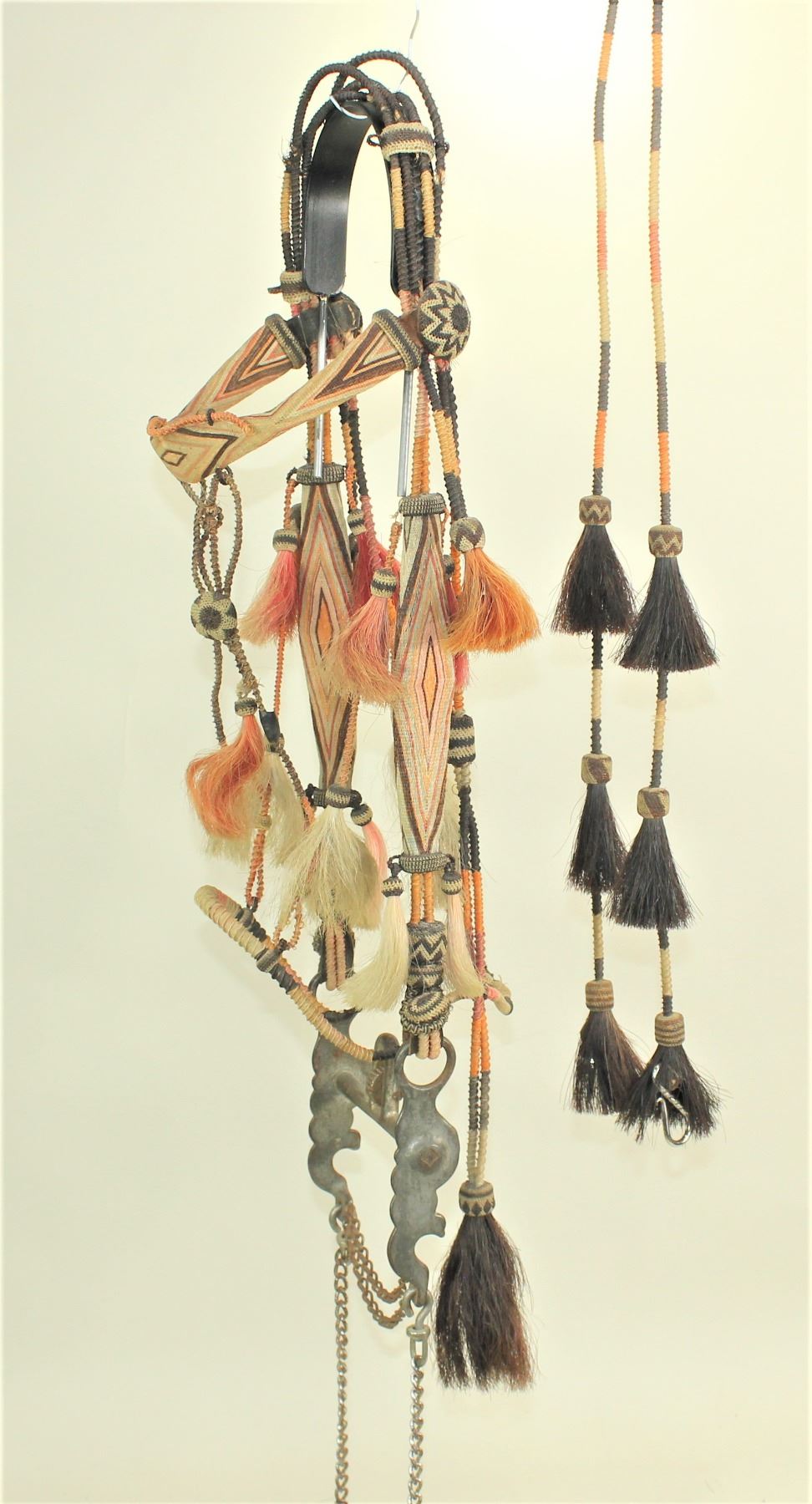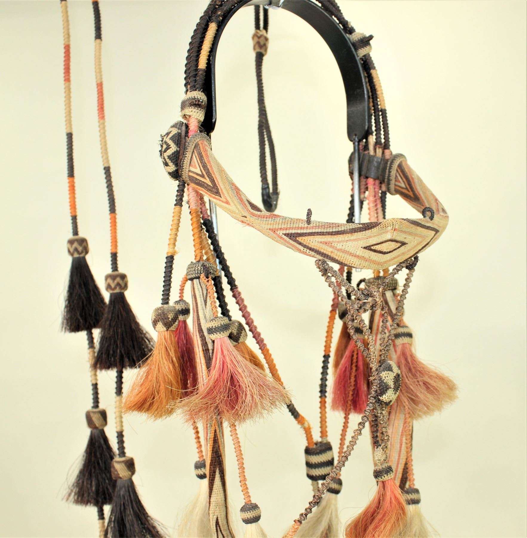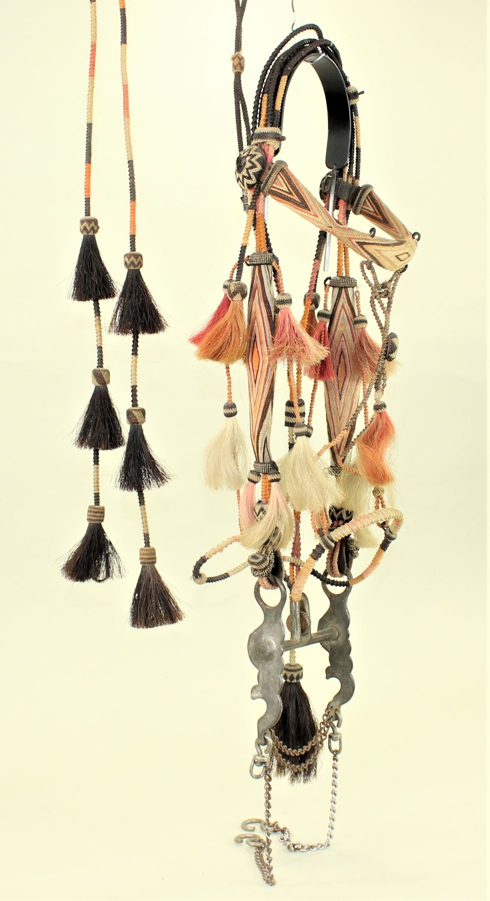 A magnificent 7 colored Yuma, Arizona Penitentiary bridle, very uniquely done with wide geometrically hitched horsehair browband and cheeks, incorporated with a rolled horsehair bosal style noseband and romel enclosed reins, while adorned with 16 decorative tassels, dome hitched rosettes, and original iron Buerman dove bit..