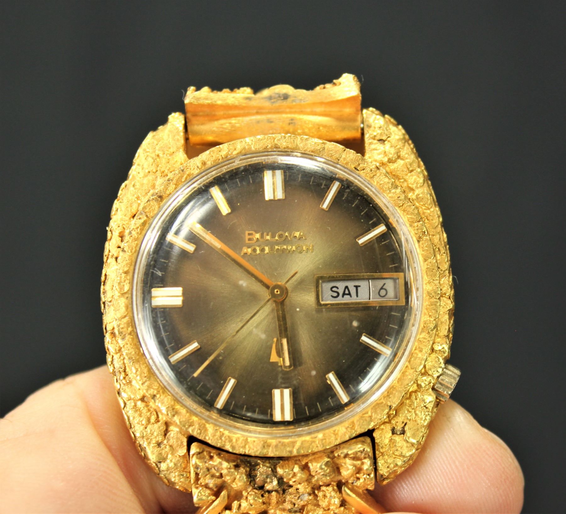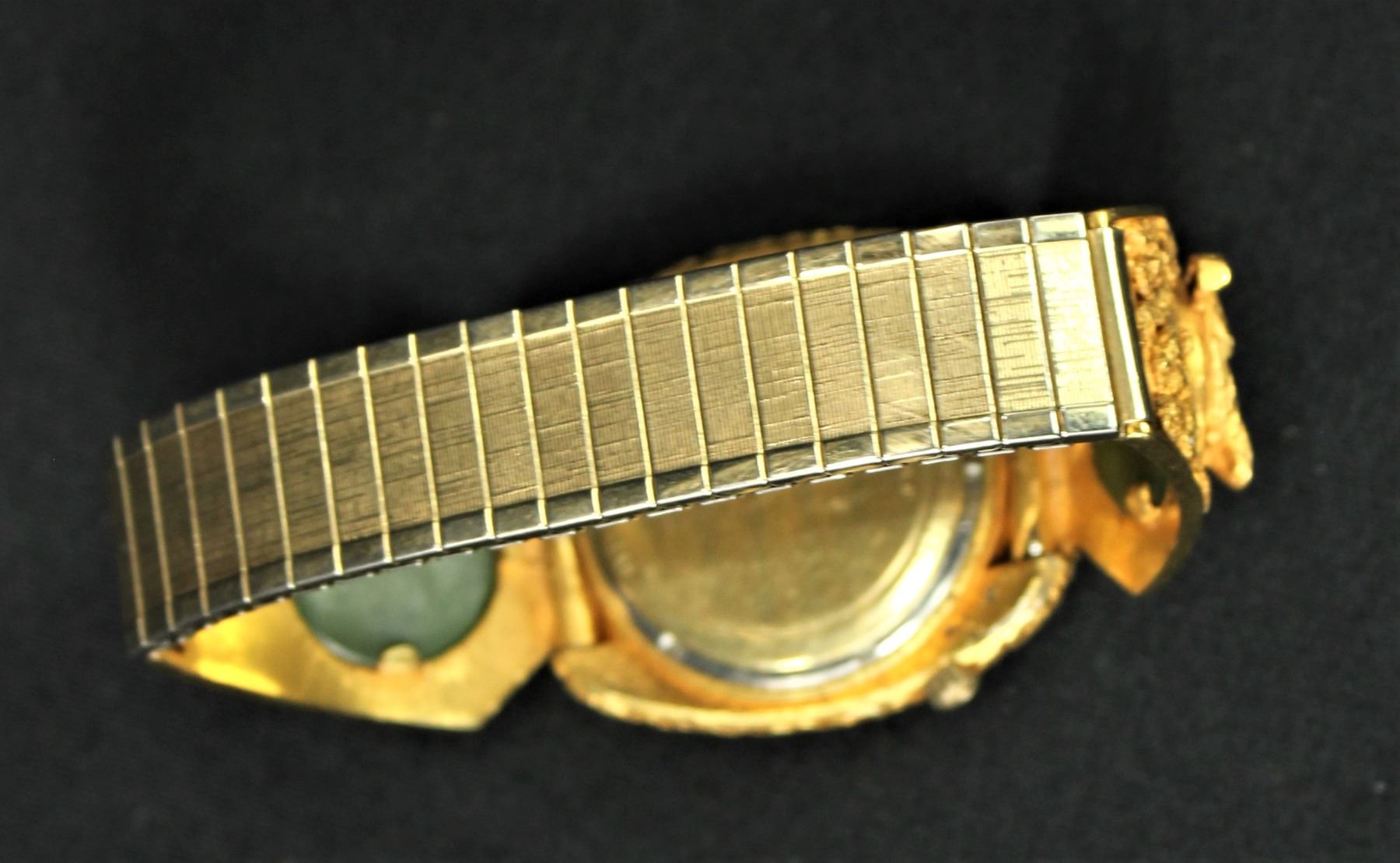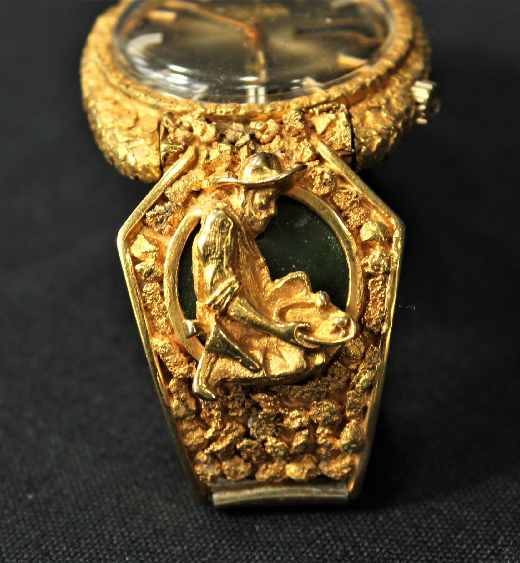 Fabulous custom Bulova Accutron wrist watch with gold plated expanding spiral band and case mounted with Alaskan gold nuggets, accented by 3-dimensional gold miner's figures on each side mounted on Alaskan Jade plaques. Of special note, this watch was owned by Bill Anderson, owner of the Ponderosa Ranch through the Bonanza western film years. It was made for Bill while on a hunting trip in Alaska.