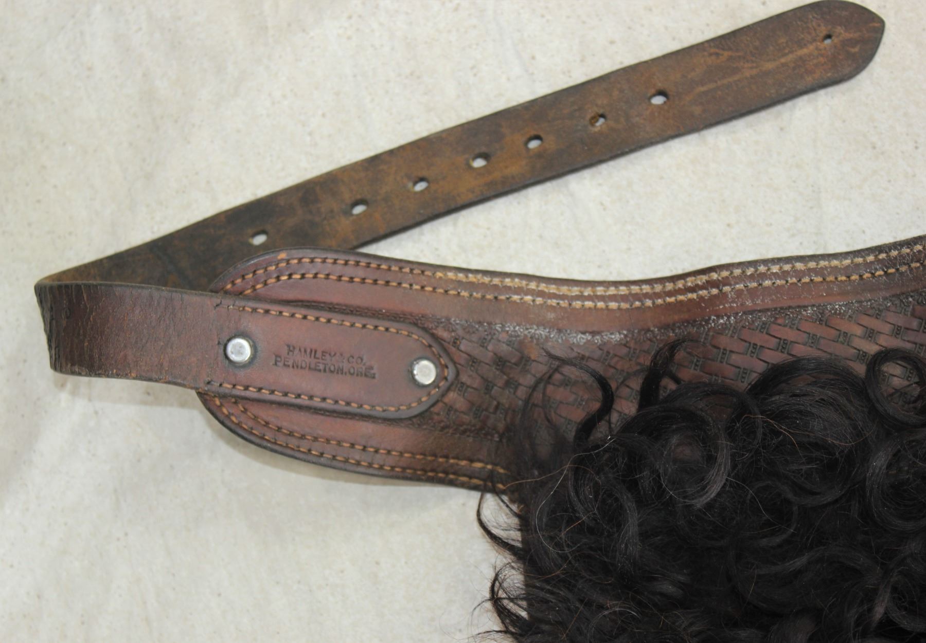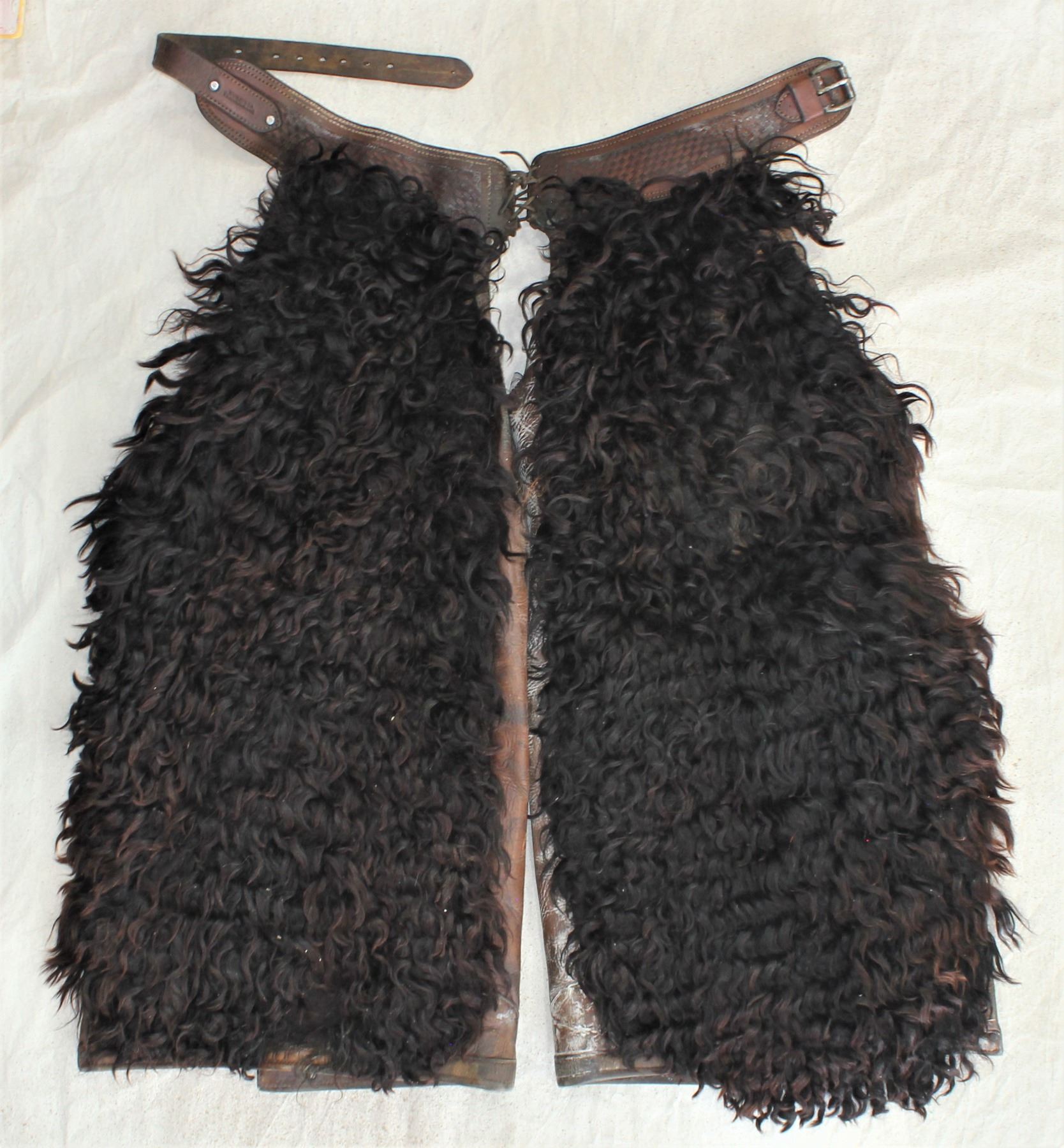 A bold pair of richly colored black angora batwing chaps with thick twisted hair, large pair of chaps with massive batwings, basket stamped belt and well marked Hamley & Co. belt. Showing use but in nice condition.