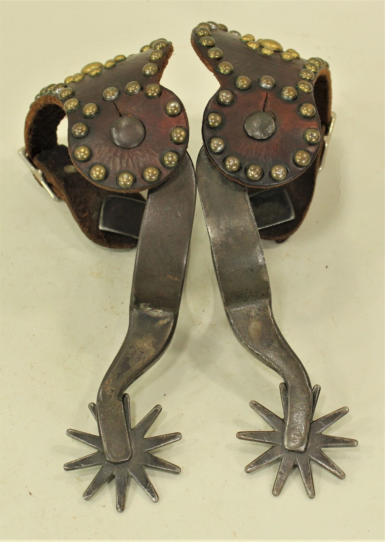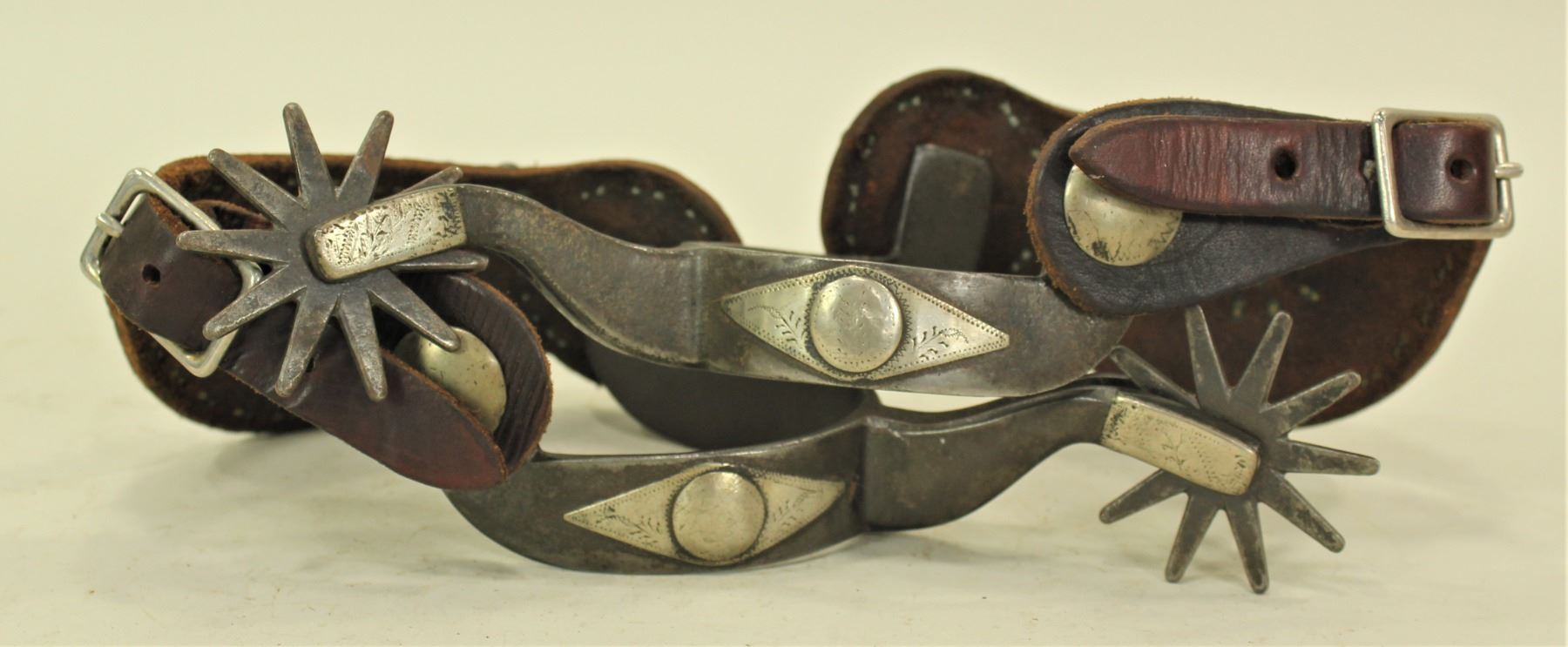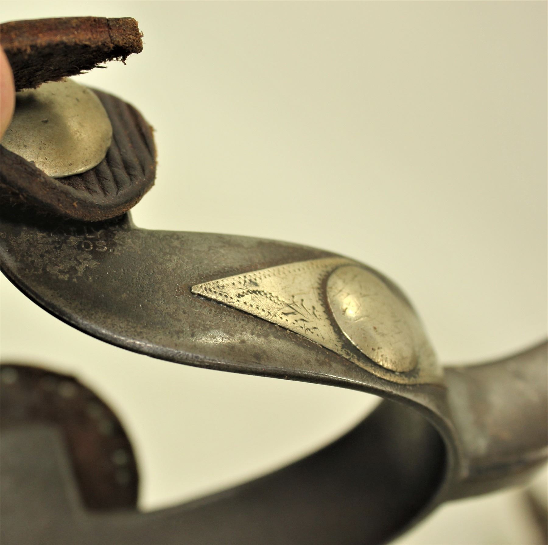 An interesting pair of single mounted spurs with extra fine engraving and a great profile, with nice maker's marks and period straps.