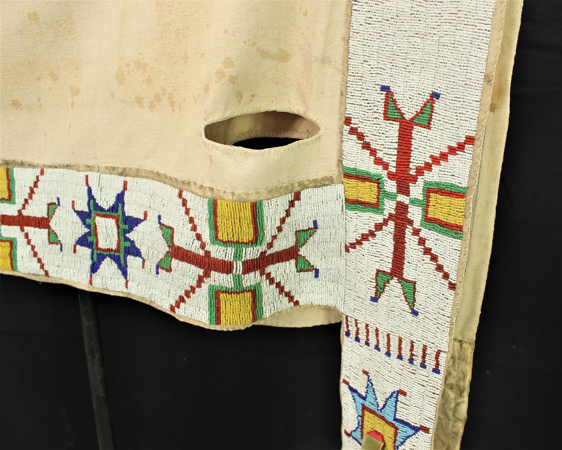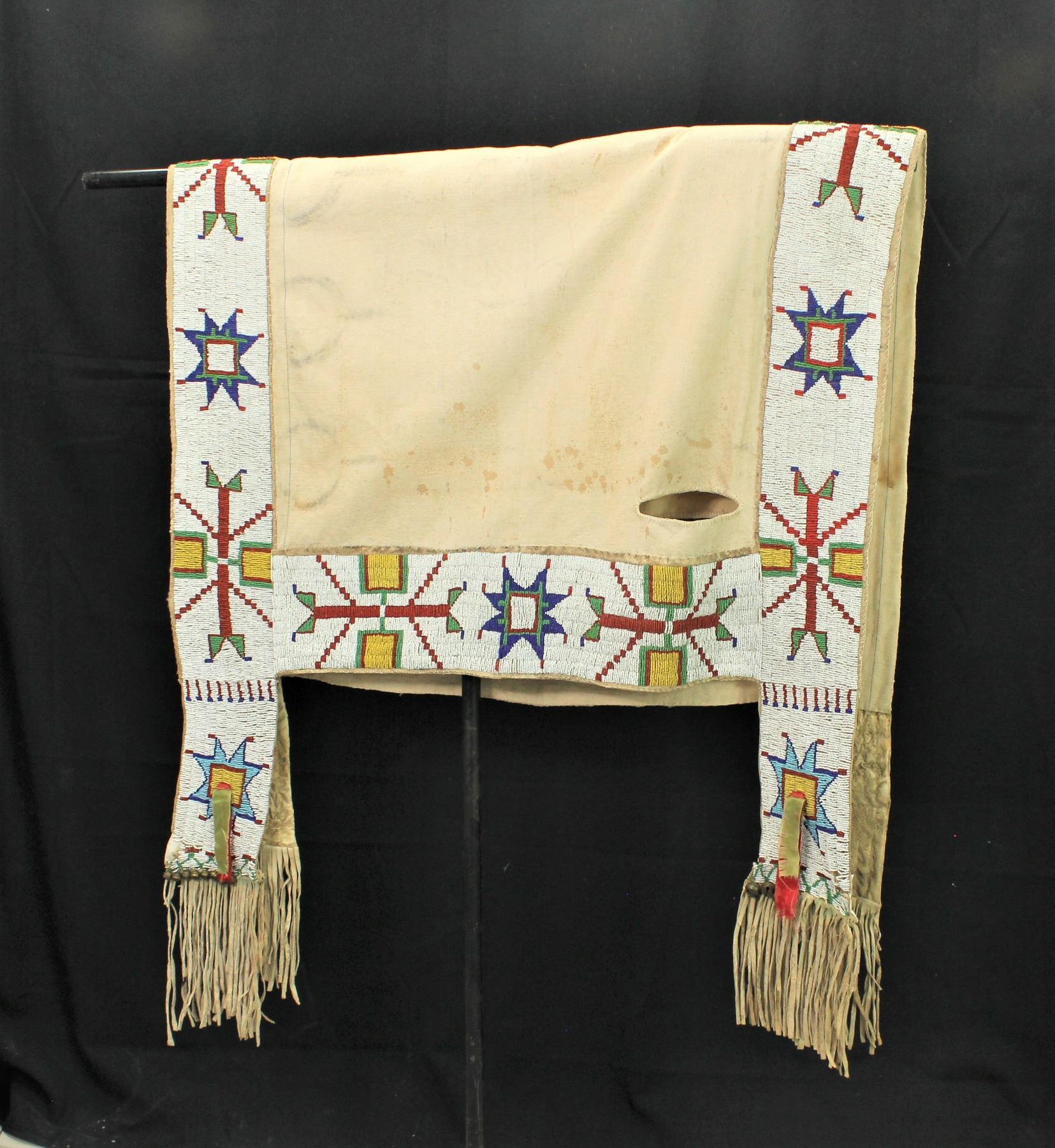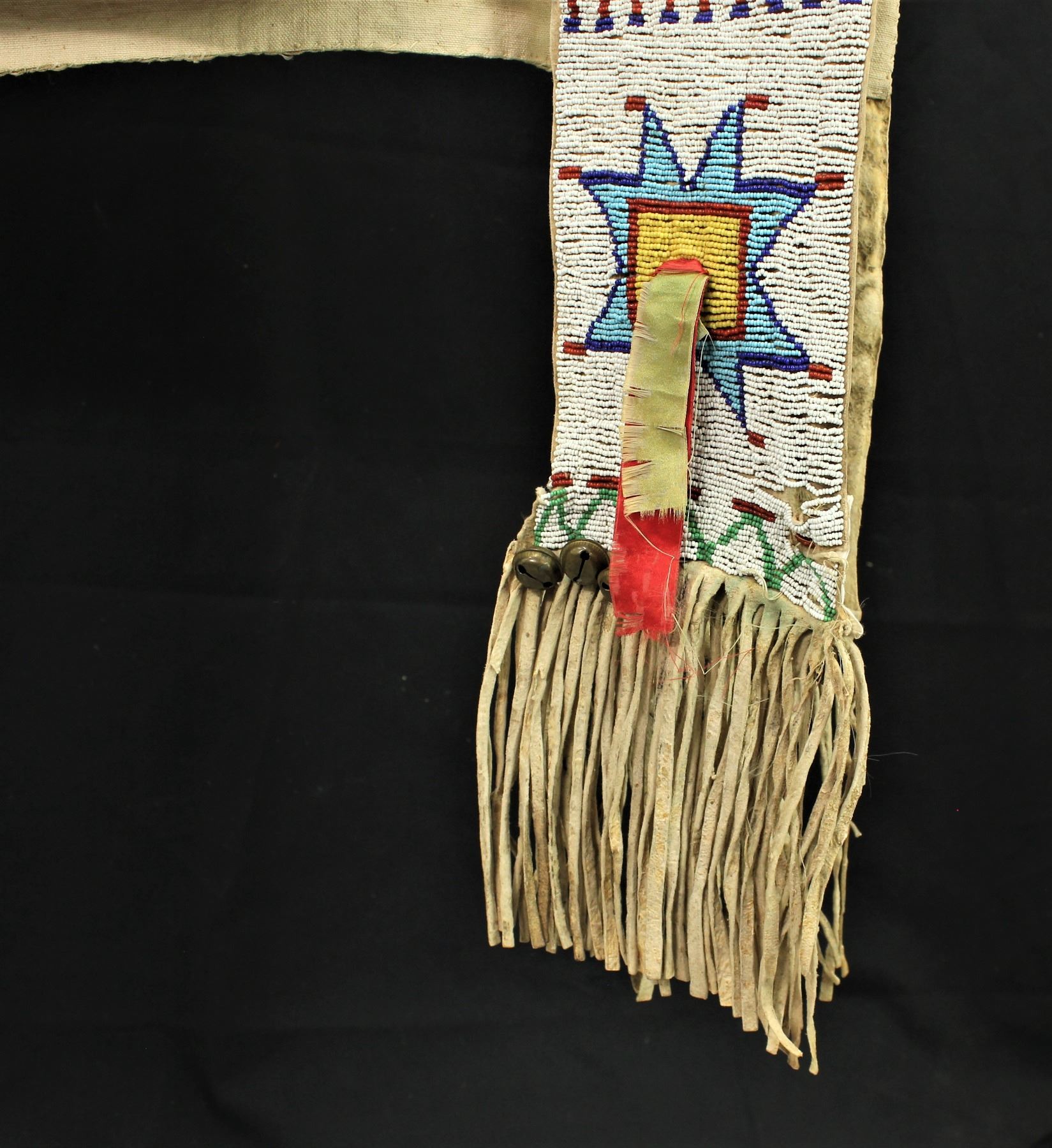 A very attractive large beaded saddle blanket with the full perimeter beaded using an uncommon mixture of colors on a white background, accented by fringed ends, ribbons and hawk bells, all on canvas, and in very good condition. Measuring 33 1/2"x 80" full length.