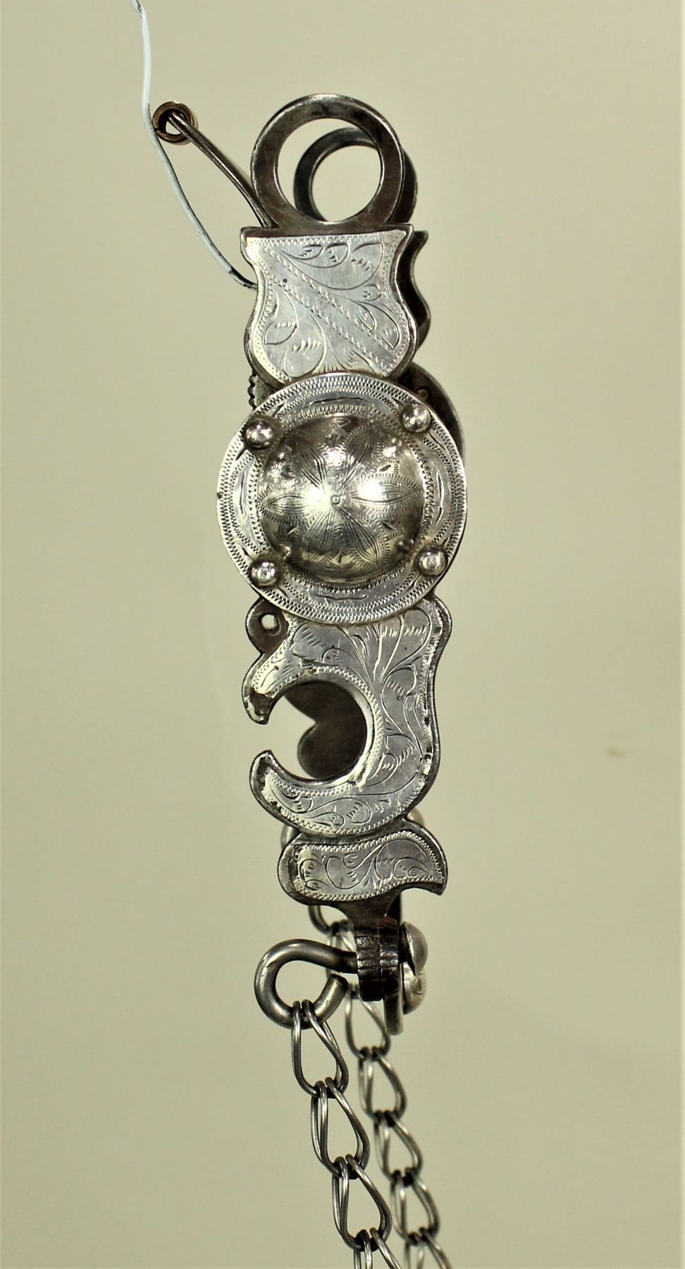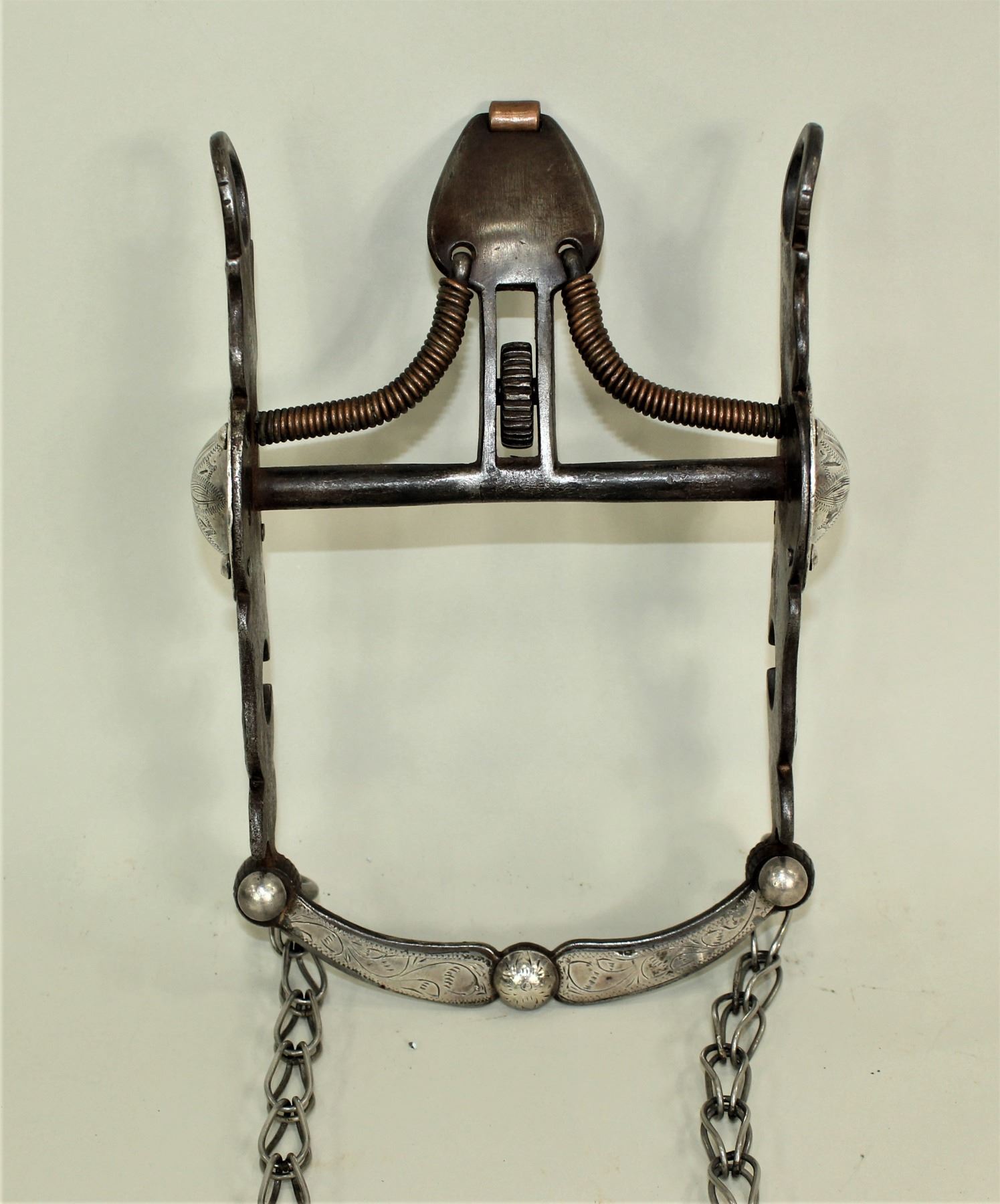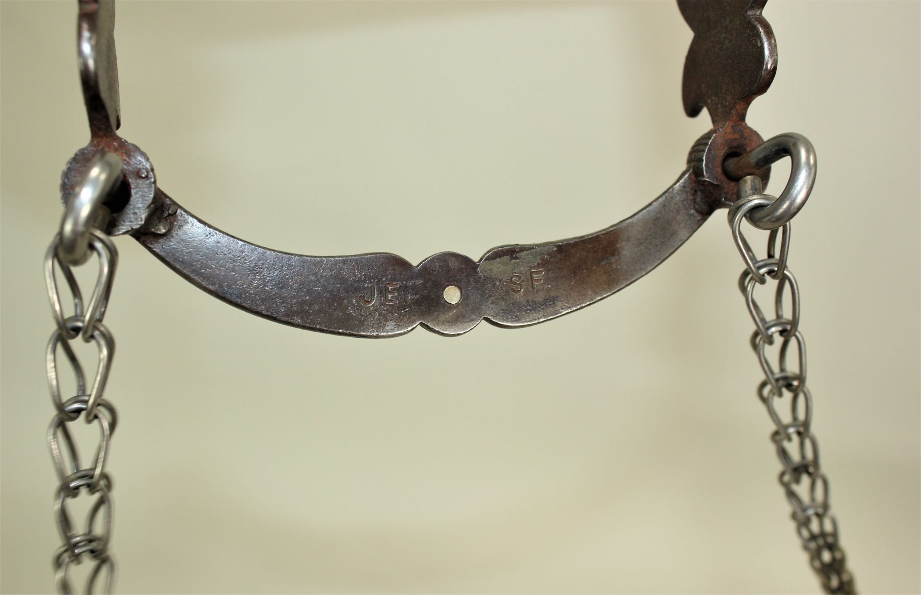 Impressive early kissing bird spade bit with great mouthpiece, and stylishly done silver inlay. Well marked on the back of lip bar "JE SF". Showing very nice condition.