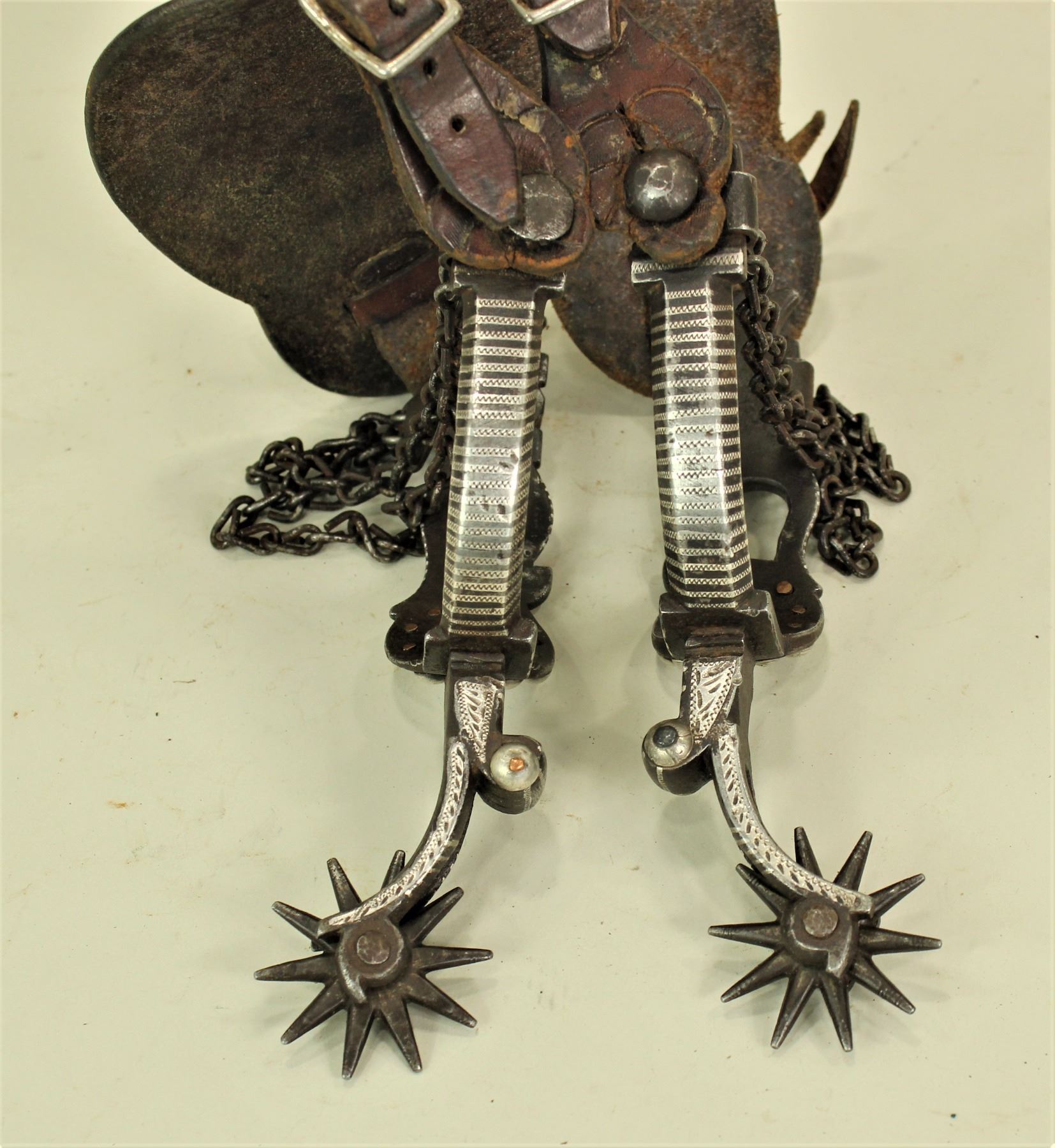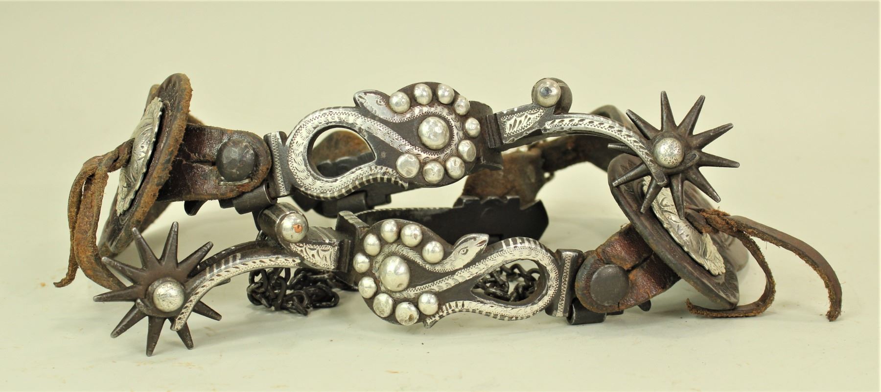An incredible pair of large double mounted spurs with an interesting inlaid snake motif surrounded with domes, wonderful elongated shanks, feathered rowels and original straps.