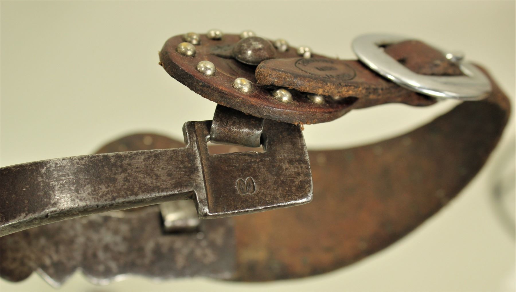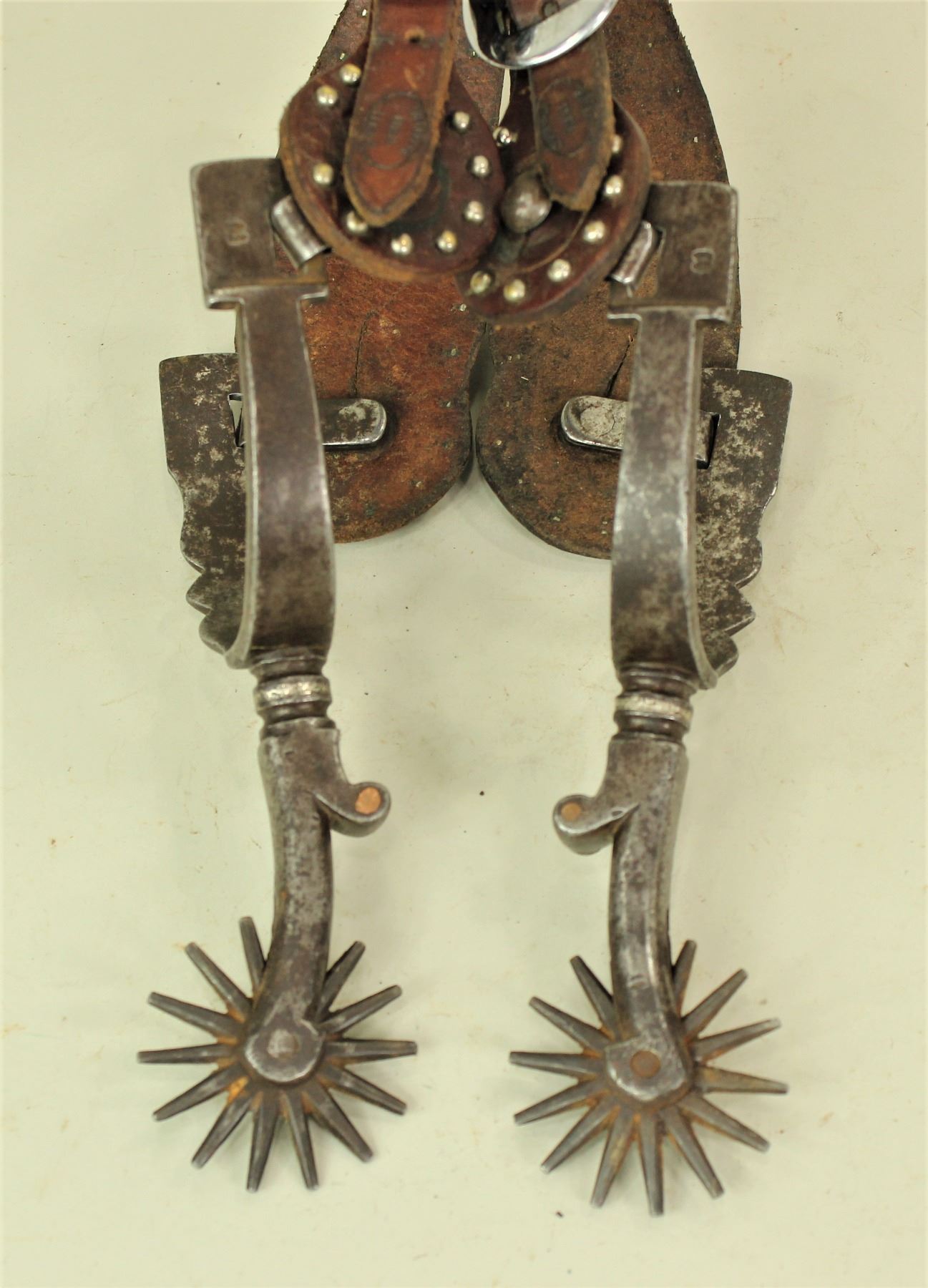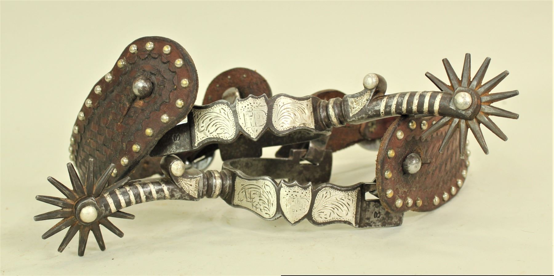 A pair of single inlaid spurs with the very desirable shield pattern on scalloped heelbands, extra long candy striped shanks and large rowels. Completed by great squash "M" marks and original studded straps.
