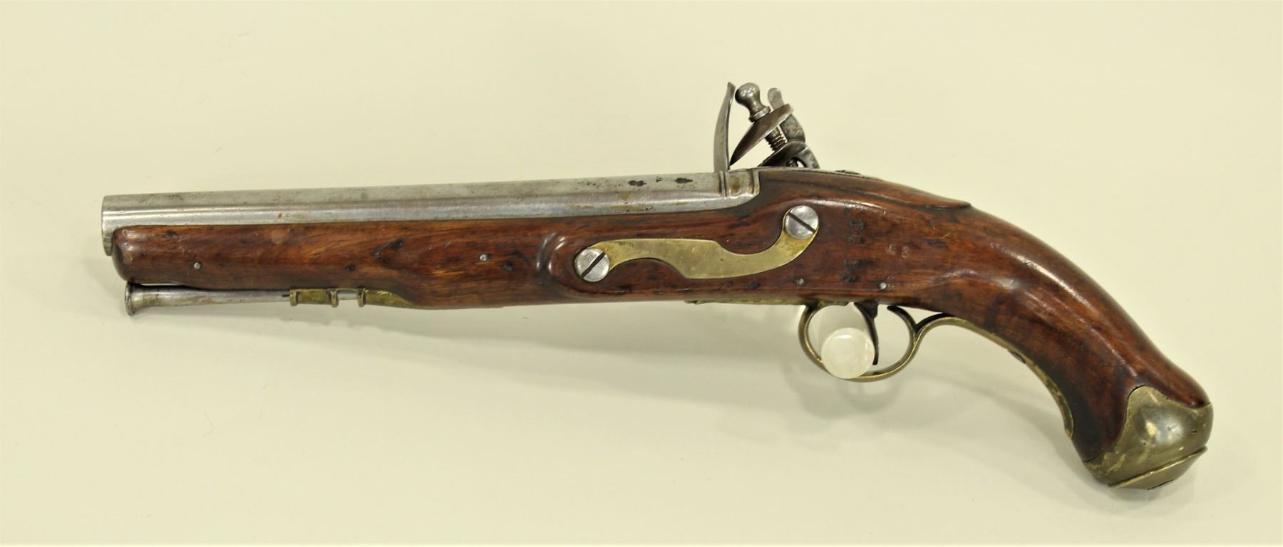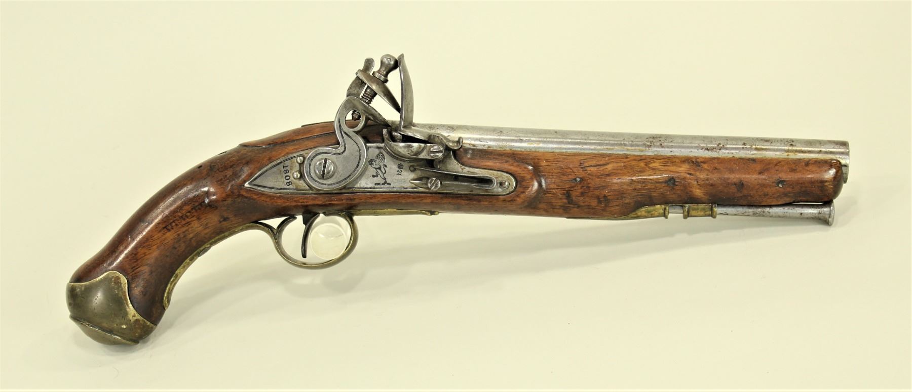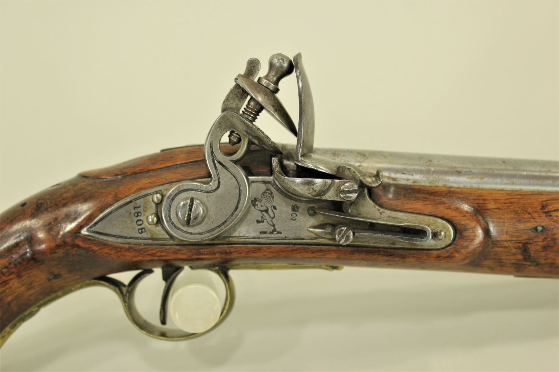 .65 caliber smoothbore flintlock pistol with 1808 dated flatlock pattern flintlock with East Indian Lion dated lock. Round bright barrel with full length wood stock with brass furniture. Stock marked “WRICHT” on right side of grip.