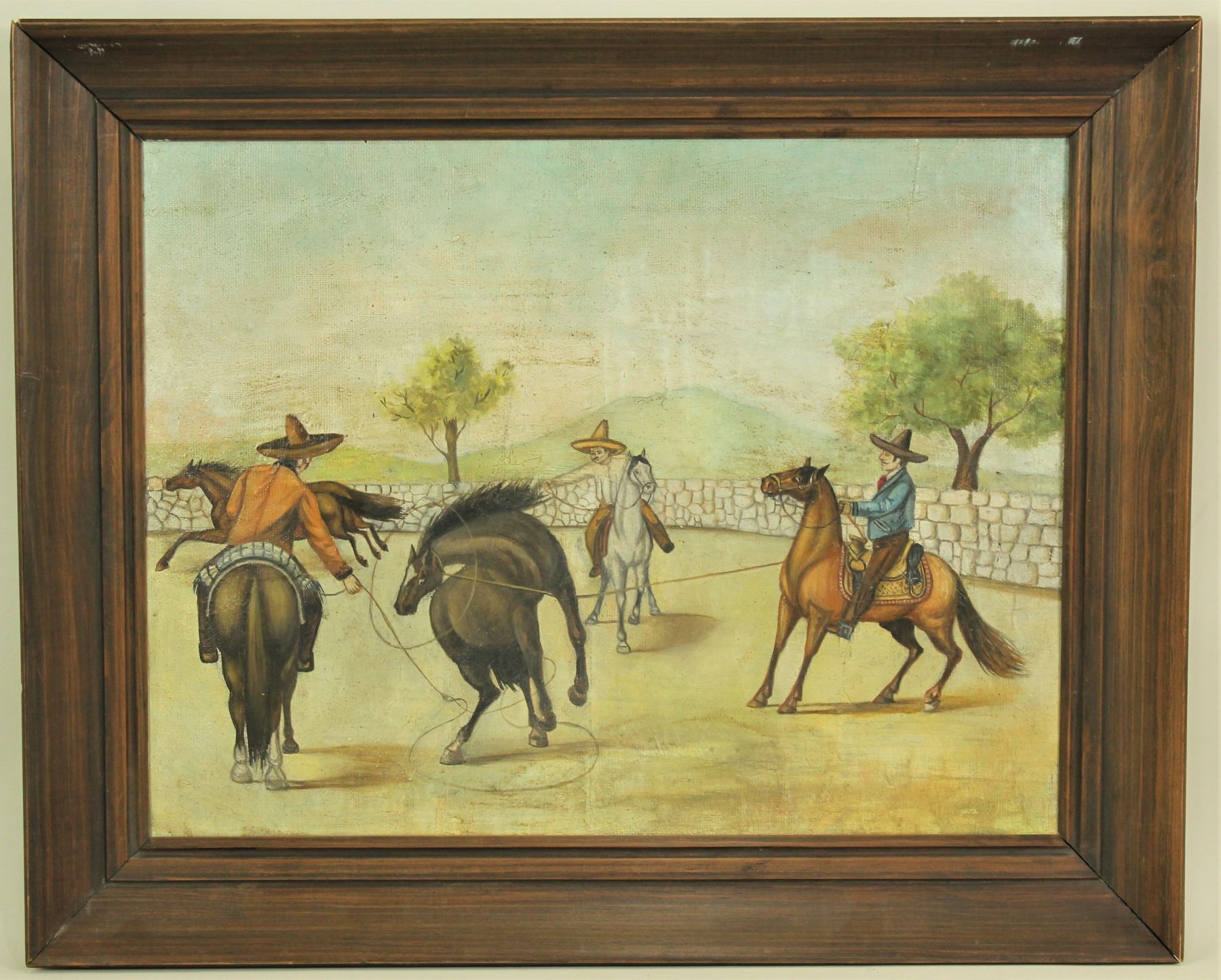 A wonderful old oil on canvas with early California Vaquero scene, professionally framed with image measuring 18"x 14".