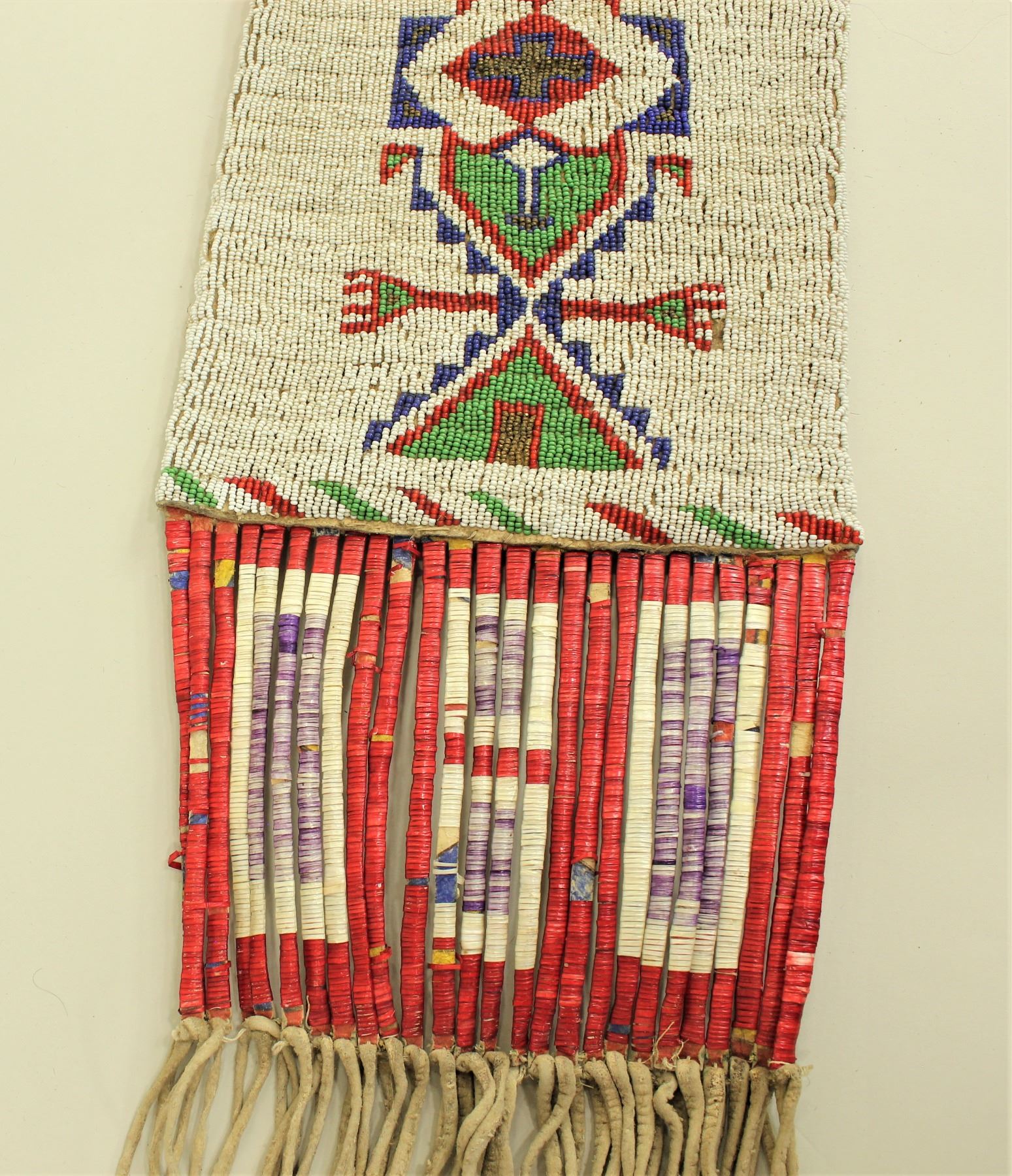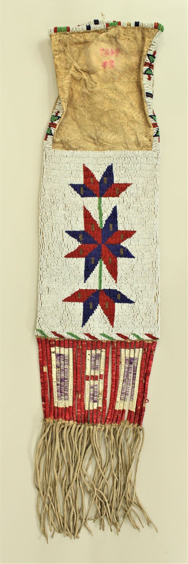 A bold 1890's oversized Sioux pipe bag with extra large beaded panels that display uncommon figural bead design using early green, red, and blue, highlighted by long brightly colored quilled fringe. In very nice condition with dimensions of 7 1/2"x 33".